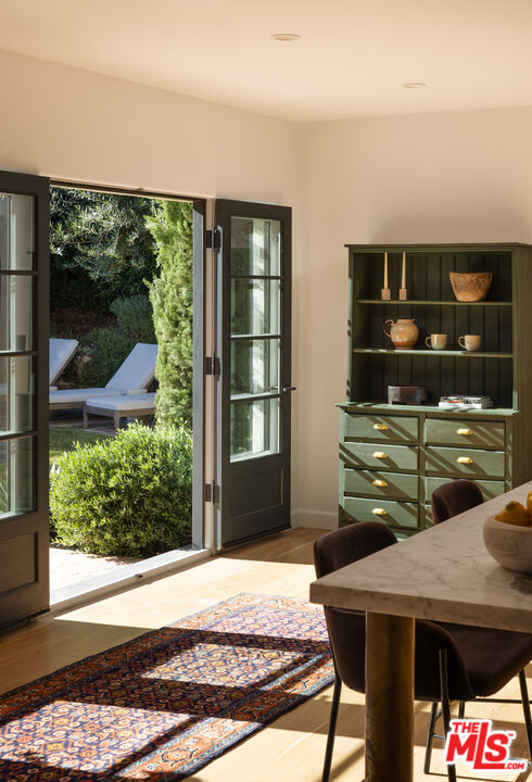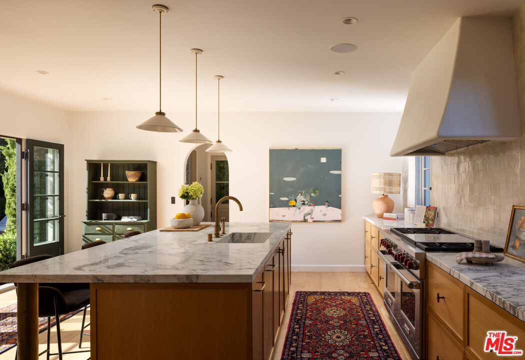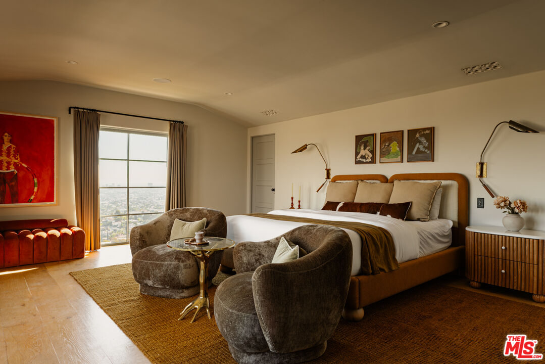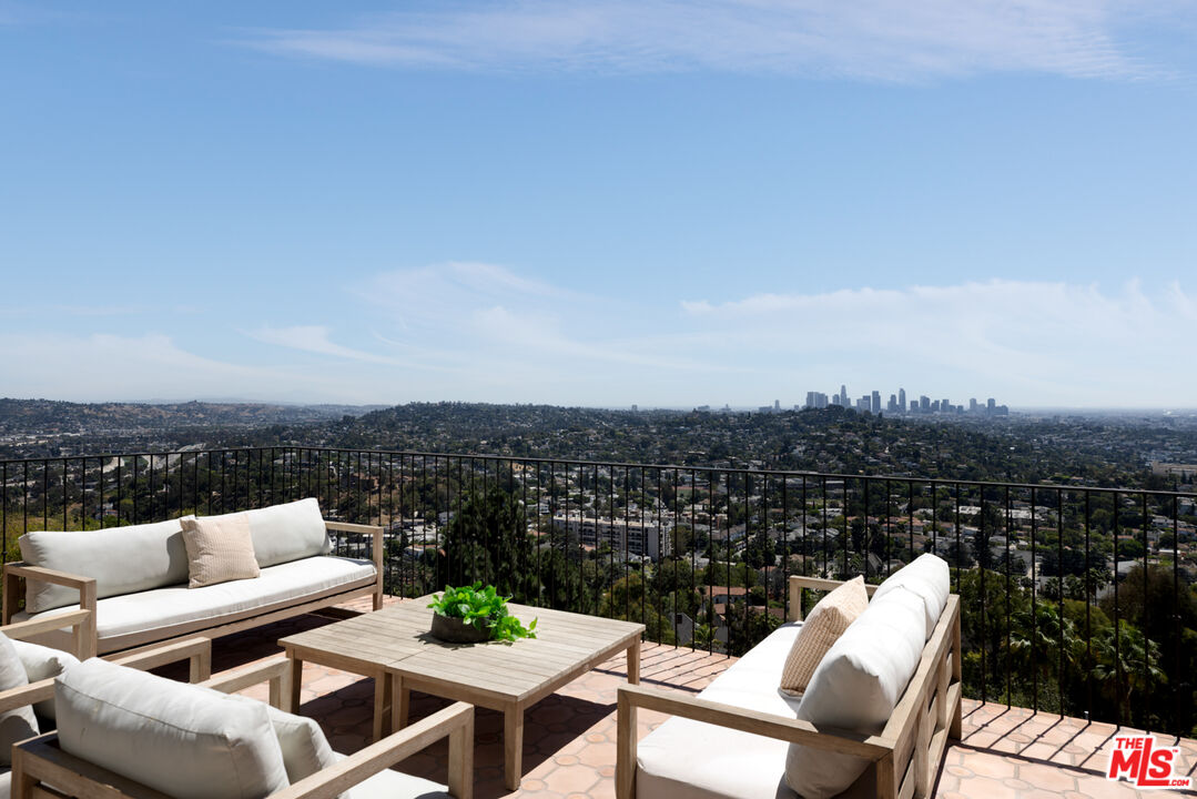 Perched in the hills of Los Feliz on a quiet cul-de-sac, Casa Vista is a reimagined 1928 Spanish Colonial that seamlessly fuses timeless architecture with sophisticated modern design and panoramic city views. A private compound situated behind solid gates - the home was rebuilt from the studs with all-new systems, high-end finishes, and meticulous attention to detail. Casa Vista exudes the romance of Old Hollywood with the ease of contemporary living. A formal entry opens to the main level, where a 13-foot ceiling living room with rebuilt fireplace and arched windows perfectly frame a view of downtown LA. The kitchen was completely redesigned during the renovation and features marble slab countertops with integrated sinks, custom European oak cabinetry, a 60" Wolf range, dual Miele dishwashers, a wine fridge, and a hidden coffee station. Upstairs, the primary suite captures sweeping skyline views and features a pitched ceiling, spa-inspired bath with a concrete soaking tub framed by an arched window, and generous custom closets. Additional bedrooms showcase Moroccan Zellij tilework, bespoke hardware, and thoughtfully designed finishes that pay homage to Hollywood's golden age of architecture. A central courtyard frames the residence with a newly rebuilt zero-edge pool and Baja shelf, surrounded by multiple terraces designed for lounging and dining. Outdoor amenities include a built-in BBQ, gas firepit, and lush landscaping with mature olive trees, Canary Island palms, and terracotta planters. The side garden features a tranquil fountain, while curated lighting and ficus hedging create privacy and ambiance throughout. Blending historic charm with modern elegance, this residence captures the very essence of California living. With its timeless architecture, private setting, and sweeping city-to-ocean vistas, this Los Feliz masterpiece offers a rare balance of architectural integrity and effortless sophistication - crafted for those who appreciate design, history, and the art of living beautifully.