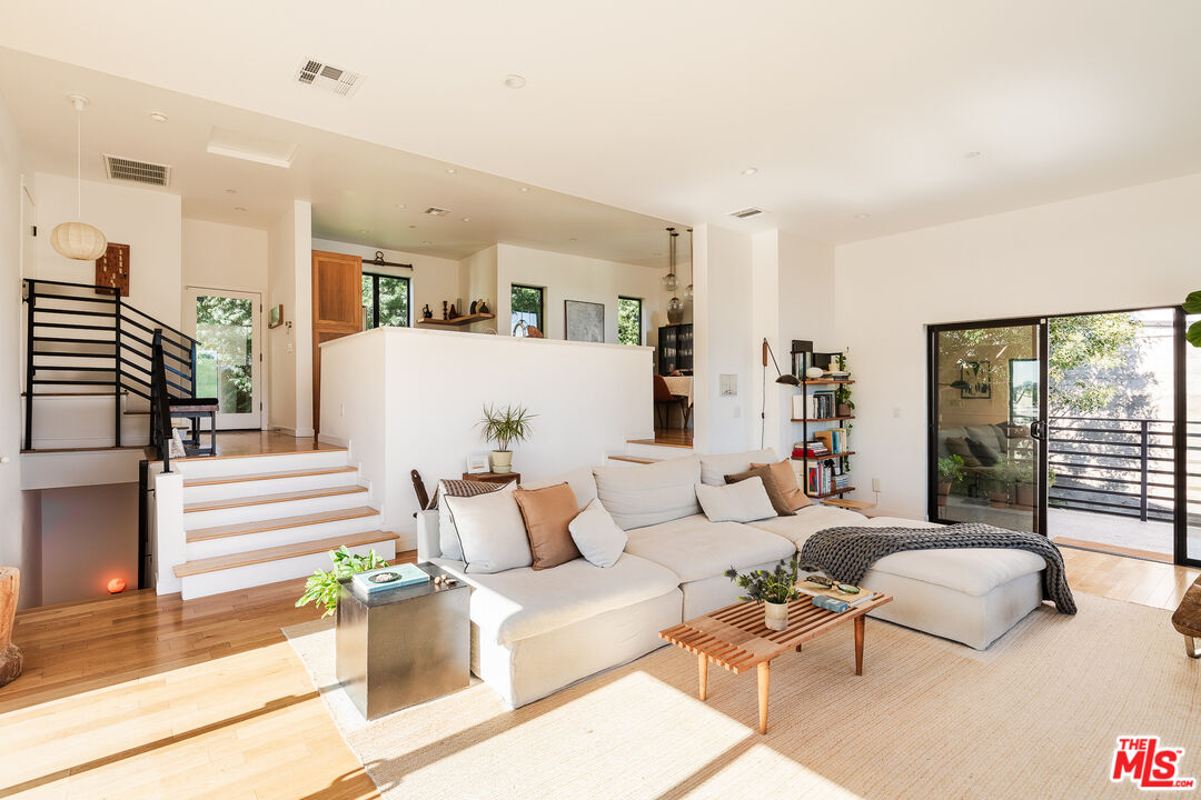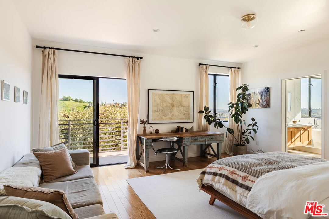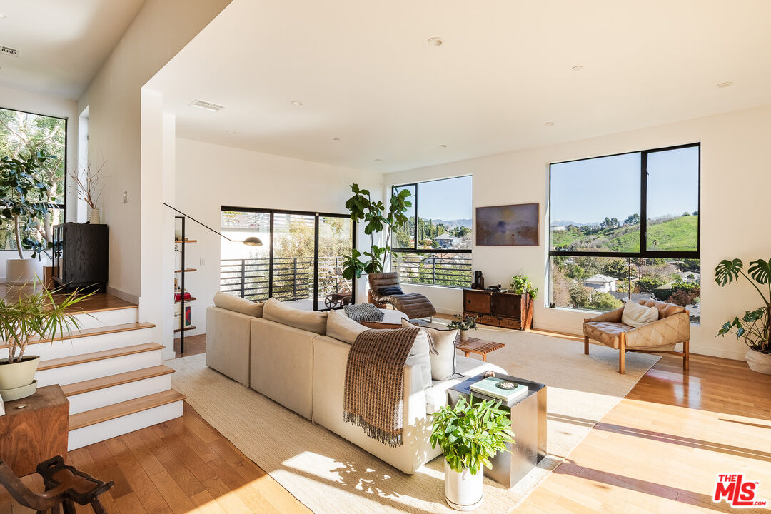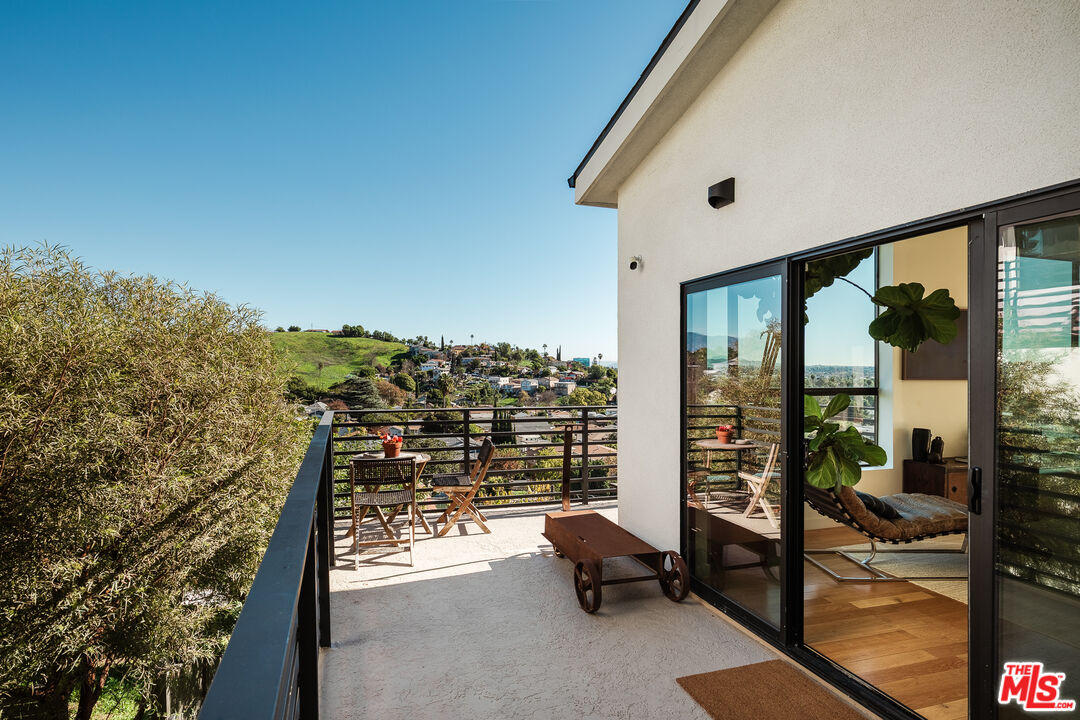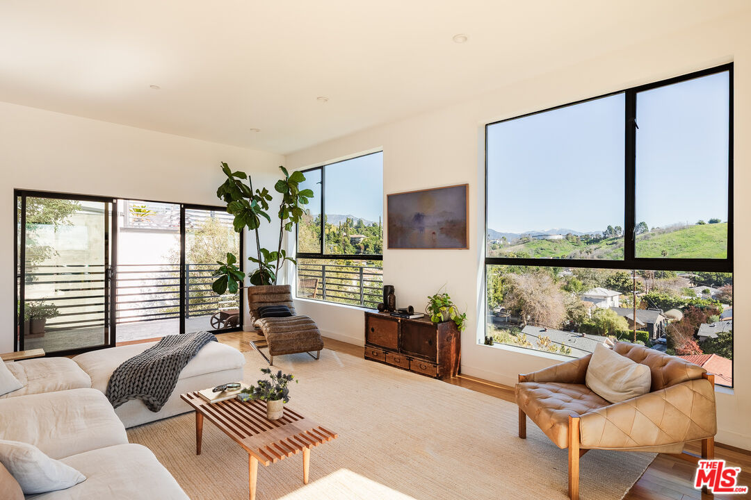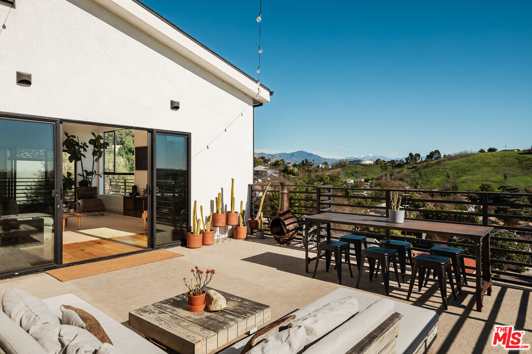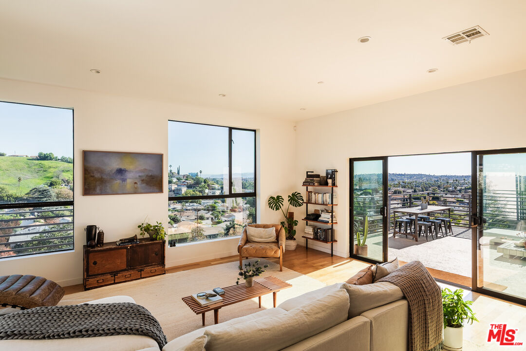 Tucked away in the peaceful hills of El Sereno, just minutes to Highland Park and South Pasadena, this vibrant, beautifully designed home feels like a sanctuary in the city. Built in 2020 with no expense spared, the spacious 4 bedroom / 3.5 bath property offers incredible privacy, stunning city and mountain views, and a floor plan that functions brilliantly for easy living and entertaining. Step inside to find light-filled spaces, soaring ceilings, and an abundance of large windows and sliding glass doors that lead to multiple outdoor spaces. The main level's open-concept kitchen, dining room, step-down living room and two terraces all look out to verdant hillsides, snow-capped mountains, and unobstructed city views. The sprawling main terrace offers an outdoor lounge and dining area, the perfect setting to host weekend brunches and dinner parties, do morning yoga, and enjoy spectacular sunrises and sunsets, all while looking out to expansive views. The impressive kitchen and adjoining dining room are equally inspiring spaces, with white oak floating shelves, and huge windows that perfectly frame mature trees and hedges. An entertainer's dream, the kitchen provides plenty of space for friends and family to gather, and features a lovely breakfast bar, ample countertop and cabinet space, and stainless steel appliances. Completing the home's main level are a serene powder room, and a finished 2-car garage with direct access that currently functions as a fitness/wellness room with a sauna, custom built-in storage cabinets, waterproof flooring, and a row of windows that provide Southern light. Downstairs are four well-appointed bedrooms, including a sumptuous primary bedroom with a huge walk-in closet, access to a wrap-around terrace, and a spa-like en-suite bathroom with a double vanity, soaking tub, and a shower with views. The three additional bedrooms are all generously sized, two of which feature sliding glass doors that open to the most magical covered patio and terrace, surrounded by an array of agaves, jade, and climbing foliage. Two impeccably designed guest bathrooms and a laundry closet conveniently located in the hallway outside the bedrooms complete this lower floor. The gently sloped yard, which is easily accessed by a beautiful staircase on one side of the home, offers the possibility for expansion, room for a pool, or the edible garden of your dreams. The property's lush landscaping includes lovely native plantings, a black walnut tree, African sumac trees, and a Meyer lemon tree. This incredibly special home offers a total sense of tranquility, as well as the convenience of being in close proximity to the best of Northeast LA's shops, restaurants, and markets, hiking at nearby Elephant Hill (which can be accessed from Jennings Drive, just up the street from the home), and Debs Park, and easy access to major freeways and Downtown LA. This is LA living at its best.
