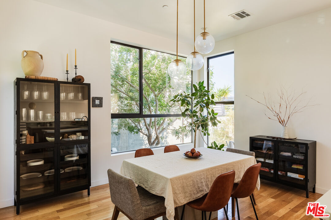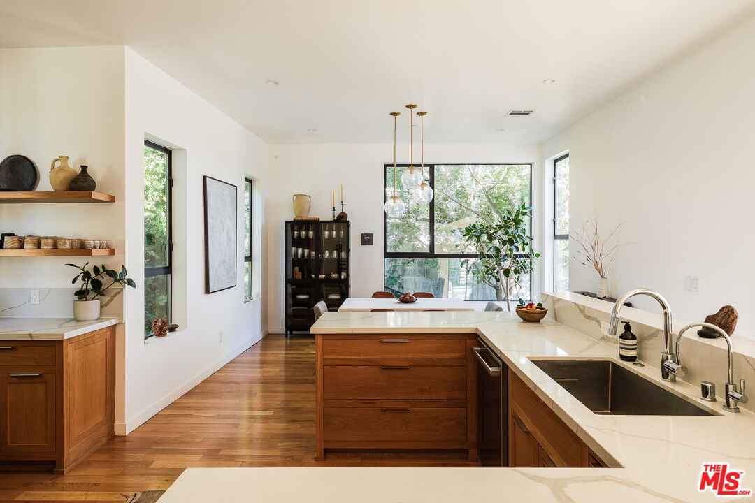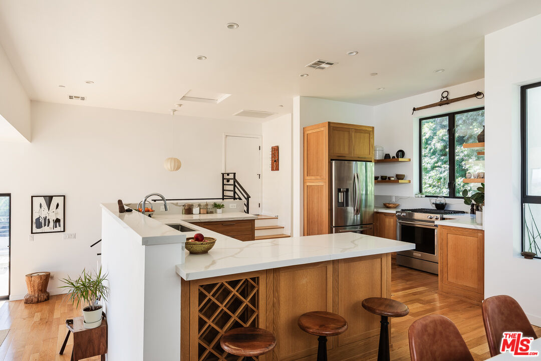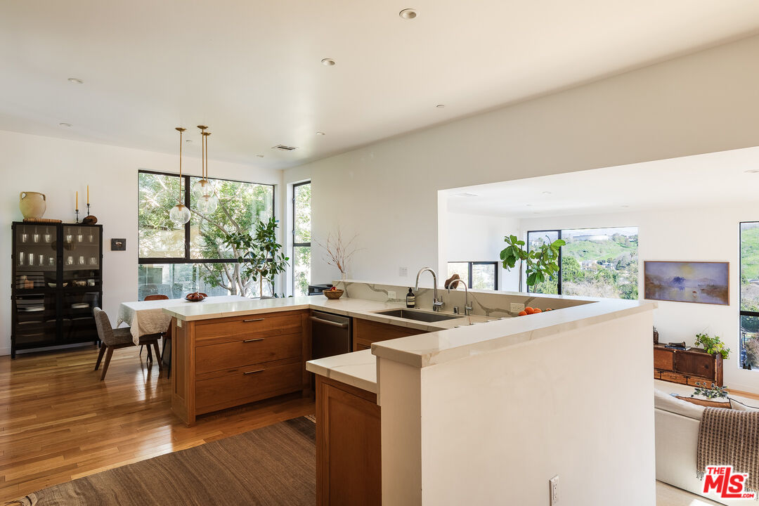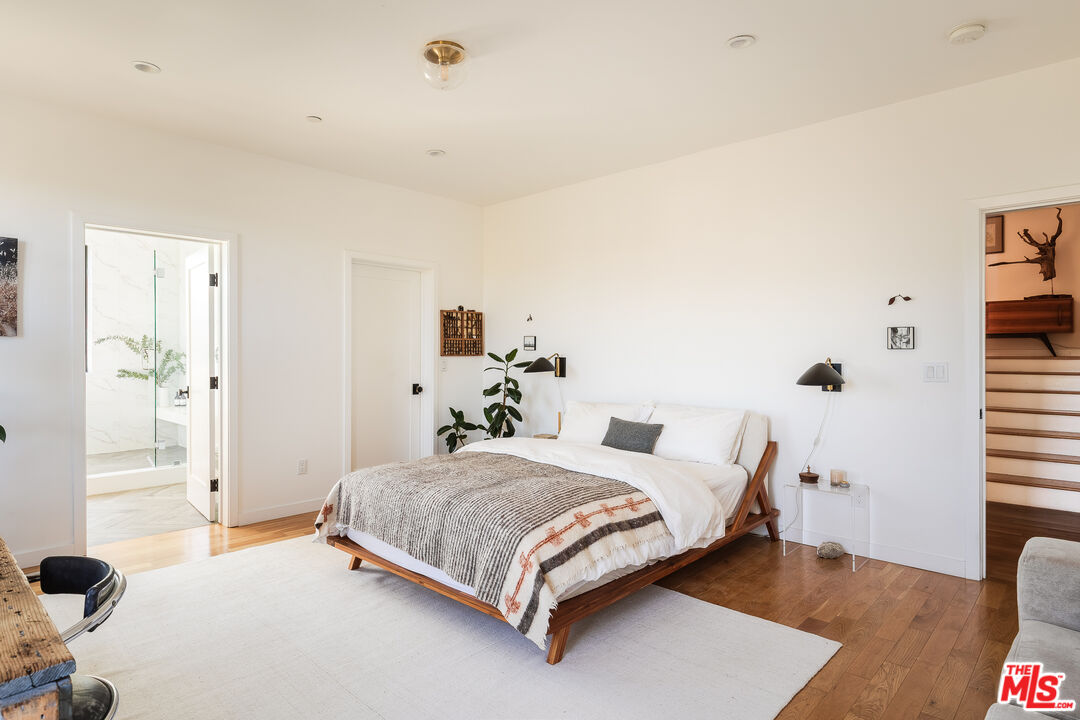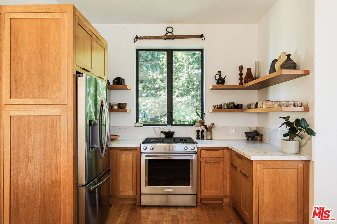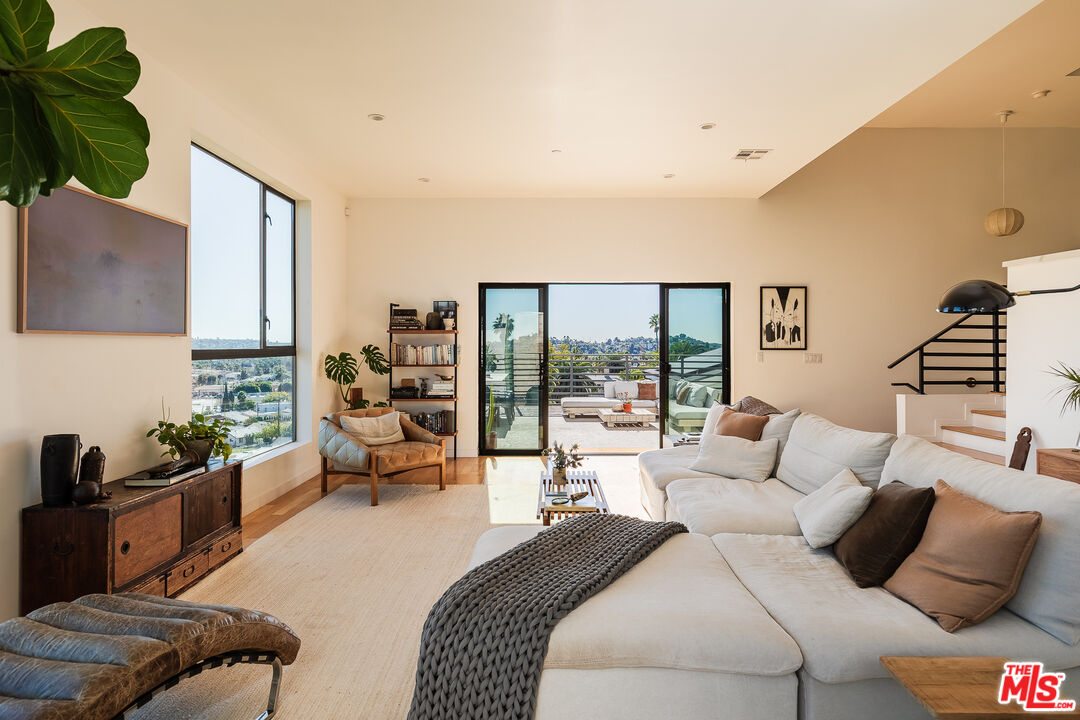 Tucked away in the peaceful hills of El Sereno, just minutes to Highland Park and South Pasadena, this vibrant, beautifully designed home feels like a sanctuary in the city. Built in 2020 with no expense spared, the spacious 4 bedroom / 3.5 bath property offers incredible privacy, stunning city and mountain views, and a floor plan that functions brilliantly for easy living and entertaining. Step inside to find light-filled spaces, soaring ceilings, and an abundance of large windows and sliding glass doors that lead to multiple outdoor spaces. The main level's open-concept kitchen, dining room, step-down living room and two terraces all look out to verdant hillsides, snow-capped mountains, and unobstructed city views. The sprawling main terrace offers an outdoor lounge and dining area, the perfect setting to host weekend brunches and dinner parties, do morning yoga, and enjoy spectacular sunrises and sunsets, all while looking out to expansive views. The impressive kitchen and adjoining dining room are equally inspiring spaces, with white oak floating shelves, and huge windows that perfectly frame mature trees and hedges. An entertainer's dream, the kitchen provides plenty of space for friends and family to gather, and features a lovely breakfast bar, ample countertop and cabinet space, and stainless steel appliances. Completing the home's main level are a serene powder room, and a finished 2-car garage with direct access that currently functions as a fitness/wellness room with a sauna, custom built-in storage cabinets, waterproof flooring, and a row of windows that provide Southern light. Downstairs are four well-appointed bedrooms, including a sumptuous primary bedroom with a huge walk-in closet, access to a wrap-around terrace, and a spa-like en-suite bathroom with a double vanity, soaking tub, and a shower with views. The three additional bedrooms are all generously sized, two of which feature sliding glass doors that open to the most magical covered patio and terrace, surrounded by an array of agaves, jade, and climbing foliage. Two impeccably designed guest bathrooms and a laundry closet conveniently located in the hallway outside the bedrooms complete this lower floor. The gently sloped yard, which is easily accessed by a beautiful staircase on one side of the home, offers the possibility for expansion, room for a pool, or the edible garden of your dreams. The property's lush landscaping includes lovely native plantings, a black walnut tree, African sumac trees, and a Meyer lemon tree. This incredibly special home offers a total sense of tranquility, as well as the convenience of being in close proximity to the best of Northeast LA's shops, restaurants, and markets, hiking at nearby Elephant Hill (which can be accessed from Jennings Drive, just up the street from the home), and Debs Park, and easy access to major freeways and Downtown LA. This is LA living at its best.