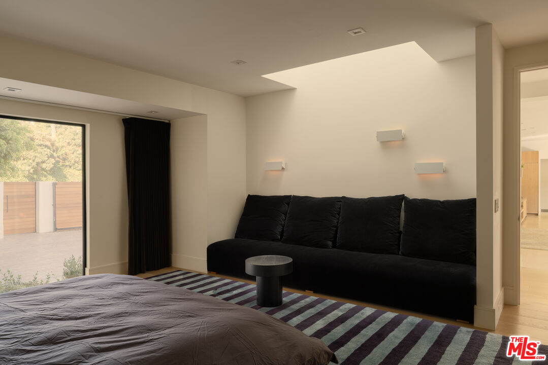 Located in the most prime section of Beverly Hills behind private gates on over half an acre of flat, fully usable land, this single-story contemporary residence blends architectural character with warm, livable design. Soaring 12-foot ceilings and skylights throughout create an open, sunlit flow from the kitchen to the family room, anchored by a wet bar and floor-to-ceiling pocket doors that open seamlessly to the grounds. The home's four bedrooms include a dramatic primary suite with retractable glass walls overlooking the pool and lush landscaping cultivating an effortless indoor-outdoor connection that defines the California lifestyle. The pool and spa serve as the centerpiece of the outdoor living space, offering a tranquil backdrop for daytime lounging and evening gatherings. Designed for both everyday living and entertaining, the home features a professional movie theater with stadium seating, a custom bar, and multiple outdoor gathering areas framed by mature trees for total privacy. Additional highlights include a 3-car garage, ample guest parking, and an exterior carport for security. At twilight, the property glows with its modern lines and layered landscape lighting creating a resort-like ambiance in the heart of Beverly Hills.