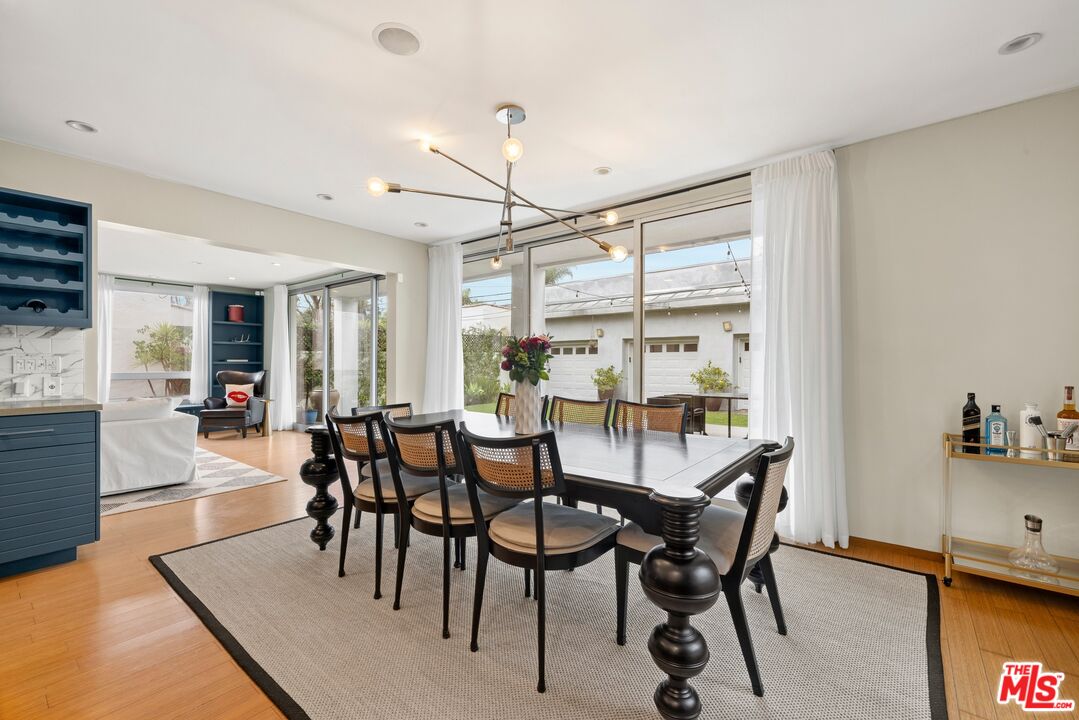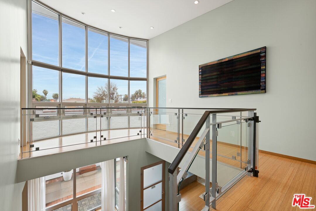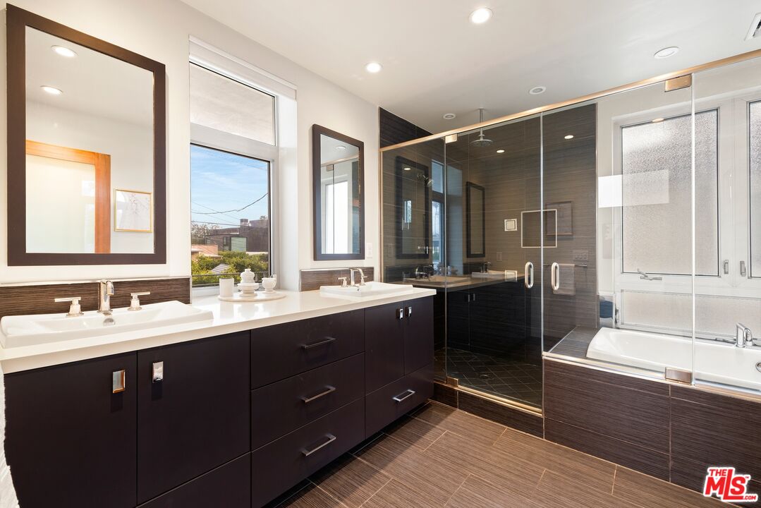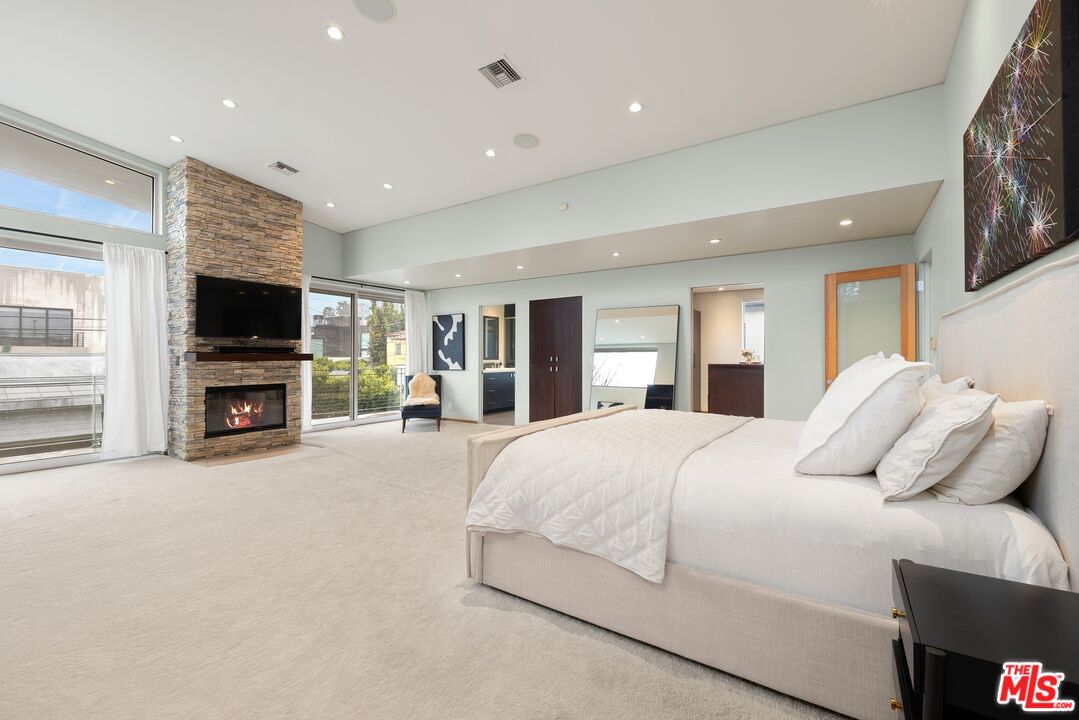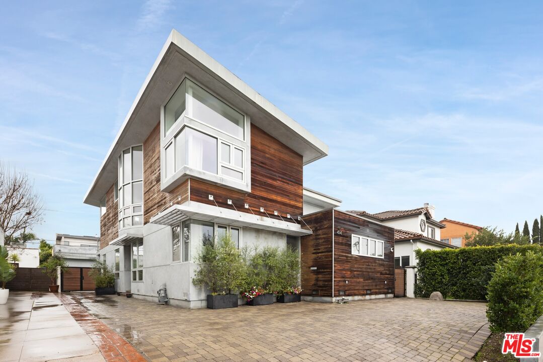 Floor-to-ceiling panes of glass, picture windows, rich wood panels, and smooth concrete converge to form the striking exterior of this recently remodeled and upgraded contemporary home, set back from the street with a brick-laid motor court and privacy hedges. The light-filled living room includes a ledgestone fireplace flanked by built-ins, walls of glass, and wood floors that flow throughout the entertaining spaces. In the sleek kosher kitchen, discover open shelving, wine storage and refrigerator, two dishwashers, double oven with warming drawer, ample cabinetry, pantry, granite countertops, and large center island with breakfast bar seating and cooktop with hood. The dining room faces sliding glass that opens to the rear deck for and indoor-outdoor dining experience. Ascend the stairs in the open foyer to a brilliant landing with massive window display showcasing treetops and blue skies. The primary suite is spacious, complete with fireplace, built-ins, balcony access, and en-suite bath with separate tub and rainwater shower plus a dual-sink vanity. A custom walk-in closet includes ample storage and a large dresser island. Secondary bedrooms also feature built-ins plus an abundance of space, and the mahogany-clad office is perfect for study, work, and play. In the backyard, dine al-fresco, enjoy the brand-new organic pet-safe grassy turf yard, or utilize the three-car garage as a gym, dance studio, artist's haven, yoga, meditation, and more. This excellent neighborhood is central to the iconic Melrose Arts District with its trendy fashion boutiques and The Grove, right by Erewhon and moments to the nightlife, entertainment, shopping, and fine dining of West Hollywood, Larchmont Village, Beverly Hills, and the Westside.