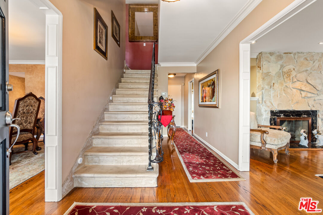Stunning 2-Story Home in Prestigious Historic View Park A beautifully appointed 4 bedroom, 4 bath residence offering 2,927 sqft of refined living space in the highly sought after Historic View Park neighborhood. The entry showcases gleaming hardwood floors and an elegant stone staircase that gracefully splits to the second level. Downstairs boasts a spacious living room that features a stone fireplace, custom insets with accent lighting, and three large windows that fill the space with natural light. Across the entry, the formal dining room provides an inviting setting for dining and entertaining. The well designed kitchen is equipped with stone countertops, tile backsplash, rich dark wood custom cabinetry with glass front accents, under cabinet lighting, a built-in double oven, and tile flooring. An adjoining eating area offers additional convenience. Just off the kitchen, the laundry room includes matching custom cabinetry and a prep sink, and a powder room. At the rear of the home, the family room features a second fireplace with a wood mantle, lit display insets, and a glass slider leading to the backyard. A downstairs bedroom that is deal for guests or workspace, sits adjacent to a beautifully upgraded bath with wood vanity, stone countertop, vessel sink, and a shower with diagonally set decorative stone tile. Ascend the staircase to a thoughtful upper-level layout: one side leads to the primary suite with its own private bath, while the opposite side offers two additional bedrooms and a hallway bath. One bedroom features direct access to a private patio with rooftop and peek-a-boo mountain views. Another bedroom enjoys a striking view of Downtown Los Angeles from the window. The multi-tiered backyard offers versatile outdoor living, with a partially covered upper concrete terrace and two lower levels combining lawn and hardscape, perfect for relaxing or entertaining. Additional features include recessed lighting throughout most of the downstairs, central heating and air, ceiling fans in all bedrooms, and a two-car garage. Close proximity to Kenneth Hahn State Park, scenic hiking trails, and neighborhood walking paths adds to the home's appeal. Come be the newest neighbor!