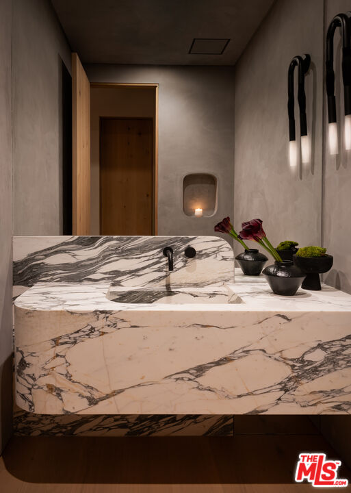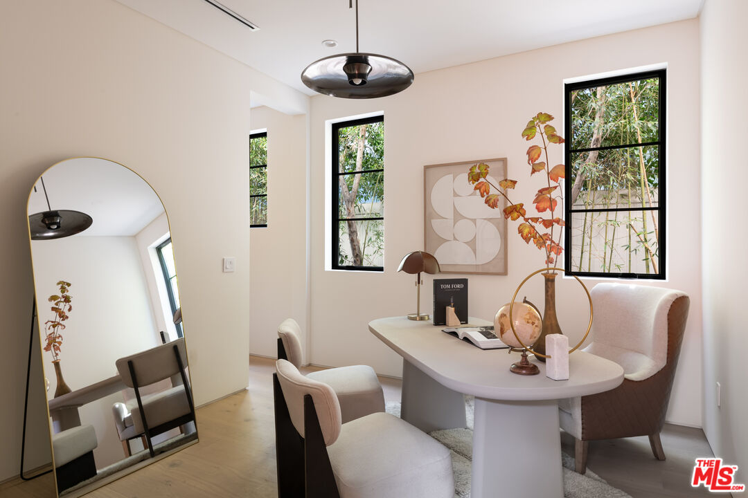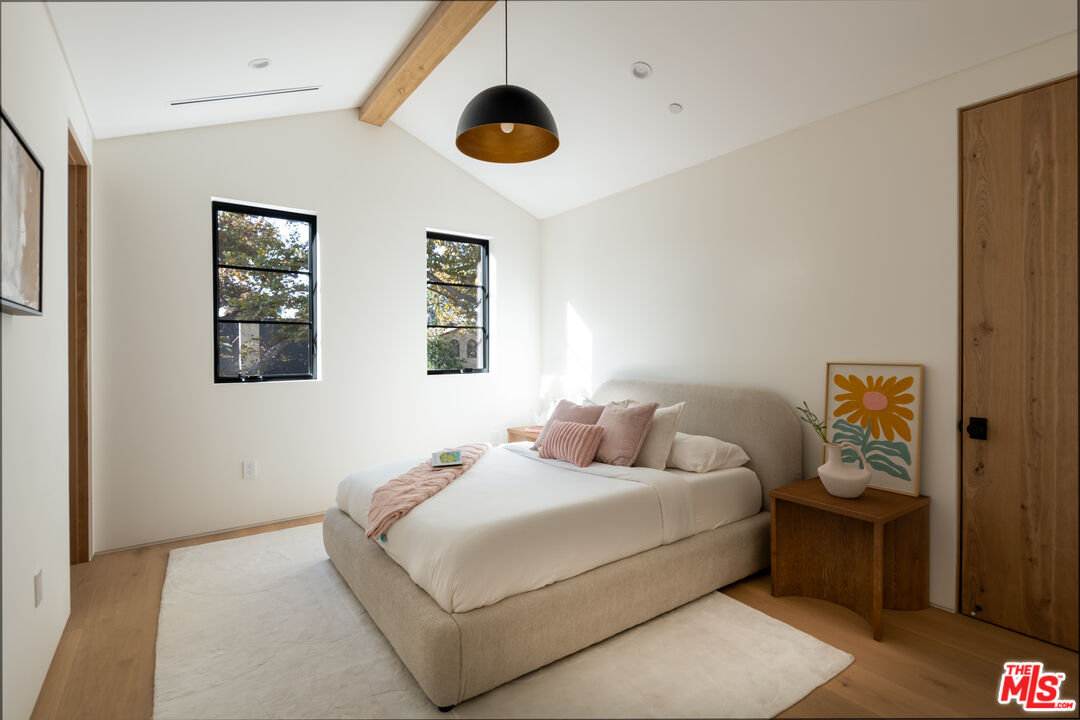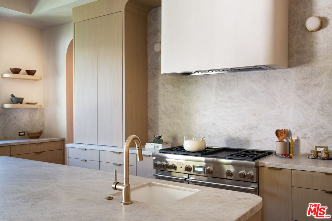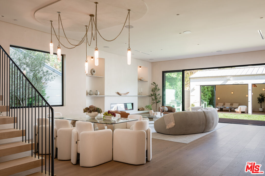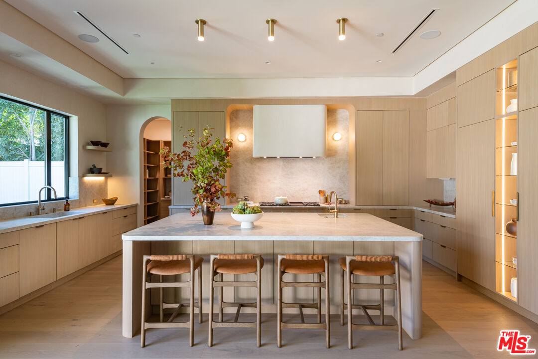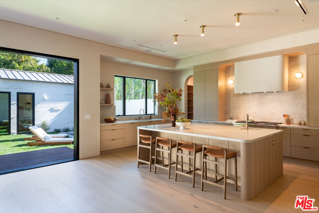 Introducing a newly built Deco Revival inspired modern estate in the heart of Sherman Oaks, ideally located South of the Boulevard and moments from top restaurants, shops, and cafs. Crafted with elevated materials and refined organic texture elements, this residence blends timeless Art Deco elegance with contemporary California living. The exterior features natural stone, brick, and smooth stucco, creating a striking architectural presence. Once inside, custom oak cabinetry, hand-crafted oak ceiling beams, and European natural stone countertops set a sophisticated tone. Upon entering, the main floor unfolds with a seamless flow through spacious, open concept living. Natural light fills the space where expansive living and dining areas flow seamlessly into the gourmet kitchen. The chef's kitchen is equipped with premium Thermador appliances, European stone countertops, bespoke fixtures, and a large island designed for cooking, gathering, and everyday living. Curved architectural lines and thoughtful lighting, elevate the ambiance with refined soft deco influence. A desirable first-floor ensuite bedroom provides flexibility for guests or a private office, while a spacious theater offers an ultimate cinematic experience. Upstairs, there are four additional ensuite bedrooms, including a luxurious primary suite with vaulted ceilings, custom walk-in closet, private balcony overlooking the outdoors and a spa-inspired bathroom featuring premium finishes and marble countertops. Thoughtfully designed for comfort and privacy, each bedroom enjoys its own beautifully finished ensuite bathroom and custom closets. Make your way outside to the backyard oasis, offering a resort-style pool and spa, outdoor BBQ island and room for alfresco dining and entertaining. The 1 bedroom, 1 bathroom ADU is the perfect place for extended family, friends who are visiting or your home studio.