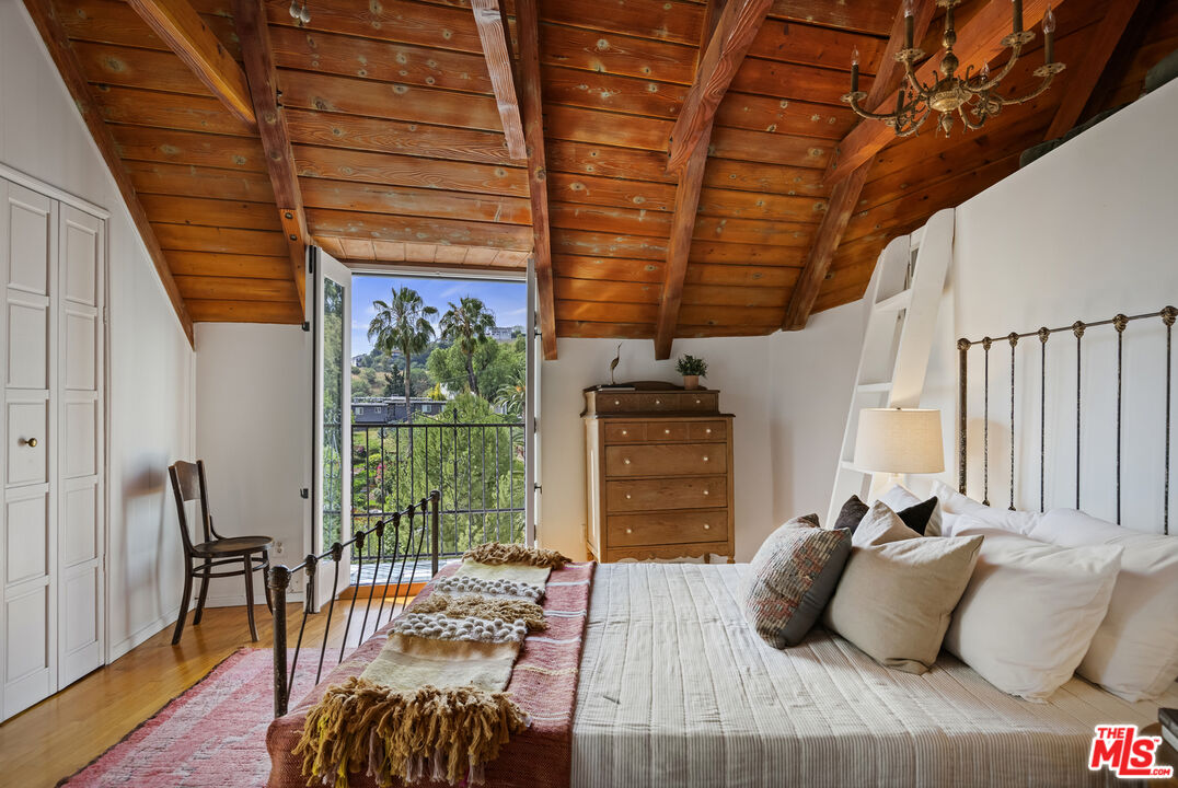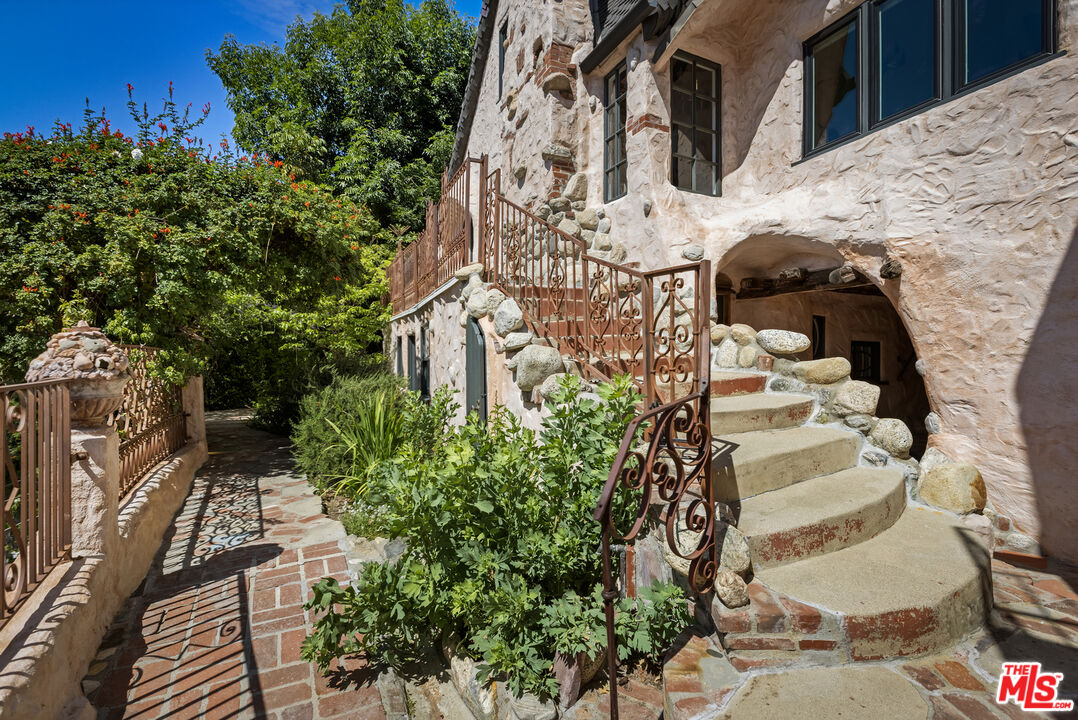 "The Pink Castle," c. 1922. This sprawling French-inspired Storybook compound, built over four years by pioneering special effects artist Paul Sprunck in collaboration with architect Arthur Cass Munson, is an ode to Hollywood's boomtown era. Exquisitely restored over 30 years, the estate features a main house with 2 bedrooms, 2 baths, and multiple flex spaces (1,885 sq ft), a detached art studio/guest suite (442 sq ft), and a lower-level studio/guest suite (517 sq ft) on an oversized 8,000+ sq ft lot. The main living room features 18' high ceilings, original and rebuilt lath and frosting-like plaster walls, dense hand-carved beams, and a sculptural staircase rising to a landing ideal for reading or mixing cocktails for guests below. The upper bedroom, with exposed wood ceilings, a hidden loft and sweeping vistas, feels lifted from a fairytale. Through the thick arched doorways of an office/napping room, you enter a second grand living area with a stone fireplace, cathedral ceiling, and golden light streaming through nearly a dozen oversized windows. The depth and softness of a space crafted when everything was built by hand is hard to ignore, even as you take in the dining room, flanked by a marvelously renovated kitchen with curved counters that follow the home's contours, and the rounded grace of a turret with two fairytale-like alcoves. The second bedroom is a study in art and design, with storage secreted into every usable space, ocean views, and a pink stucco and tile bath with soaking tub. Outside, an expansive patio with gentle walkways and forged metal fences and gates leads to magical gardens with citrus trees and two additional living structures. The first, a detached studio/guest suite with powder room, blends seamlessly with the original architecture, featuring rounded walls, soaring ceilings, and a custom floor of salvaged stone. The second, a lower-level suite, includes a full bath and ample space for long-term guests or potential rental income. There are too many character details to mention as this is a home that defies written description and must be experienced in person. Suffice it to say, the Pink Castle, moments from Highland Park's vibrant core and within the coveted Mt Washington Elementary school district, is not only steeped in the glory of the past but ready for your future.