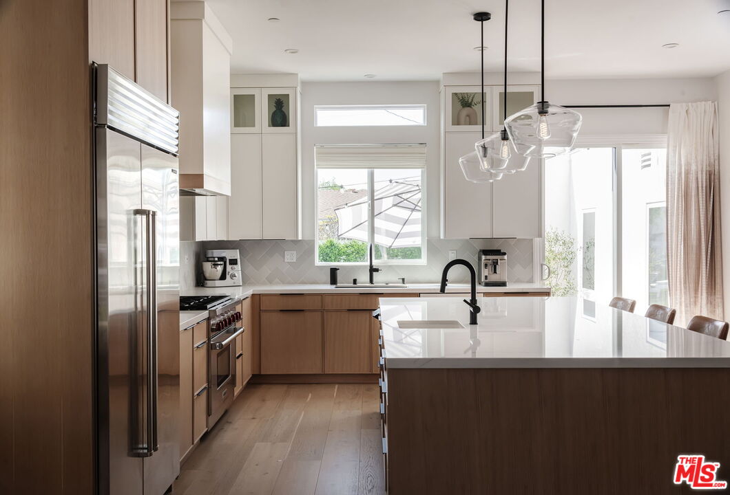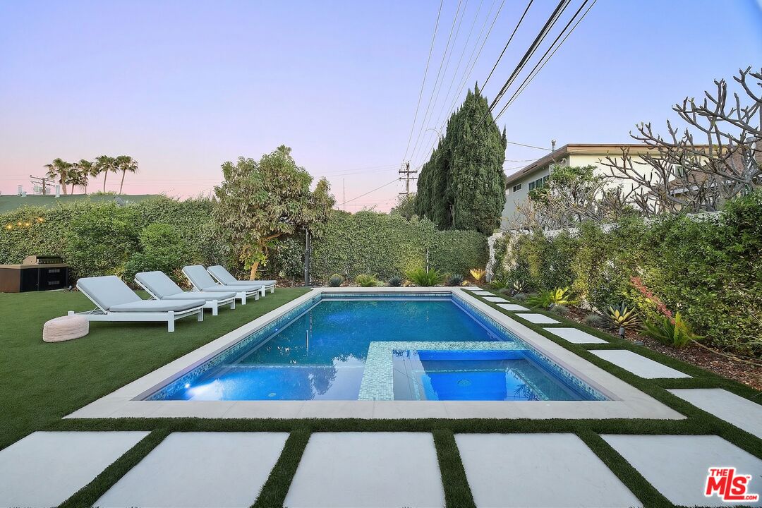 Beautifully reimagined in 2024 and set on one of Culver City's most desirable streets, this contemporary Mediterranean residence offers a two-level, four-bedroom, two-and-a-half-bath main home, complemented by a detached one-bedroom, one-bath guest house with its own private street entrance, as well as a resort-style backyard with a heated pool and spa. Designed for seamless indoor-outdoor California living, the backyard is an entertainer's retreat - featuring a dining deck, fire pit lounge, built-in BBQ, and a pool and spa with Baja shelf, electric pool cover, and advanced salt, ozone, and UV filtration. The main home showcases an open-concept layout with soaring ceilings, white oak flooring, and a wood-and-gas fireplace. The kitchen is both refined and functional, with floor-to-ceiling cabinetry, Wolf and Sub-Zero appliances, a walk-in pantry, and an oversized island that flows effortlessly into the dining area. Sliding glass doors open directly to the backyard, creating a true indoor-outdoor experience. The first floor also includes a powder room, a flexible bedroom or office, and a game room with its own private staircase. Upstairs, you'll find two well-appointed bedrooms with reach-in closets, a dual-sink full bath, and a spacious primary suite featuring a walk-in closet and a spa-inspired bathroom with a soaking tub, oversized shower, and separate water closet. A laundry room with built-in cabinetry completes the upper level. The detached guest house offers a living area with kitchenette, a bedroom with a built-in desk, a full bath, and two mini-split systems. With its private street entrance and direct backyard access, it's ideal for rental income, guests, or a dedicated workspace. Located just moments from Culver City's vibrant restaurant row and The Culver Steps, this home delivers elevated living in one of Los Angeles' most sought-after neighborhoods.