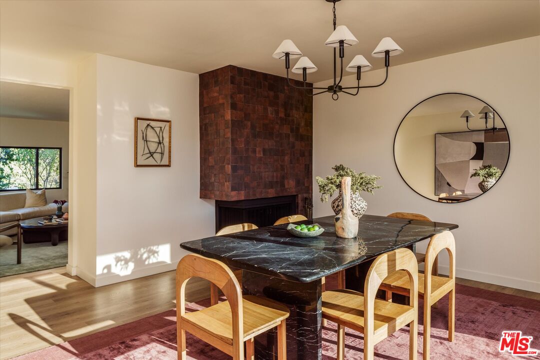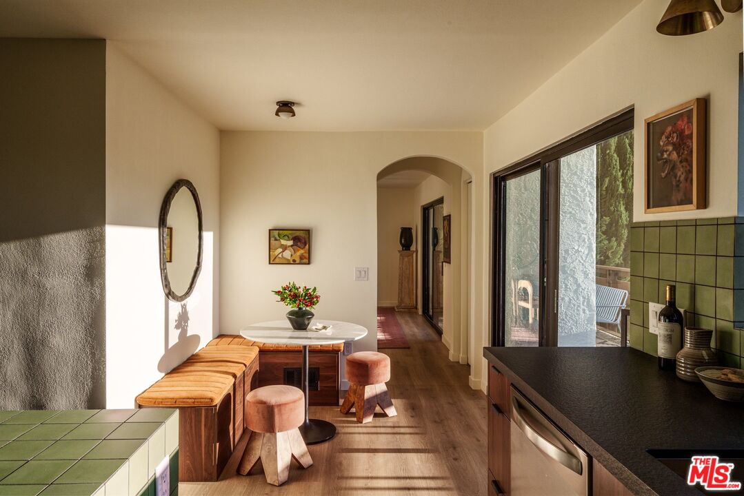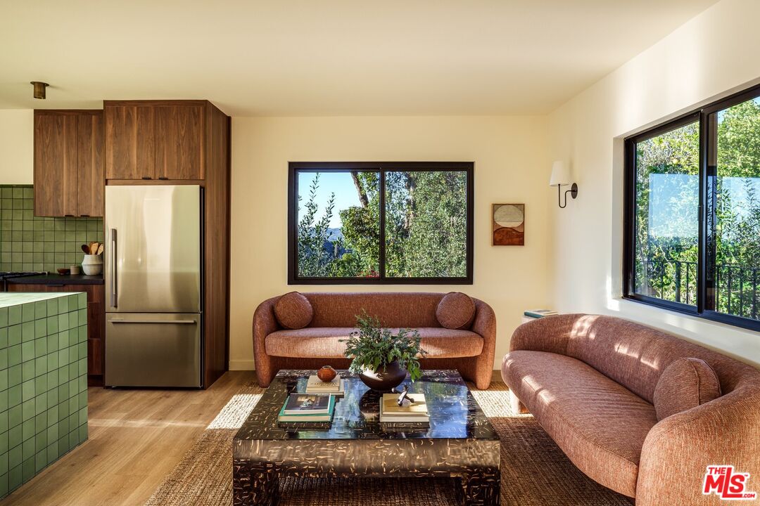 Spectacular Spanish home by Decente Designs perched at the top of the hill with incredible natural light and panoramic views from every room. Flanked by greenery and gardens with exceptional privacy, the main level is elevated off the street and features a reclaimed antique entry door with iron hardware. Enter into the designer remodeled home to find all new flooring, bespoke light fixtures, all new finishes, stunning views out every new Milgard window, with thoughtful and stylish touches throughout. The kitchen features granite countertops, walnut cabinetry, Rejuvenation bronze hardware, Zia tile backsplash and island tile, brass light fixtures, all new appliances, accented by open shelving and plentiful natural light. Off of the kitchen opposite the sitting area is a built-in breakfast nook looking out to the large deck through a sliding glass door with room for al fresco dining and lounging overlooking the expansive hillside views in complete privacy. Through the arched doorways there is a formal dining room complete with fireplace clad in stunning cotto tile, and adjacent to that a classic step down living room featuring another fireplace with custom tile shelving and flanked by wall sconces and large windows. Upstairs the bedroom level features a built-in sitting nook under a view window at the top of the staircase, and a generous primary bedroom with its own balcony, walk-in closet, and en suite bathroom. The primary bathroom is highlighted by limestone flooring, custom cement tile shower with brass hardware, and a double vanity with artisanal light fixtures. The three guest bedrooms and additional guest bathroom, all with stunning views, complete the bedroom floor. Downstairs there is a den off of the larger second deck which has a tiled built-in exterior kitchen area and built-in hot tub all in complete privacy with 180 degree deep views of the surrounding green hillsides. Direct entry two car garage, secluded yard areas on either side of the home, and just a short drive to markets, restaurants, coffee shops, hikes, and more at the bottom of the hill. A special home in the Los Angeles hills awash in natural light and greenery.