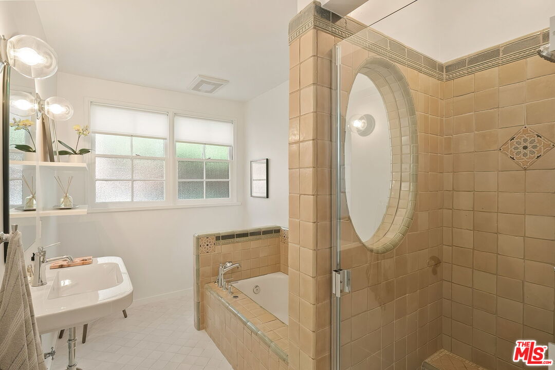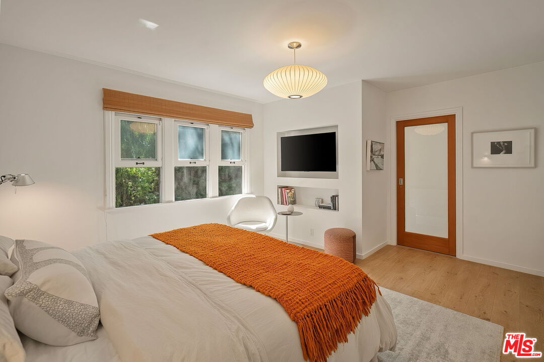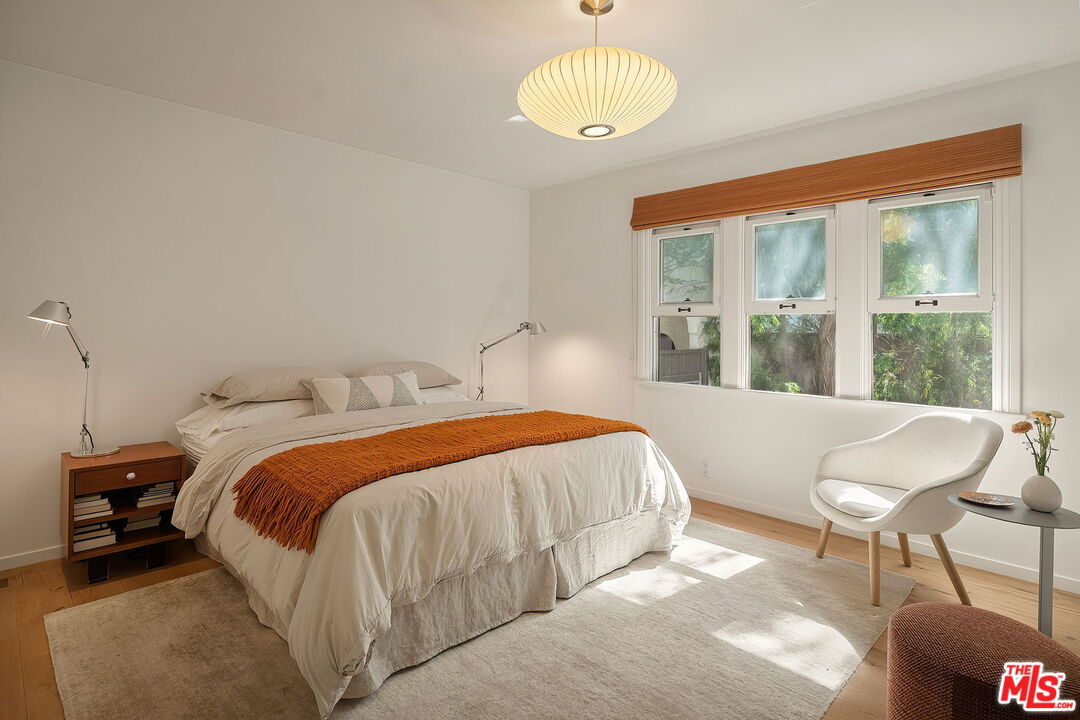 Single-level, Country English, charmer in Gillette Regent Square. This tranquil 3-bedroom, 2-bathroom home has been beautifully updated and meticulously maintained. Approximately 2,620 sqft of living space inclusive of the detached converted garage. A vaulted barrel ceiling gives way to graceful archways as natural light filters through bountiful French windows. Wide-plank European White Oak hardwood floors are appointed throughout the home creating an uninterrupted flow. Thoughtfully designed storage solutions add an element of surprise. A delightful living room with fireplace sits adjacent to the dining room surrounded by French windows; both rooms providing a lovely place to welcome and host guests. The cook's kitchen features stainless steel appliances, walk-in pantry with ample space for a side-by-side washer/dryer, and BBQ patio. The primary bedroom is a sanctuary for rest and relaxation with a walk-in closet and a spa-like bathroom. Enjoy the utmost privacy in the large backyard surrounded by a lush landscape of tall hedges and Eucalyptus trees; the back deck overlooking the expansive green, natural-looking turf, is a perfect place to appreciate Santa Monica's gorgeous weather. The detached garage has been converted to a two-story artist studio with bathroom- great potential for a true guesthouse/ADU. Driveway parking with convenient EV charging station. Franklin School District. This unique one-story home is as enchanting as can be and move-in ready.