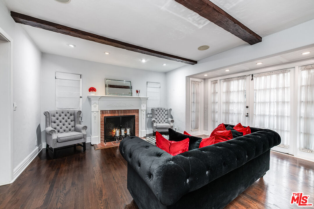 Romantic Old World Spanish charmer nestled in the heart of Toluca Lake, a coveted enclave known for its privacy and celebrity appeal. This beautifully maintained 3-bedroom, 2.5-bath residence showcases classic Spanish Revival architecture with wood shutters, tile roof, wrought iron detailing, and authentic lantern lighting. Inside, timeless character blends seamlessly with modern comfort, featuring hardwood floors, an inviting fireplace, and exposed ceiling beams that create a warm, elegant ambiance. Graceful arched passageways connect the spacious living room to the formal dining room, ideal for refined entertaining. The thoughtfully remodeled gourmet kitchen is appointed with Sub-Zero, Wolf, and Viking appliances, granite countertops, butcher block accents, and custom paver flooring, while a stylish powder room is enhanced with colorful Talavera tile and a hammered metal basin. An expansive media room with Saltillo tile floors and custom built-ins offers a relaxed yet sophisticated gathering space. The primary suite serves as a private retreat with exposed beams, a balcony, and a spa-inspired bath featuring Walker Zanger tile, custom vanity tops, a jetted tub, separate shower, and Kallista fixtures. Additional highlights include surround sound throughout the home and backyard, custom woodwork, upgraded electrical and plumbing systems, and dual HVAC. A detached guesthouse provides flexible space for guests, office, or creative studio use. The resort-style backyard is designed for exceptional entertaining, complete with an outdoor kitchen with swing seating beneath a palapa, a Pebble Tec pool and spa, multiple lounging areas, and lush landscaping that creates a private, tranquil escape just moments from the shops and dining of Toluca Lake Village.