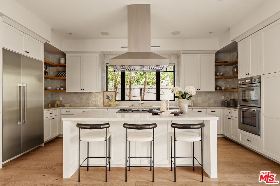 Experience refined modern farmhouse living on one of Studio City's most coveted streets. Thoughtfully designed with warm tones and sophisticated finishes throughout, this exceptional residence offers a seamless blend of elevated style, everyday comfort, and effortless indoor-outdoor living. A brilliant, open floor plan centers around a chef's kitchen appointed with high-end appliances, an expansive breakfast island, and an elevated designer backsplash, flowing naturally into an inviting family room. Walls of multi-panel sliding doors open to a rare, large and private backyard - an increasingly hard-to-find feature among newer construction homes - creating the perfect setting for both intimate gatherings and large-scale entertaining. The home is accented by rich wood flooring, statement lighting, Elan smart-home integration, and two charming side courtyards that fill the interiors with natural light. A well-considered layout includes one ensuite bedroom on the main level and three ensuite bedrooms upstairs. The serene primary suite captures beautiful east-facing sunrises and features a private balcony, fireplace, spa-inspired bath, and two generous walk-in closets.Outdoors, the resort-style grounds showcase a heated pool and spa, outdoor kitchen, and expansive lawn - offering a true private retreat in the heart of the city. Ideally located with easy access to Downtown, Hollywood, and the studios, and just moments from the boutiques and cafes of Tujunga Village and Colfax Meadows.