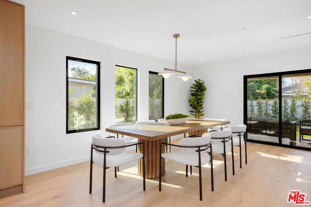 Located in a highly desirable pocket of Sherman Oaks, this beautifully reimagined single-level residence blends refined design with effortless livability. Offering three bedrooms and three and a half bathrooms, the home unfolds across a generous open floor plan ideal for both everyday comfort and elevated entertaining. Upon entry, oak hardwood floors, abundant natural light, and Marmorino Tintoretto plaster walls create an immediate sense of warmth and sophistication. At the heart of the home, the gourmet kitchen is a true showpiece, featuring premium Thermador appliances, porcelain countertops, sleek light-toned cabinetry, and an oversized island with bar seating, perfect for casual meals or gathering with guests. The kitchen flows seamlessly into the living and dining areas, where expansive sliding glass doors invite the outdoors in and open to the backyard retreat. Just off the kitchen, a stylish powder bath with a natural silver travertine vanity adds convenience for hosting.The main hallway leads to a serene primary suite, complete with a spacious walk-in closet, direct backyard access, and a spa-inspired ensuite bath featuring a floating double vanity, a large step-in shower with built-in bench, and a soaking tub. Two additional bedrooms near the entry each offer their own ensuite baths with stone-topped floating vanities and luxe step-in showers. A thoughtfully designed laundry area with additional storage completes the interior. Designed for year-round enjoyment, the lush backyard captures the essence of California living with a covered patio, a charming lemon tree, and ample space for entertaining under the stars. Ideally located moments from Westfield Fashion Square and the renowned shops and restaurants of Ventura Boulevard, this home seamlessly blends contemporary luxury with everyday convenience.