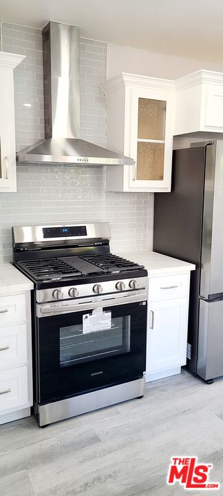 This stunning home offers a fabulous new, all wood shaker style kitchen with soft closing cabinet door hinges. Some cabinet doors feature a textured glass panel for a beautiful privacy look. The white quartz Carrara counter tops are glamorous , connecting to the polished sublime backsplash. There are all new stainless steel appliances by Samsung. The French door refrigerator has an ice maker and the oven has a 5 burner cook top, with an exquisite wall range hood above it. The sink is stainless steel, with a restaurant style water faucet. Bathrooms have new, modern style vanities, with illuminated make-up mirrors. Main bathroom has an eye-catching brushed nickel frameless shower/tub door, with white Carrara-tiled shower walls. Brushed nickel lighting fixtures, and faucets make the bathrooms look amazing. Luxury vinyl plank-gray Charleston Oak Style flooring is water proof, and scratch resistant throughout the home. Fresh radiant gray paint on the interior walls through out , with ice white ceilings , doors, and baseboards. Recessed lighting , with brushed nickel lighting fixtures complement this gorgeous home, with a spacious open floor plan. New double pane windows, with stylish grids for the front windows. Upgraded electrical, and plumbing. New roof. The Exterior has an elegant white fiberglass door with modern lighting fixtures. This must-see home screams "Location , Location, Location". Sitting on this palm tree lined street are various entertainment options including: The Getty Center: A world-renowned art museum with gardens and architecture. Grammy Museum: Explores the history and artistry of music. Petersen Automotive Museum: Focuses on the history of automobiles. La Brea Tar Pits and Museum: A museum and active paleontological research site. California Science Center: Features interactive exhibits on science and technology. Live entertainment and theme parks Universal Studios Hollywood: A major theme park and working studio. L.A. LIVE: A complex with music venues, restaurants, a bowling alley, and a movie theater. El Capitan Theatre: A historic movie palace on Hollywood Boulevard. For your taste buds there are numerous delicious options such as : Tev's kitchen, Fuegos LA, Southern Soul LA, Two Hommes, ORA, Steaks LA, Dulan's on Chrenshaw, Palmsugar, Sunday Gravy, The Breakfast Shack and many more. Nearby access to the I-10 fwy, I-405 fwy, and the I-110 fwy. ADU potential with the detached garage in the back, buyer to verify . Some images are virtually staged.