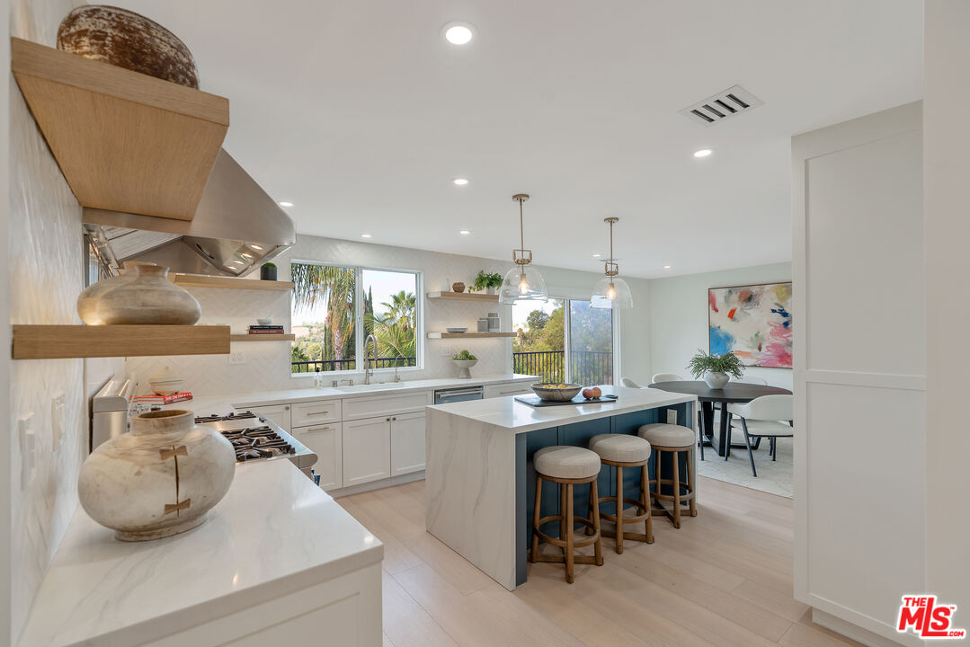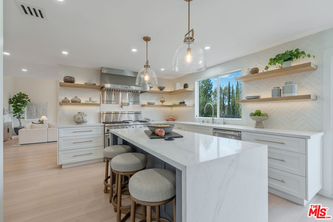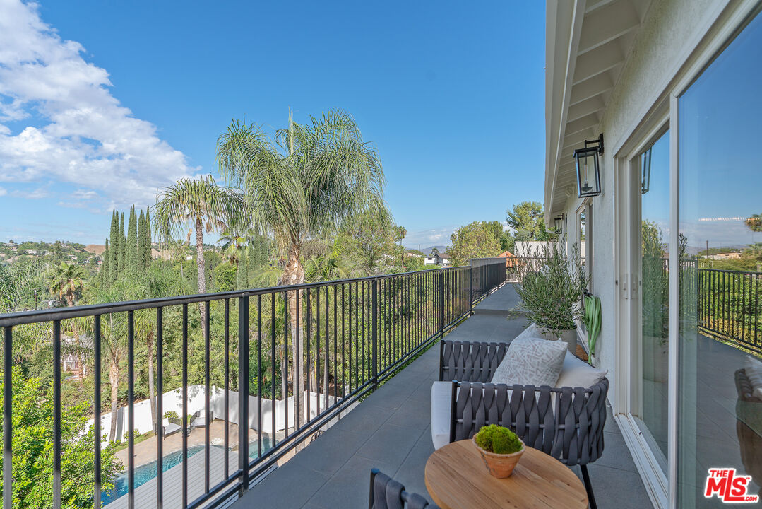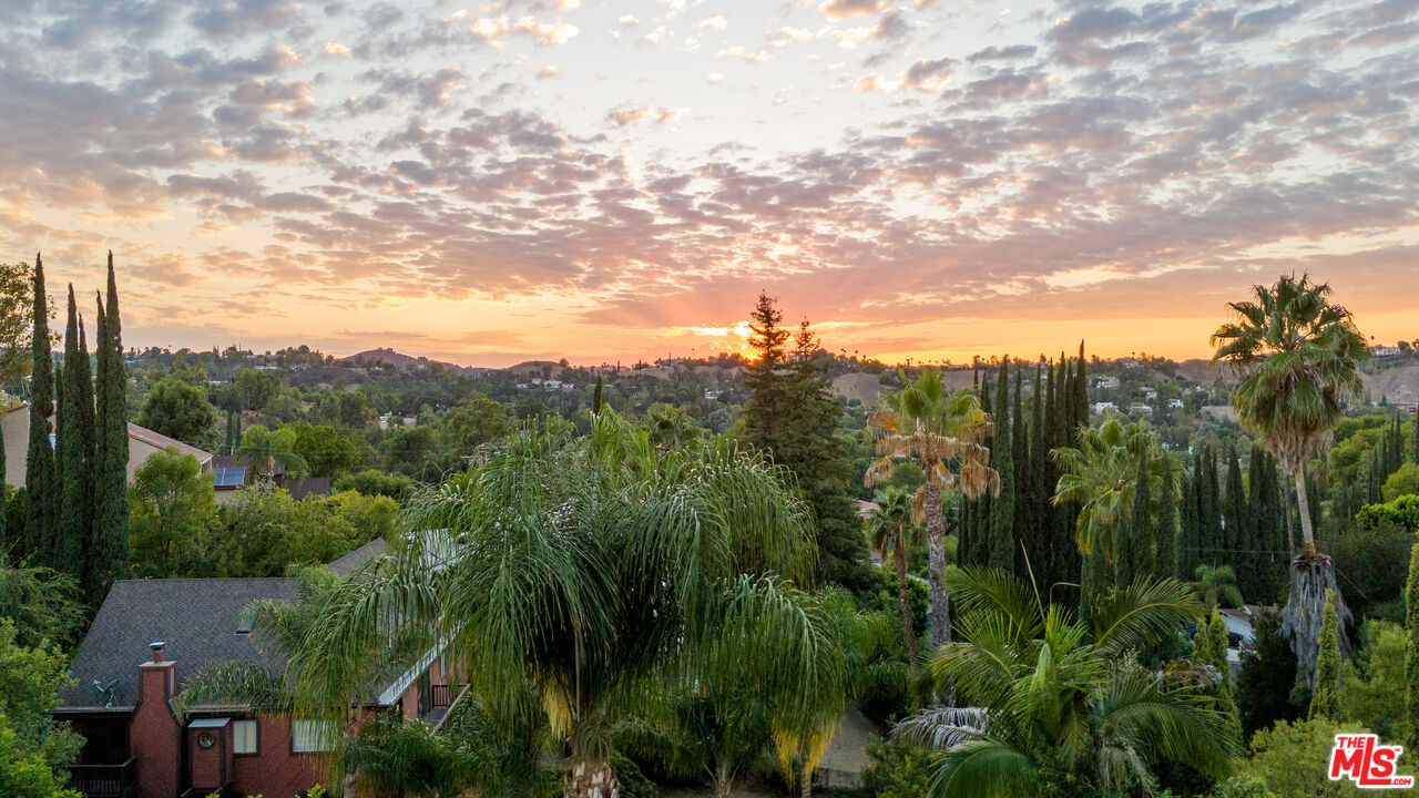 Discover the timeless beautify of 4825 Galendo Drive - A fully Remodeled Woodland Hills Estate with Sweeping Views. Located South of the Boulevard in one of Woodland Hills' most desirable neighborhoods, this beautifully remodeled residence offers over 4,000 sq. ft. of living space with soaring ceilings and panoramic views of the mountains and treetops from nearly every room. 4825 Galendo Drive has been fully reimagined as a brand-new home offering a one of a kind living experience with a curated interior design. Every detail of this single story 6 bedroom 4 bathroom residence has been thoughtfully upgraded inside and out - including dual primary suites with expansive walk-in closets and spa-inspired baths. The impressive vaulted-ceiling family room is centered by a custom fluted fireplace and includes a built-in bar area, while the dining room captures stunning sunset views. A chef's kitchen with a large center island, premium appliances including a Thermador range and a charming breakfast room with custom built-ins completes the main living area. A sweeping balcony extends off the main level, offering serene vistas and seamless indoor-outdoor living. The lower level provides a full guest/entertaining suite complete with its own kitchen, bedroom, and full bath, ideal for visitors, extended guests, or multi-generational living. The backyard is designed for resort-style entertaining, highlighted by a covered patio, sparkling pool with waterslide, and cascading spa set against a backdrop of tranquil canyon scenery. This home combines elegance, versatility, and breathtaking views in a prime Woodland Hills location.