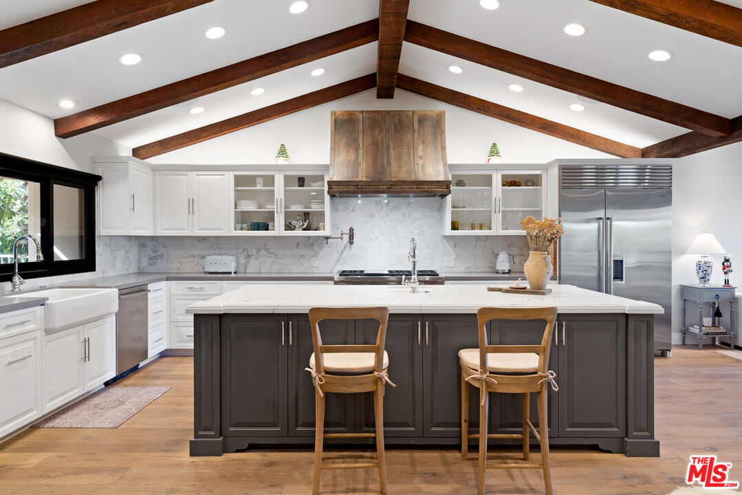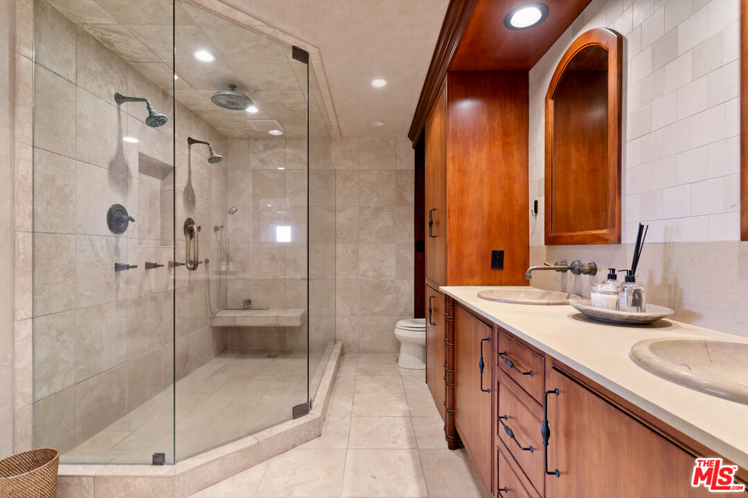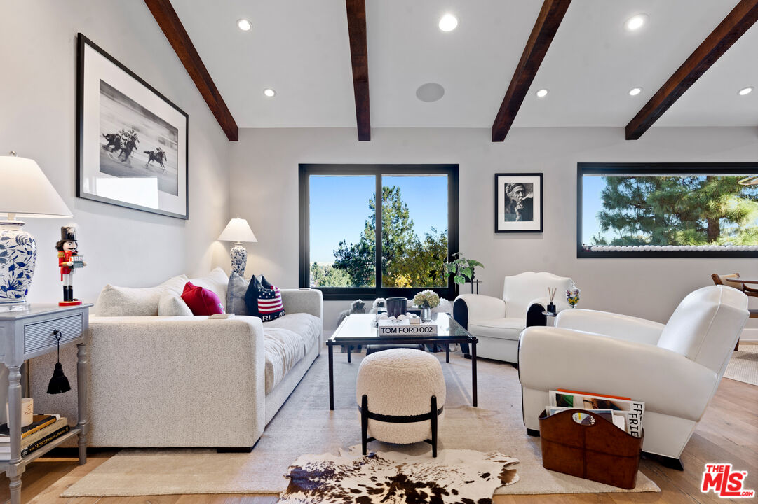 Tucked away at the end of a long private driveway, this hidden sanctuary crowns a scenic hillside residence in beautiful Woodland Hills. Step into the property and be instantly captivated by breathtaking panoramic views that pour through large-format windows, flooding the living areas with an abundance of natural light. The open-concept floor plan on the first level offers an airy, sophisticated flowperfect for both lively gatherings and everyday living. The updated kitchen boasts a large central island, upgraded high-grade appliances, and seamless connectivity to the elegant dining and inviting family rooms. The second level features three generously sized bedrooms, including a gorgeous primary suite with a beautifully appointed bathroom and an oversized walk-in closet. The fourth bedroom has been excellently transformed into a boutique-style dressing room, accessible directly from the primary suite for added convenience and opulence. Step outside to discover a sprawling backyard designed for unforgettable entertaining. An expansive turf lawn leads to a custom-built, covered BBQ and cabana complete with multiple seating areas, two outdoor TVs, and a glowing fire pit - creating the ultimate setting for gatherings under the stars. Towering, mature trees encircle the property, ensuring unrivaled privacy and shade, while endless vistas complete this idyllic retreat. Enjoy your own private retreat in the heart of Woodland Hills.