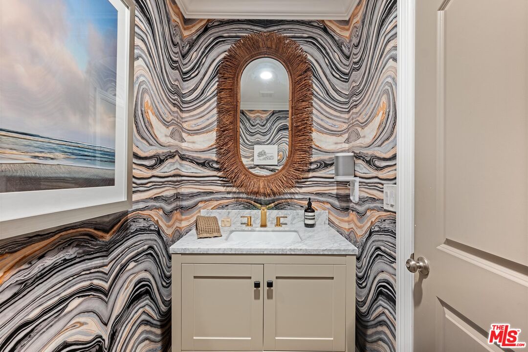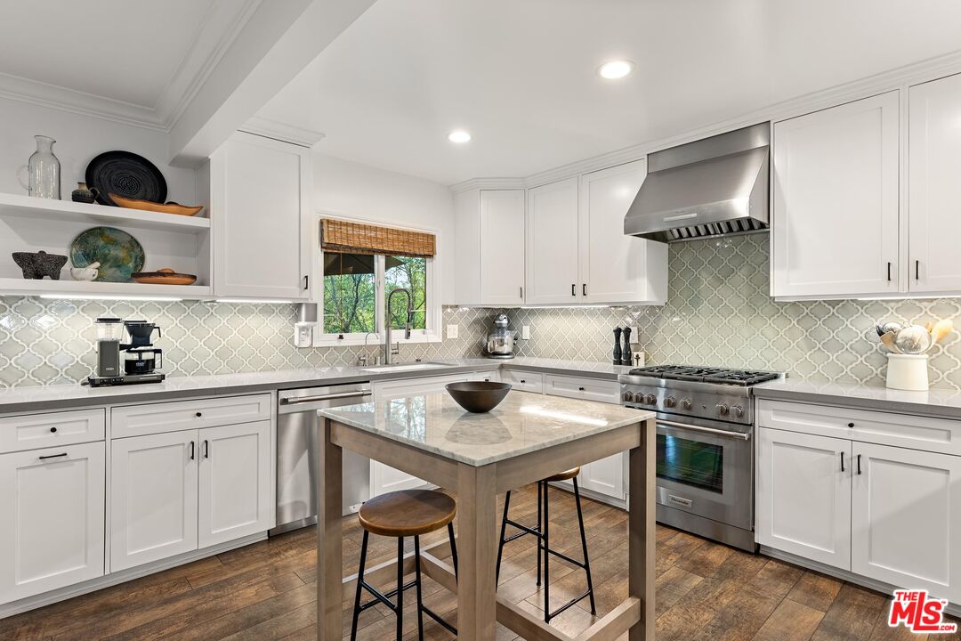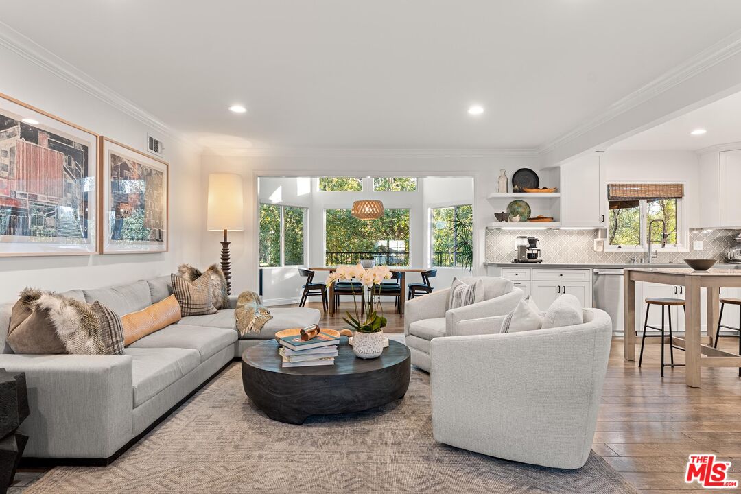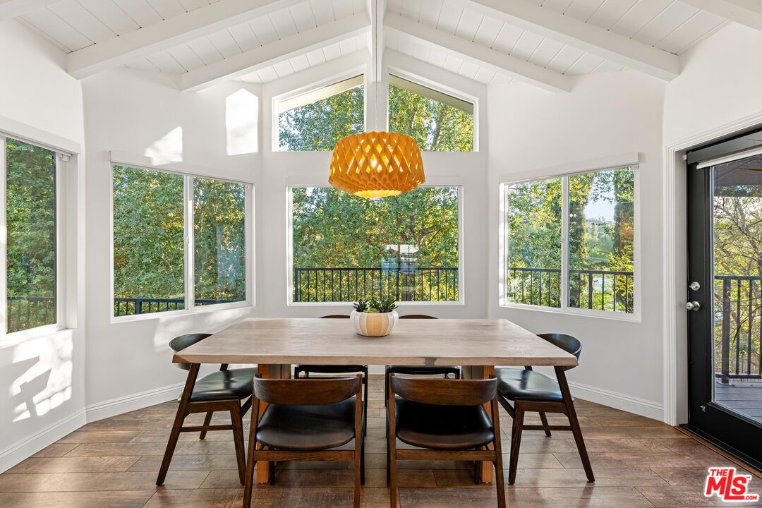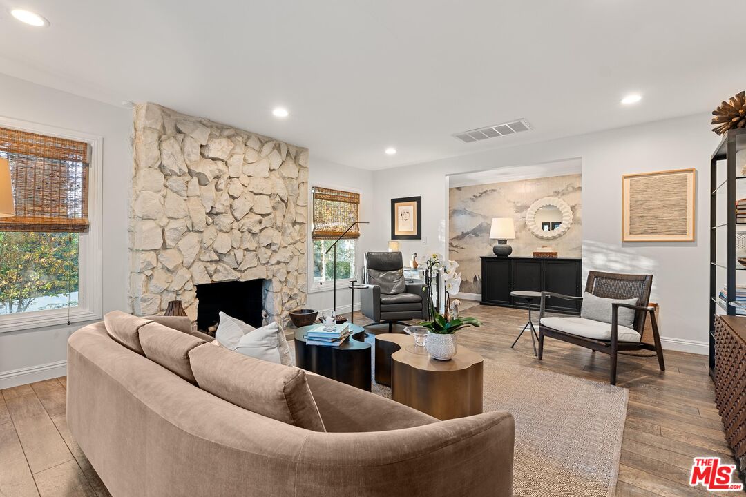 Step into this Woodland Hills sanctuary, a beautifully updated single-story home tucked away on a quiet street south of the boulevard. Set behind a private,180-foot gated driveway, this 3BD/2.5BA home blends comfort and style with treetop views, a resort-inspired pool, and effortless indoor-outdoor living. Inside, engineered hardwood floors and a stone-accented fireplace set a welcoming tone in the light-filled living room, where glass doors open to a view deck, perfect for morning coffee or sunset entertaining. A chic powder bath sits just off the entryway for guests. The open-concept kitchen features premium Thermador appliances, an island, and abundant cabinetry and counter space. The kitchen seamlessly connects to the family area, complete with its own gas fireplace, and to the formal dining room, where beamed ceilings and expansive windows frame the surrounding greenery. Offering a peaceful retreat, the spacious primary includes dual closets, a split A/C system, direct backyard access, and a luxurious ensuite bath with a dual vanity and step-in shower. Down the hall, two additional bedrooms share a beautifully appointed bath with generous counter space and shower-tub combo. Outdoor living shines here. Host unforgettable gatherings by the resort-style saltwater pool, equipped with brand new systems, or dining al fresco under the stars. Hillside vistas create a private oasis framed by lush landscaping. Ideally located near Wilbur Charter Elementary, scenic trails, and shops and restaurants along Ventura Boulevard, this home delivers the perfect blend of sophistication, seclusion, and everyday ease.