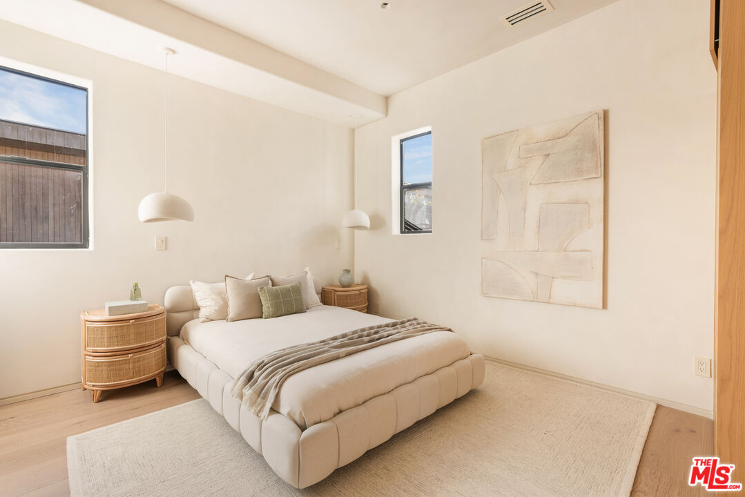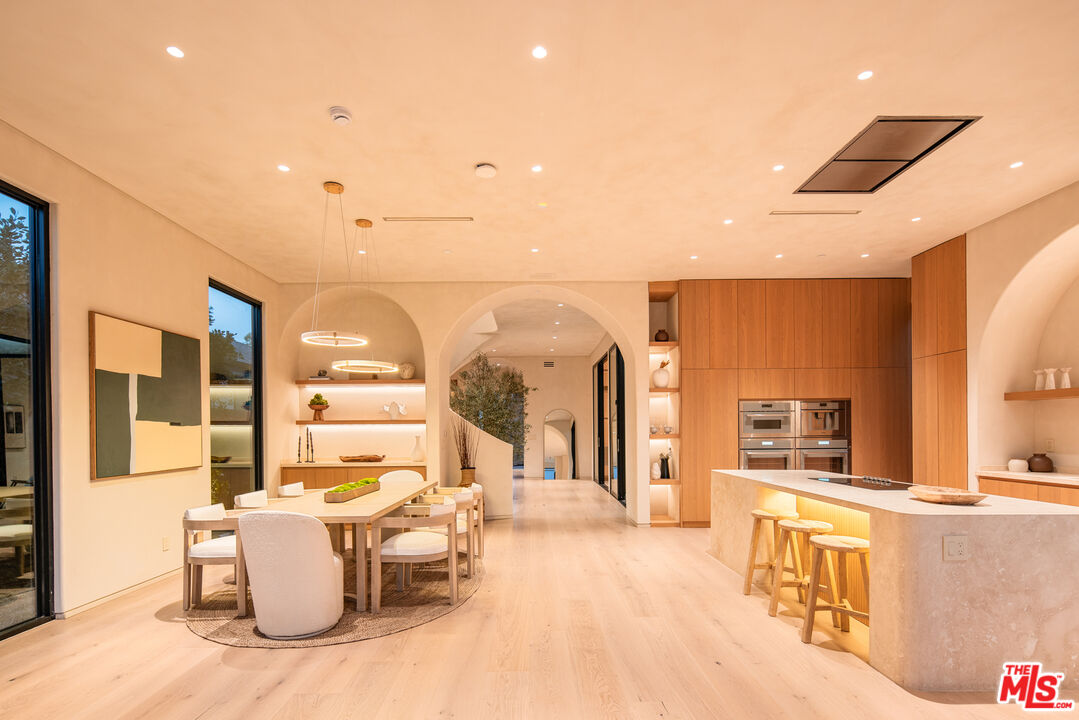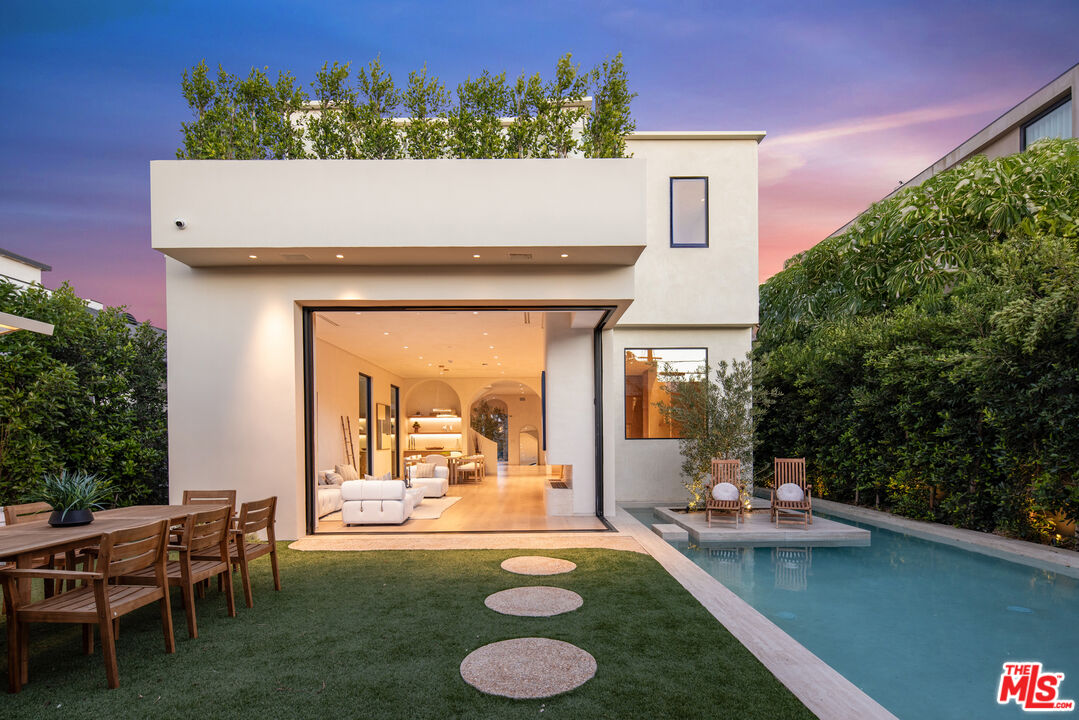 Located in one of LA's most sought-after enclaves, this Mediterranean-inspired residence exemplifies modern craftsmanship and elevated living. Upon entry, asculptural spiral staircasegracefully wraps around a mature olive tree, rising beneath a dramatic skylight that fills the foyer with natural light and sets a striking architectural tone. Inside, travertine finishes, plastered walls and contemporary curves create a seamless flow of texture and form throughout. Expansive, wall-to-ceiling sliding glass doors dissolve the boundary between the living spaces and the manicured backyard, flooding the interiors with natural light and enhancing effortless indoor-outdoor living. The chef's kitchen anchors the home with refined materials and meticulous detailing, ideal for both everyday living and hosting. Outside, the backyard unfolds as a private resort-style retreat, featuring a pool and spa, built-in BBQ and lush landscaping designed for year-round enjoyment, while a detached ADU provides flexibility for guests, work or extended living. Upstairs, the primary suite serves as a serene sanctuary with two expansive walk-in closets and a spa-like bathroom complete with a soaking tub. Two additional bedrooms occupy the second level, offering comfort, privacy and thoughtful separation. Complete with a two-car garage and exceptional attention to detail throughout, this smart home delivers a rare blend of architecture, function and lifestyle, quietly positioned near boutique shopping and acclaimed fine dining in one of Los Angeles' most coveted neighborhoods.