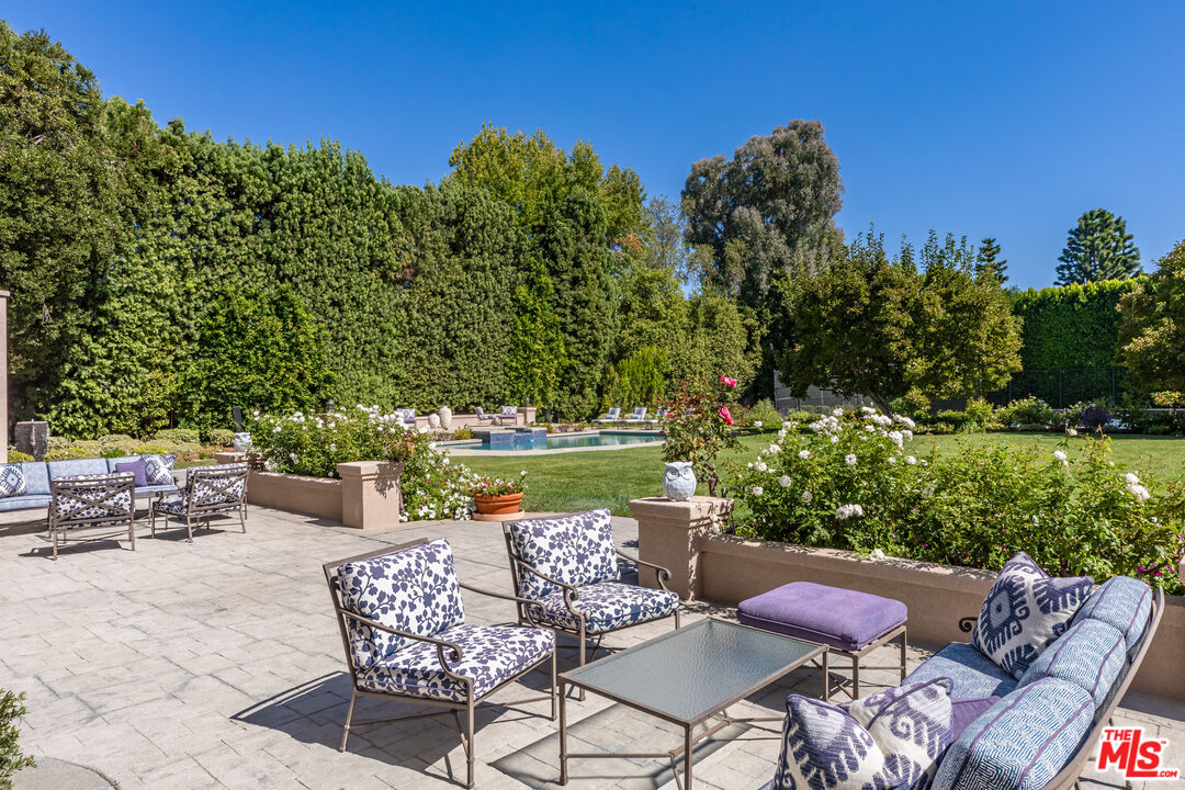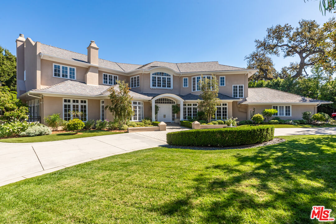 Privately set behind gates in one of Encino's most sought-after neighborhoods, this exceptional property spans over 52,000 square feet of flat, usable land. The voluminous 8,685 square-foot home is surrounded by mature landscaping, tall privacy hedges, and beautifully maintained gardens that create a peaceful, park-like setting. The expansive grounds feature wide open lawns, a sparkling pool and spa, and a full tennis court all thoughtfully integrated for recreation and relaxation. Multiple patios and outdoor sitting areas invite everyday living and effortless entertaining. A separate guest house with a covered lattice and outdoor kitchen overlooks the garden, ideal for gatherings or extended stays. The main residence offers a comfortable layout with natural light throughout. French doors connect the living spaces to the outdoors, enhancing the sense of openness and calm. Inside, you'll find a formal living room, wood-paneled library, dining room, family room with built-in bar, and a spacious kitchen with breakfast area. The primary suite includes a fireplace, dual closets, and a large bath with soaking tub and skylight. Offering both space and privacy, this property blends the best of California living an expansive lot, serene surroundings, and easy access to Encino's shops, dining, and top schools.