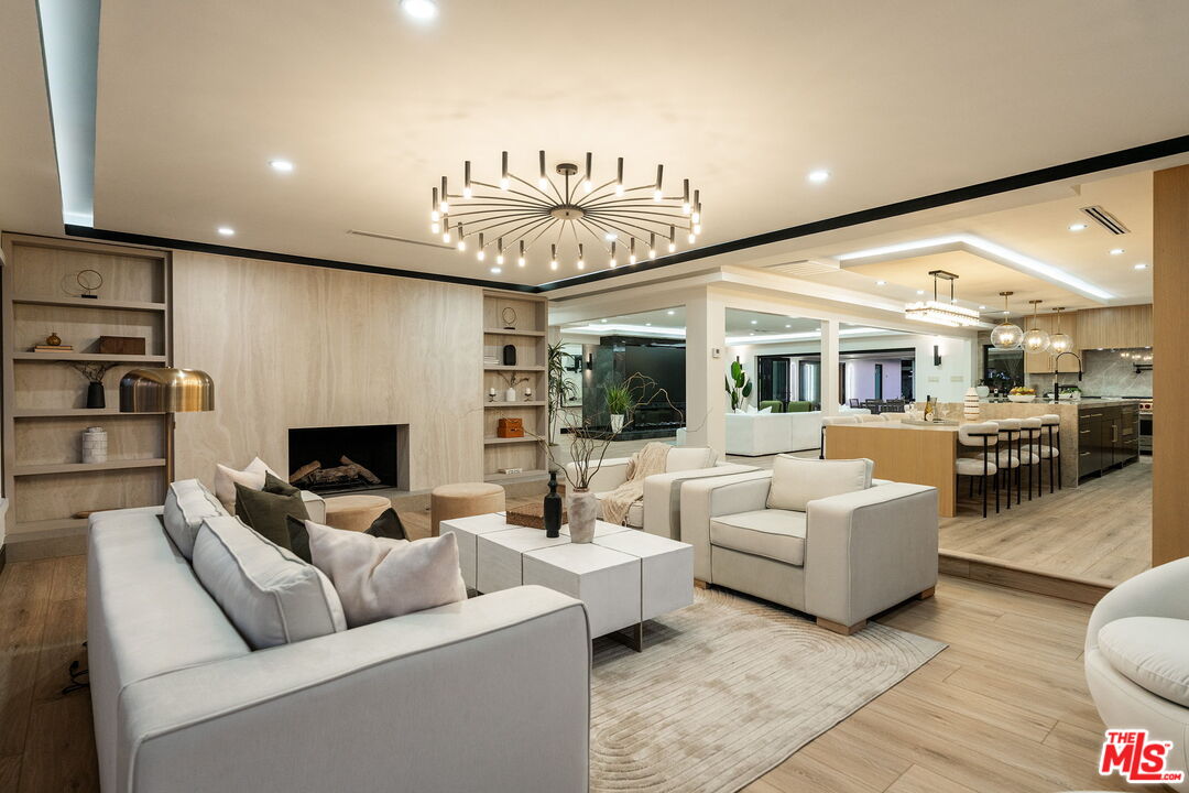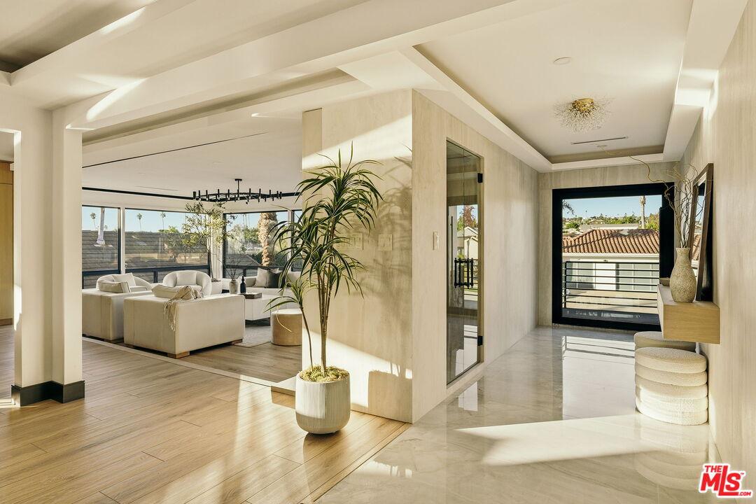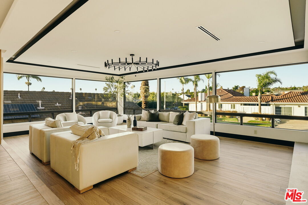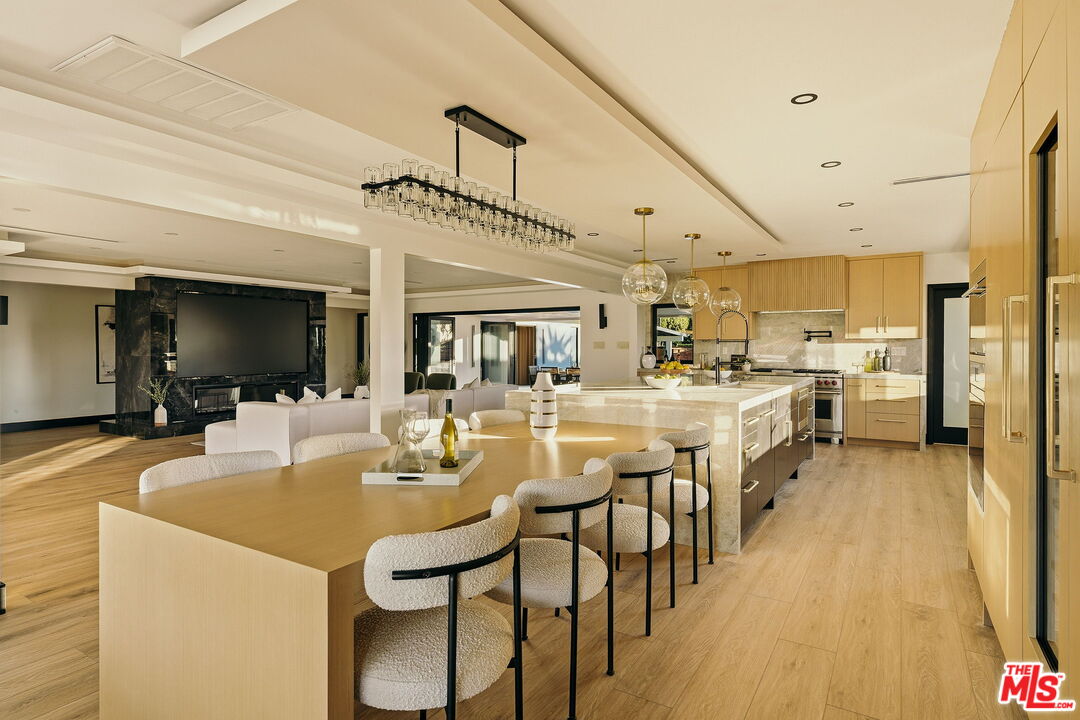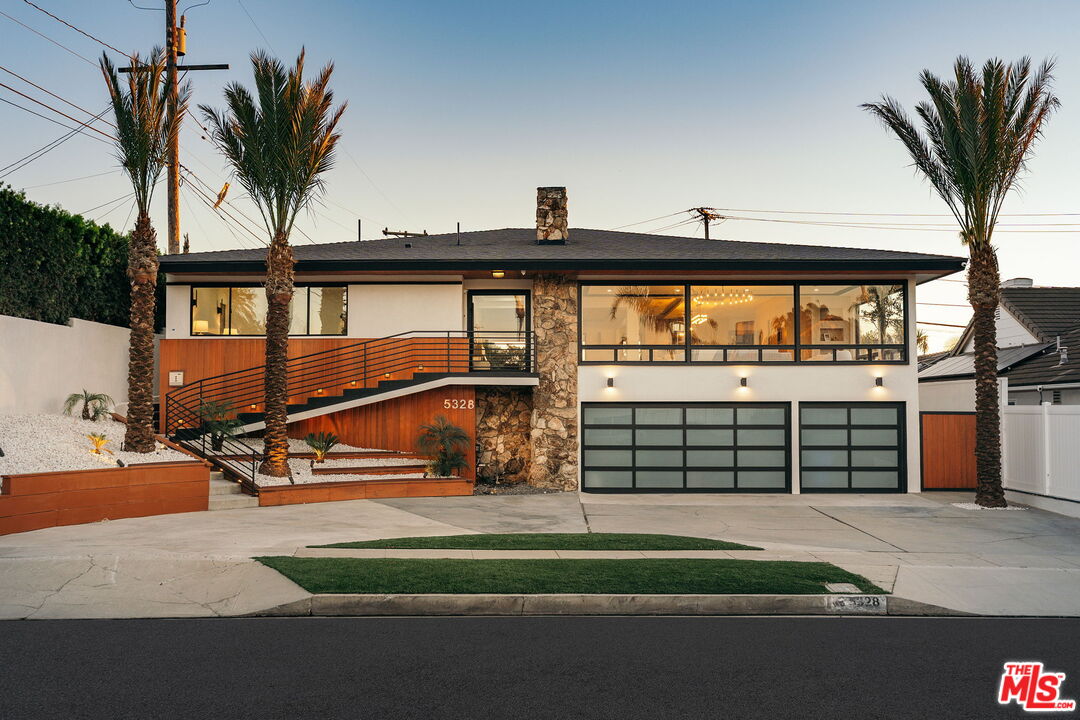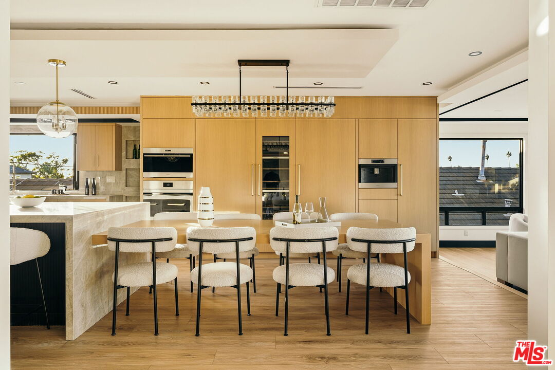 Welcome to this stunning contemporary home in the desirable Ladera Heights neighborhood, where modern elegance meets exceptional functionality. As you walk in through the impressive pivot front door, you are greeted by a sophisticated foyer featuring a wine glass enclosed display and a beautifully designed cove ceiling entry that sets the tone for the rest of the home. The inviting open floor plan seamlessly integrates the family room, which impresses with a state-of-the-art 100-inch TV and a cozy electric fireplace, while the living room features built-in bookshelves and expansive window walls that showcase breathtaking views of city lights and treetops, offering a perfect space for both relaxation and entertainment. Adjacent to the kitchen is a dedicated dining room, thoughtfully designed to accommodate gatherings with seating for eight at the dining table and four at the island counter top. The gourmet kitchen itself is a chef's dream, boasting an over sized island with Taj Mahal stone counter tops and a waterfall edge, complemented by custom cabinets and high-end Thermador appliances including a built-in refrigerator, freezer, wine cooler, and a Wolf 48-inch stove equipped with a pot filler overhead. Additional culinary conveniences include two ovens, a speed oven, two Bosch dishwashers, and a built-in coffee maker for your daily lattes. An accordion window perched above the farmhouse sink adds a unique touch, seamlessly connecting the indoor space to the outdoors, while three additional accordion doors throughout the home invite in natural light and fresh air. The primary bedroom suite serves as a personal sanctuary, complete with a lavish walk-in closet featuring built-in storage, an island, and chandelier, along with a stunning double shower that includes body sprays and a steam feature. Step outside to discover the outdoor space, truly an entertainer's paradise, featuring a spacious deck off the living room and primary bedroom, along with a fully equipped outdoor kitchen that boasts an eat-in bar accommodating approximately 10 or more people, topped with beautiful black onyx granite and a waterfall edge. This space also includes a built-in BBQ, sink, mini refrigerator, and TV, as well as a projector with an impressive 18 to 20-foot wall screen for movie nights. The over sized pool with a dramatic waterfall and beautifully landscaped grounds with palm trees and artificial grass complete this incredible outdoor oasis. This exceptional property also boasts all new electrical, plumbing, and roofing, as well as a new HVAC system with two separate Google thermostats for optimal climate control. Speakers throughout the primary bedroom and powder room enhance your living experience, making this home perfect for modern living. With a 3 car garage equipped with new doors and an EV charger, and conveniently located near shopping options like Trader Joe's, Sprouts, and Amazon Fresh, as well as just minutes from the beaches and LAX, this home offers an unparalleled lifestyle of luxury and convenience.