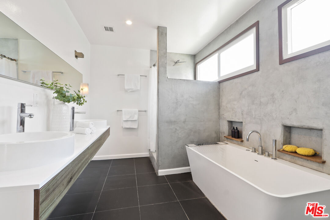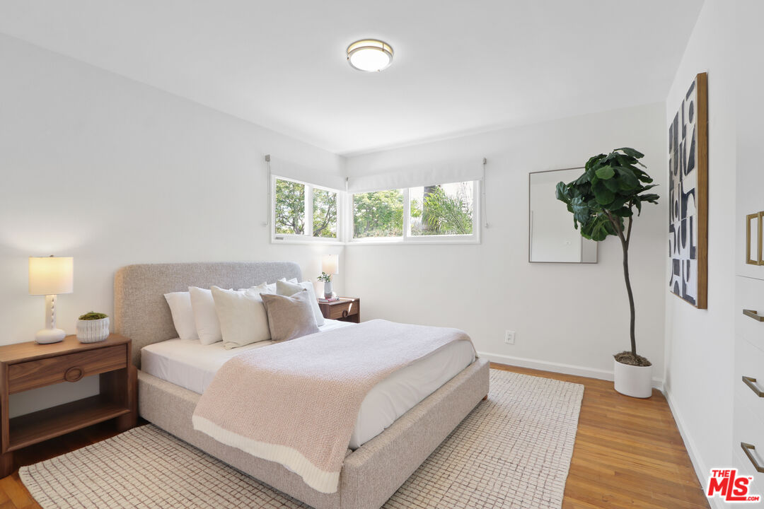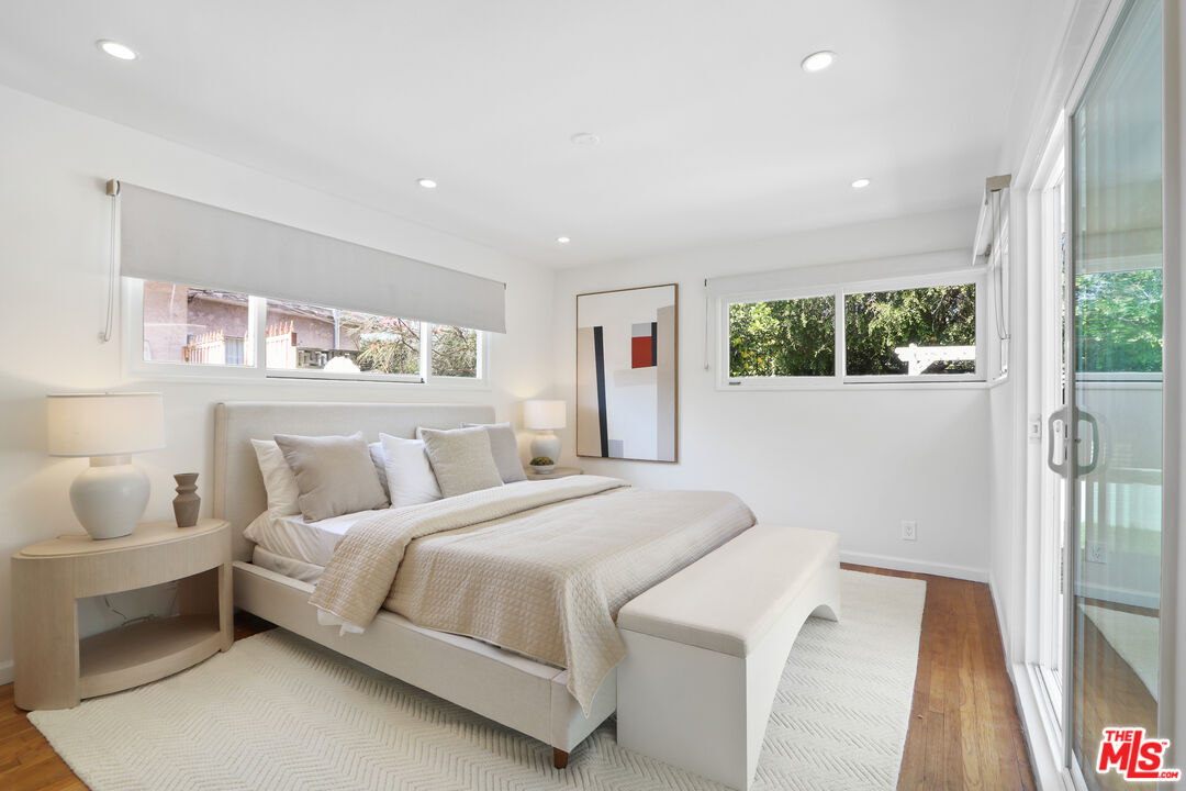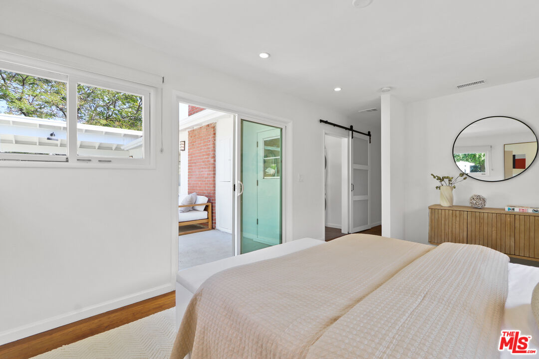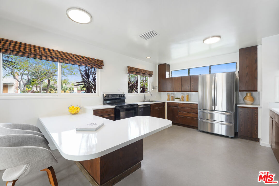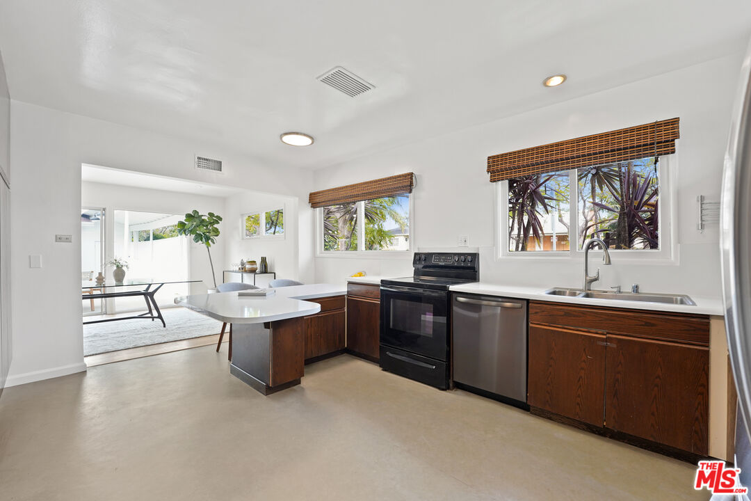This is a beautiful mid-century home with wonderful character situated on a large sought after corner lot. The living room features a stylish glassed-in gas fireplace and large glass doors leading to a back patio. The formal dining area is adjacent to the large kitchen and has views of the spacious patio and backyard. Every room has lovely window lines that bring in cheerful natural light. The primary bathroom is large, modern, and has both a walk-in shower and a chic designer stand-alone tub. The second bath is brand new, and beautifully designed with a gorgeous Italian vanity and custom tile. There are three large bedrooms, each with custom roll-up window blinds, and a very convenient laundry room with a newer LG washer and dryer. The large back-yard has several raised garden beds, a lemon tree, and a breezeway leading to a two car garage with extra space for storage. The water heater is tankless. This property is in a neighborhood located several blocks from a new metro line station and the recently completed Cumulus residential and retail development. Within Cumulus there is a Whole Foods grocery store, restaurants, gym, apartments, coffee shop and other amenities. Also nearby are HBO/Max and Apple office complexes.