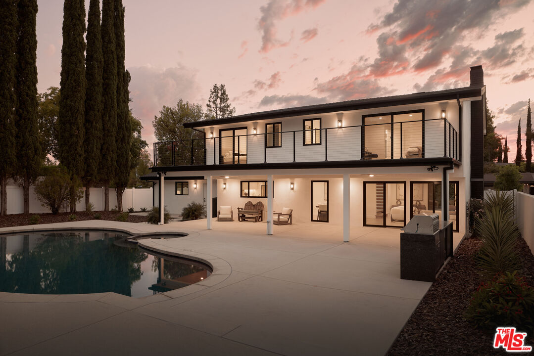 GORGEOUS MODERN FARMHOUSE IN PRIME WOODLAND HILLS. Completely renovated and beautifully designed, this stunning modern farmhouse offers an abundance of natural light and open living spaces. The main level features a spacious living room with a cozy fireplace, an elegant kitchen with a large walk-in pantry, and a family room that flows seamlessly to the backyard perfect for indoor-outdoor living. Upstairs, you'll find four spacious en-suite bedrooms, including a luxurious primary suite with a soaking tub, oversized shower, walk-in closet, and tranquil views. A convenient laundry area is also located on this level. The home has been fully remodeled, including updated systems throughout, and features a two-car garage. The expansive yard is an entertainer's dream complete with a covered patio, built-in BBQ with granite countertops, and a beautiful swimmer's pool surrounded by lush greenery. Situated on a large flat lot, this property offers both privacy and style in one of Woodland Hills' most sought-after neighborhoods.