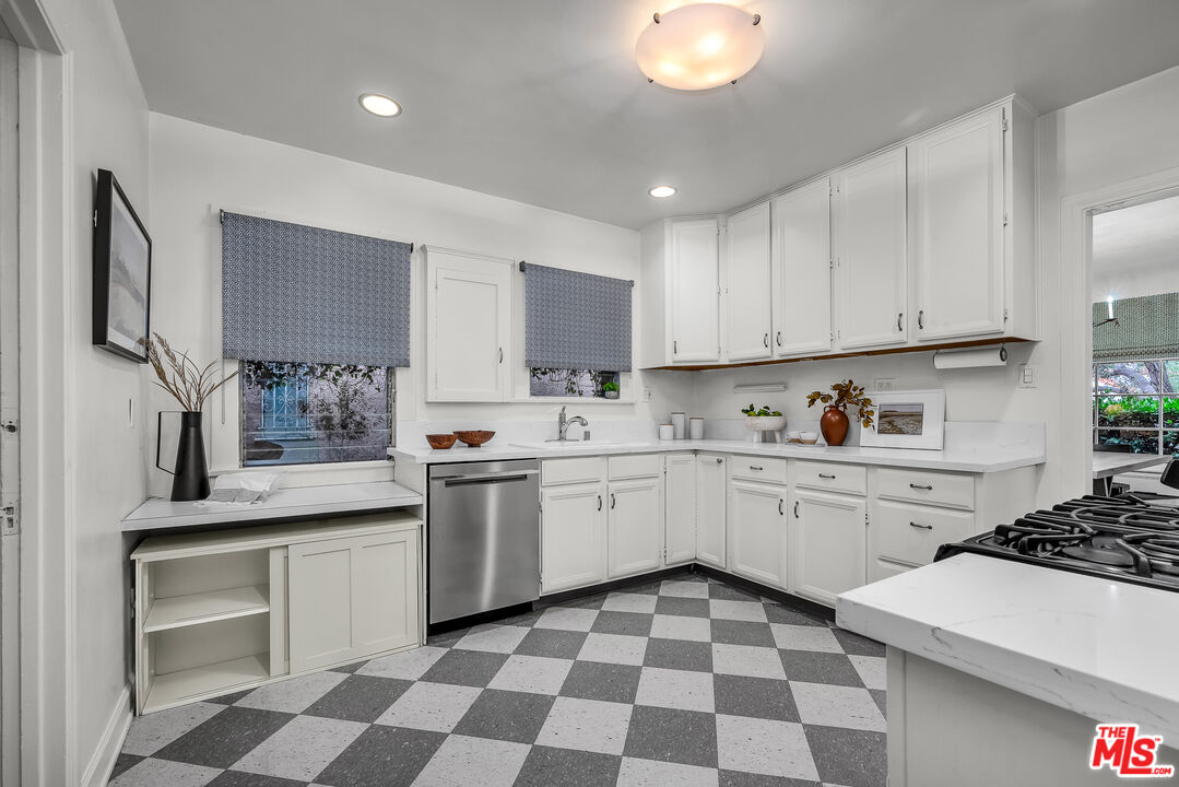 Ideally located in the heart of Larchmont Village, this charming home will captivate you from the moment you arrive. An electric gate opens to a secure driveway, offering both convenience and peace of mind. The inviting front patio provides the perfect spot to enjoy your morning coffee or unwind in the evening. Inside, a wealth of original architectural details awaits beautiful coved ceilings, arched doorways, and elegant French windows. The sunny, spacious living room features gleaming hardwood floors and a stunning Batchelder fireplace as its centerpiece. The formal dining room easily accommodates large gatherings, while the kitchen offers new countertops, ample storage, and an adjacent laundry room for added functionality. The large bathroom includes a tub and a comfortable vanity area, ideal for starting your day in style. The bright and airy primary bedroom offers a tranquil retreat, and the second bedroom opens directly to the private backyard an oasis with multiple areas for dining, relaxing or play. The converted garage serves as a versatile office or creative studio, complete with custom built-ins and French doors. Additional features include central air conditioning and a security system. Just blocks from Larchmont Boulevard's beloved shops, cafes, and boutiques, this very special home perfectly blends original character with modern comfort in one of Los Angeles's most desirable neighborhoods.