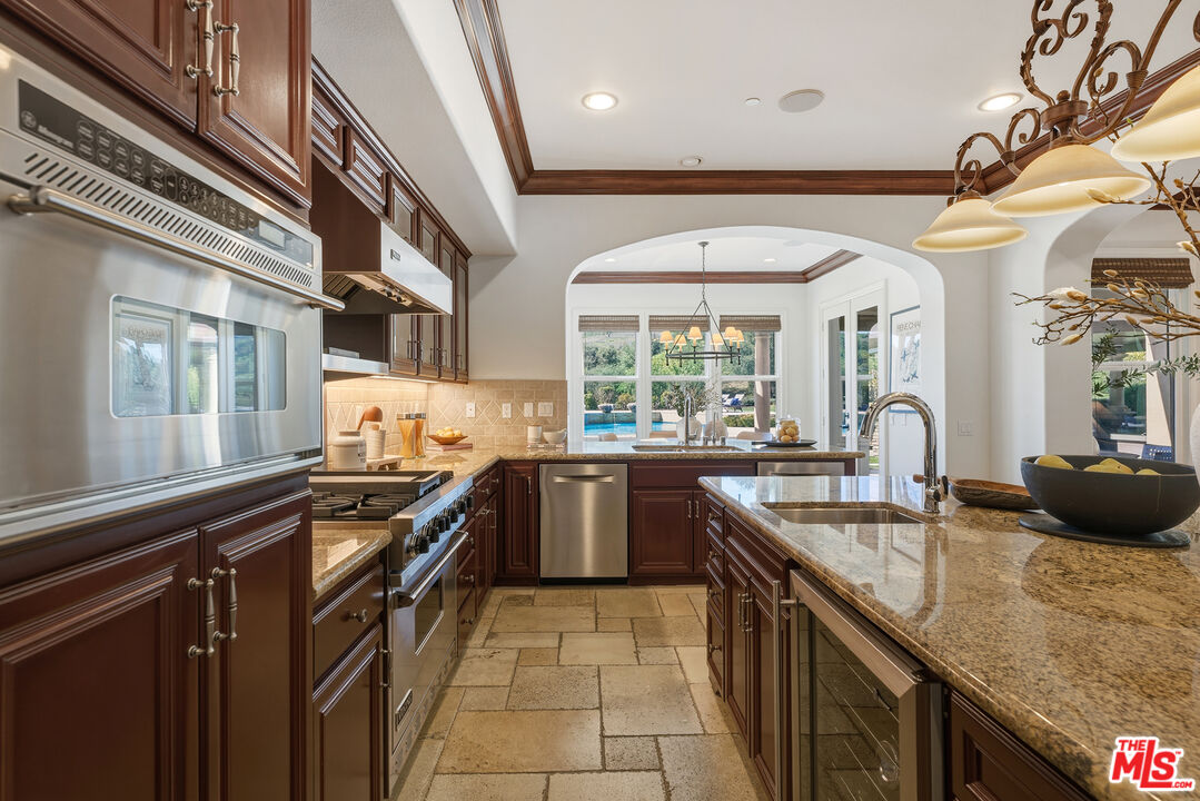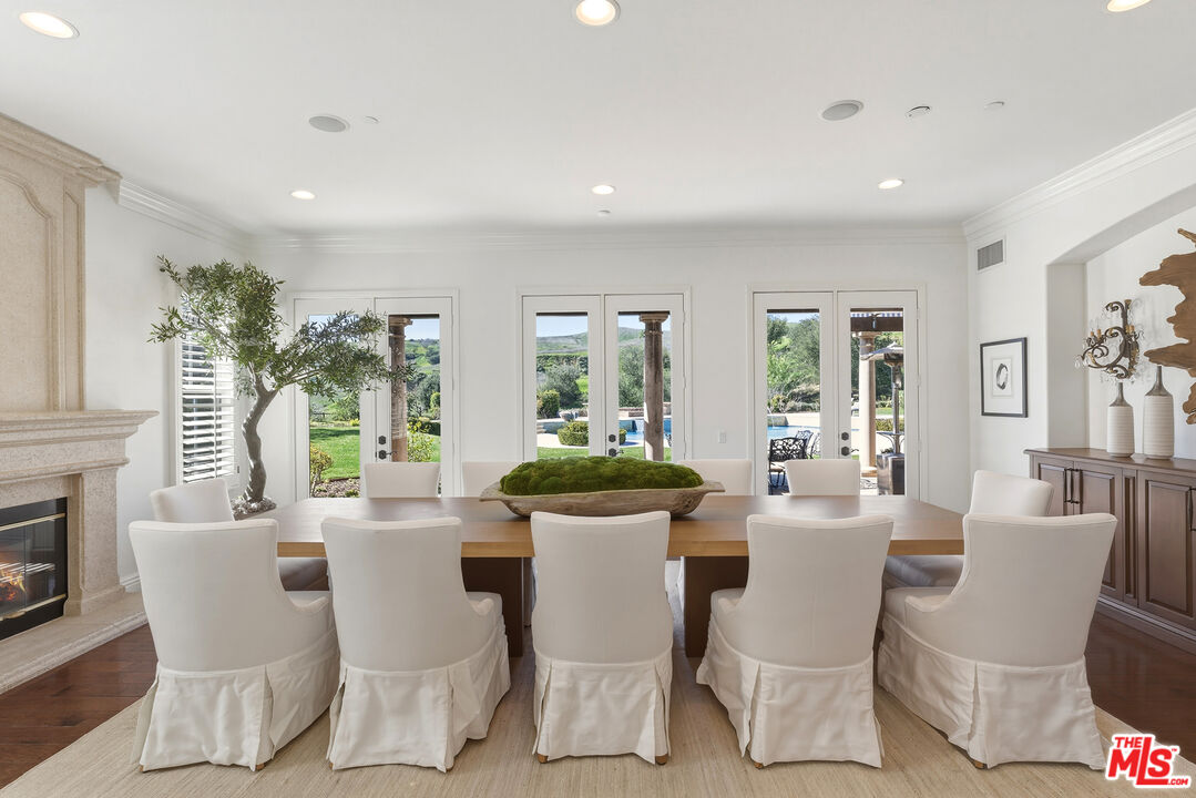 Located at the end of a quiet cul-de-sac within the prestigious guard-gated community of Mont Calabasas, this exceptional estate captures sweeping panoramic rolling hill views from nearly every vantage point. Set on an expansive 20,980 sq ft lot, the 4,994 sq ft residence blends refined design, thoughtful upgrades, and seamless indoor-outdoor living. A welcoming courtyard entry leads into a dramatic foyer highlighted by a grand spiral staircase, custom stone flooring and architectural archways that lead into the formal dining room. The generous dining room features a fireplace and three sets of French doors showcasing the incredible view and perfect for entertaining large groups. A cozy paneled den with outdoor access offers a respite to enjoy a glass of wine or catch up on work. The heart of the home is the open-concept eat-in kitchen and family room, designed to frame the breathtaking views. The chef's kitchen features a large center island, Viking appliances, Sub-Zero glass door refrigerator/freezer, double ovens, and two dishwashers. The adjacent double sized family room, enhanced with beamed ceilings, fireplace and built-ins, opens directly to the backyard, creating effortless flow for gatherings large and small. A large en-suite guest room that opens to the front patio as well as a powder room complete the first floor. Upstairs, the primary suite offers a private sanctuary with fireplace, large seating area and view balcony. The spa-like primary bath features separate vanities, separate tub and shower, spacious walk-in closet and access to the large balcony overlooking the pool. Three additional en-suite bedrooms and a versatile bonus room provide flexibility for a media room, game room, or additional lounge space. The generous laundry room is also on the second floor. The outdoor setting is a true retreat. Completed in 2015, the resort-style backyard includes a sparkling pool and spa with Jandy control system, an oversized infinity-edge hot tub, gas fire pit, and a stunning 30-foot round covered sitting area with fireplace, tongue-and-groove ceiling, and overhead electric heaters. The fully equipped BBQ area with outdoor sink and remote hot water heater makes year-round entertaining both comfortable and convenient - all set against unobstructed, panoramic views. Extensive upgrades enhance comfort and efficiency, including a 5-zone indoor/outdoor surround sound system, smart WiFi-enabled controls for pool, irrigation, lighting, and water systems, overhead garage storage with built-in cabinets and workbench, epoxy garage floors, modular emergency generator with transfer switch and Ring alarm system. Located within the award-winning Las Virgenes Unified School District and just minutes from hiking trails, parks, and the shopping and dining of The Commons at Calabasas, with convenient access to Malibu and the beaches, this Mont Calabasas residence offers privacy, sophistication, and extraordinary views in one of the area's most sought-after communities.