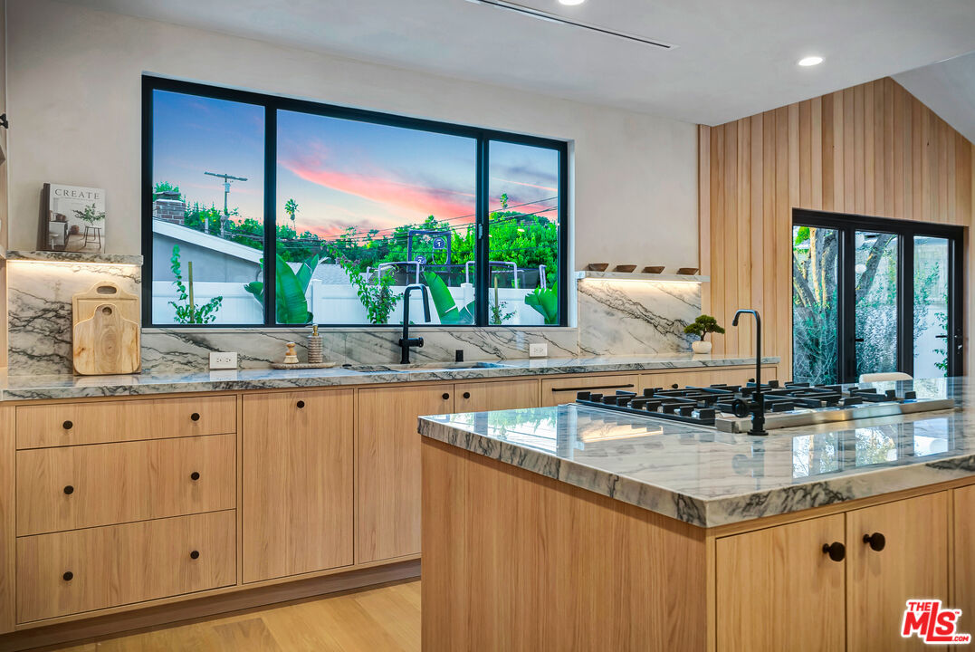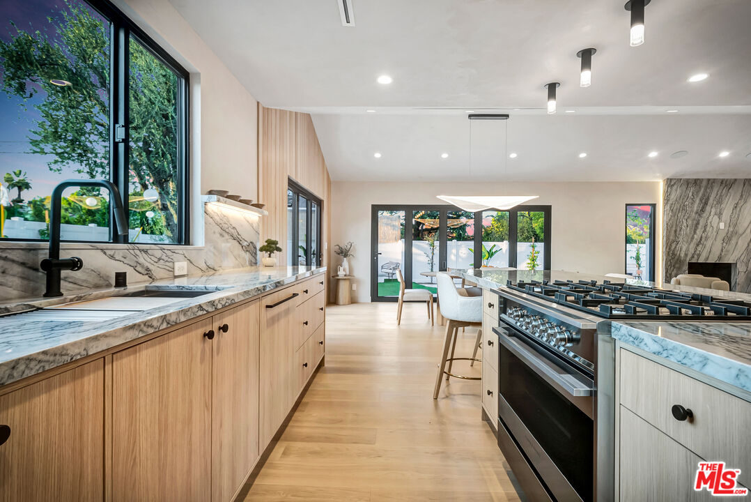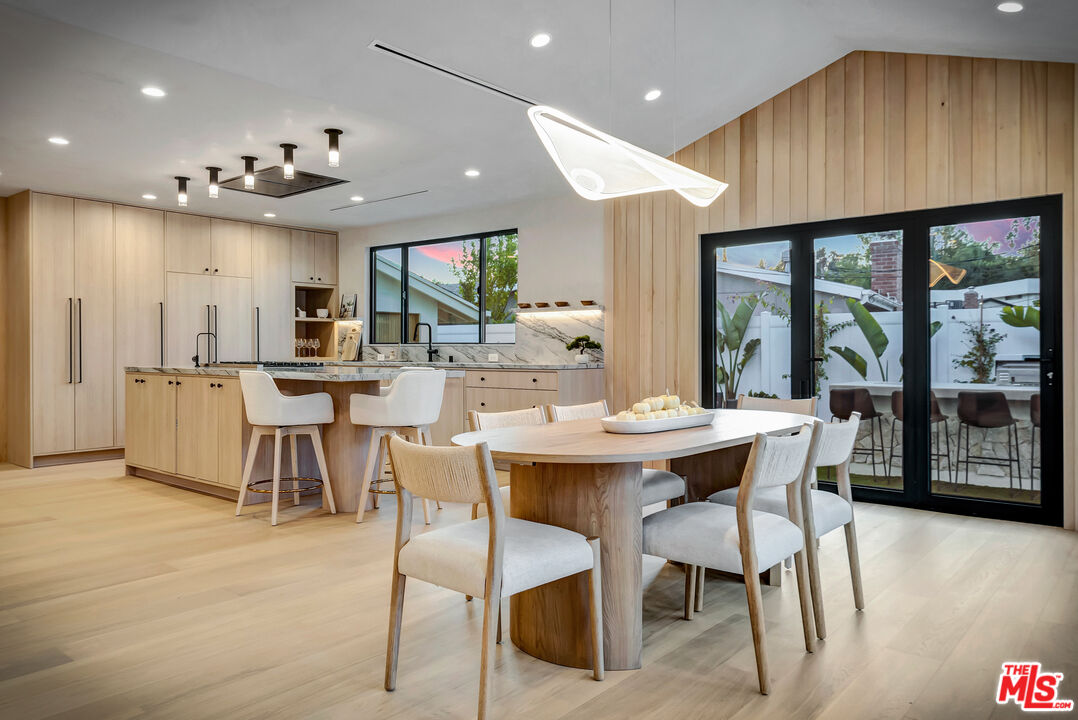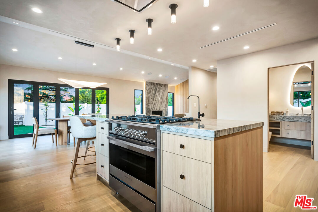 Rebuilt and reimagined from the studs, this stunning 4-bedroom, 3.5-bath residence exemplifies modern sophistication, superior craftsmanship, and timeless design. Every detail has been thoughtfully curated to create a seamless blend of luxury and functionality. The open-concept floor plan is filled with natural light and highlighted by smooth plaster walls and vaulted ceilings.The spacious living room features a striking wood paneled feature wall and custom fireplace that adds depth and sophistication. Perfect for both everyday living and entertaining, the seamless flow connects the living, dining, and kitchen areas effortlessly. The gourmet kitchen is a true centerpiece, featuring high-end appliances, designer fixtures, and a large center island. Sliding glass doors lead to a beautifully landscaped backyard retreat, complete with sparking pool, custom-built BBQ, firepit, and integrated sound system. Nearly every element of the home has been upgraded, including brand-new electrical, plumbing and HVAC systems and more. Other amenities include two primary bedrooms, a stunning powder room and a dedicated laundry room. Located close to premier shopping, dining, and entertainment this exceptional property offers the perfect combination of luxury, comfort, and convenience a rare opportunity to experience refined Woodland Hills living at its finest.