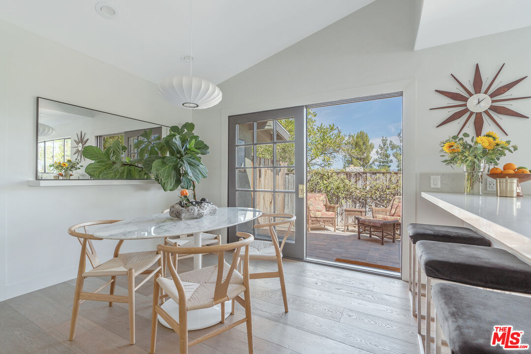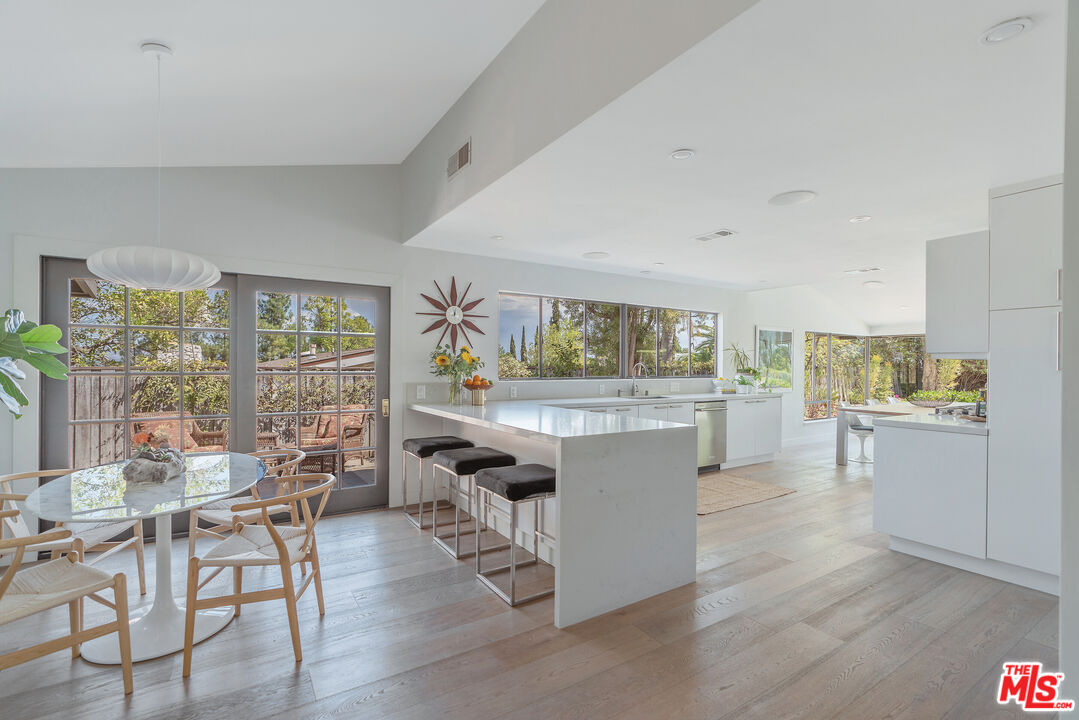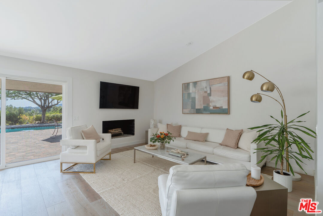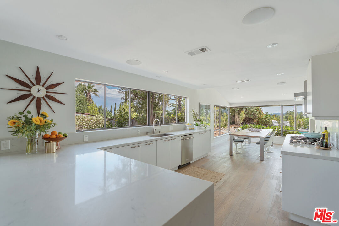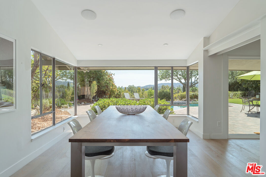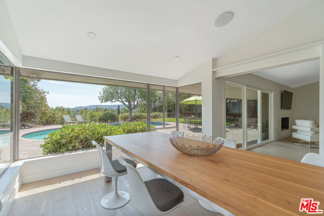 This Mid-Century stunner, in coveted Carlton Terrace, is perched near the crest of the street with sweeping valley and mountain views. Originally built in the 1950s by the neighborhood's developer for himself, this 3,000+ sq ft single-story home on a large private lot blends history, style and entertainer's appeal. Vaulted ceilings and wide plank hardwood floors frame sunlit, open living with designer details, including recessed lighting, built-in speakers and modern updates throughout. The sun-drenched kitchen shines with quartz counters, stainless appliances, custom cabinetry and a breakfast nook, while the adjoining dining room and living room boast panoramic views. The primary retreat features vaulted ceilings, a walk-in closet and a spa-like bath with dual vanities, honed marble tile and a rain shower with a picturesque view through privacy glass of the back yard. Two additional bedrooms with loads of closet space and built-ins share a sleek Jack-and-Jill bath. The family room, which could easily be converted to a 4th bedroom, is wired for surround sound, with a neighboring powder bath and large laundry room with hidden door. The outdoors of this special property are private and sprawling with a classic kidney shaped pool, ever-green yard, new paver patio and endless views. Situated on a street-to-street lot, the oversized garage offers parking for 2 cars plus additional storage. Close to all that's happening in Woodland Hills and Calabasas, with easy access to the 101 and beyond. This property is a truly modern oasis!