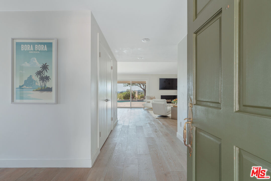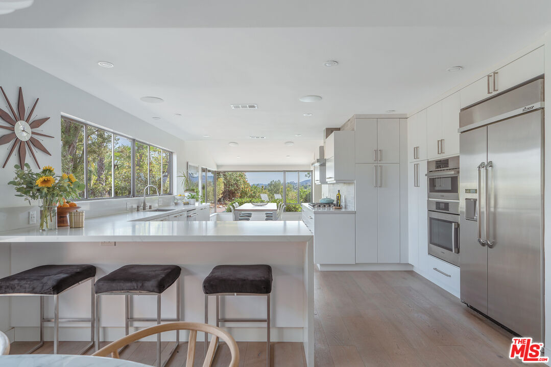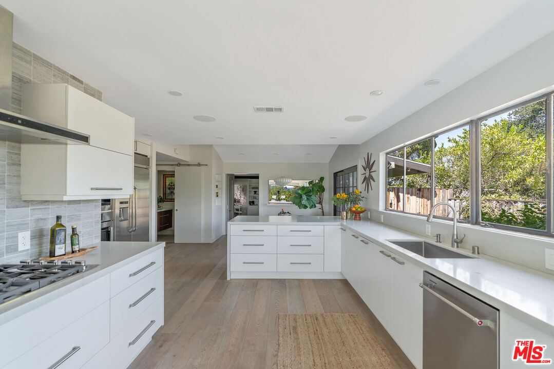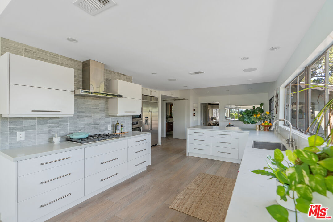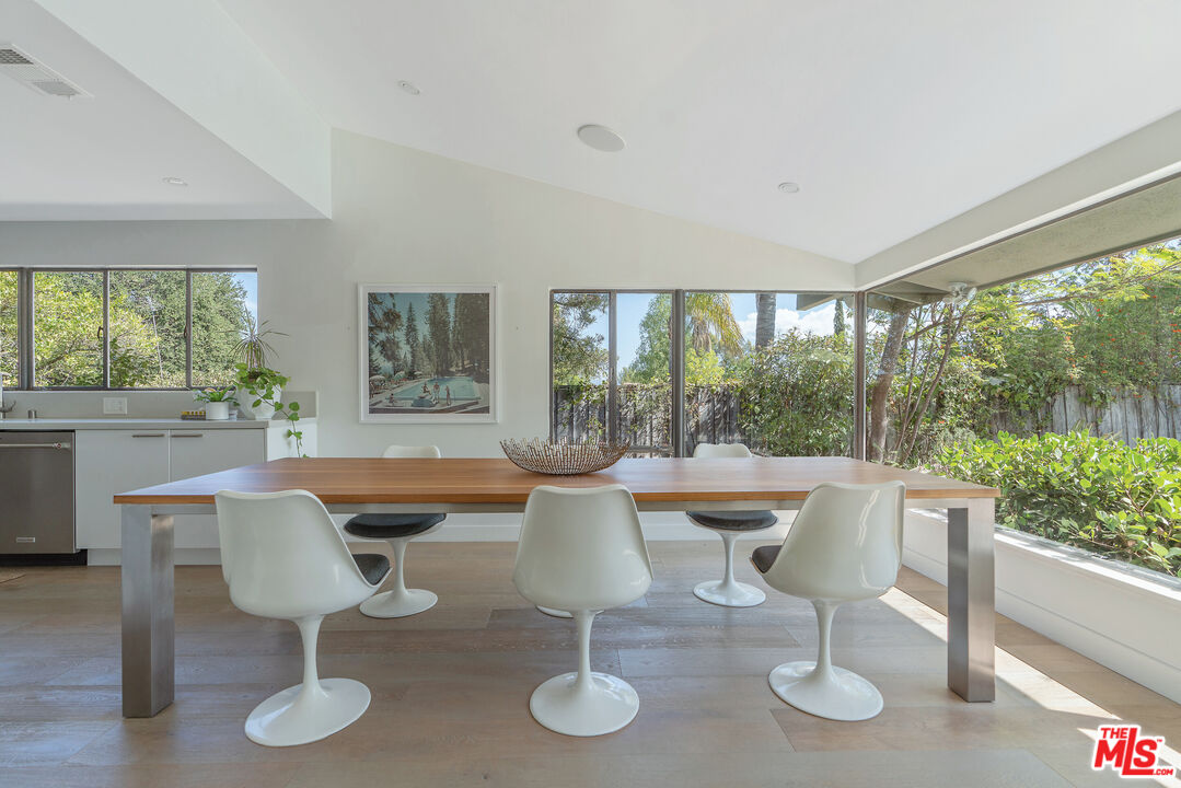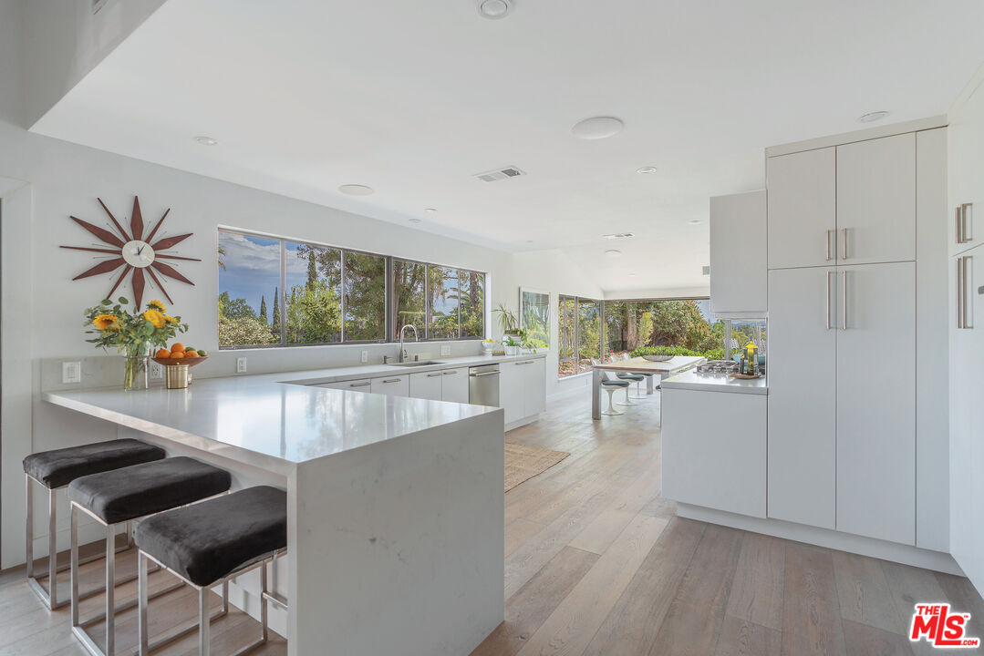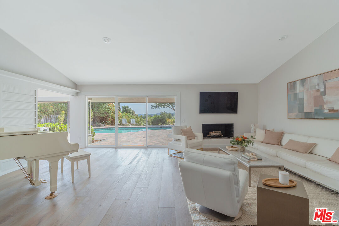 This Mid-Century stunner, in coveted Carlton Terrace, is perched near the crest of the street with sweeping valley and mountain views. Originally built in the 1950s by the neighborhood's developer for himself, this 3,000+ sq ft single-story home on a large private lot blends history, style and entertainer's appeal. Vaulted ceilings and wide plank hardwood floors frame sunlit, open living with designer details, including recessed lighting, built-in speakers and modern updates throughout. The sun-drenched kitchen shines with quartz counters, stainless appliances, custom cabinetry and a breakfast nook, while the adjoining dining room and living room boast panoramic views. The primary retreat features vaulted ceilings, a walk-in closet and a spa-like bath with dual vanities, honed marble tile and a rain shower with a picturesque view through privacy glass of the back yard. Two additional bedrooms with loads of closet space and built-ins share a sleek Jack-and-Jill bath. The family room, which could easily be converted to a 4th bedroom, is wired for surround sound, with a neighboring powder bath and large laundry room with hidden door. The outdoors of this special property are private and sprawling with a classic kidney shaped pool, ever-green yard, new paver patio and endless views. Situated on a street-to-street lot, the oversized garage offers parking for 2 cars plus additional storage. Close to all that's happening in Woodland Hills and Calabasas, with easy access to the 101 and beyond. This property is a truly modern oasis!