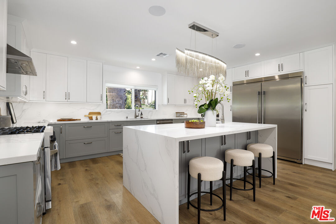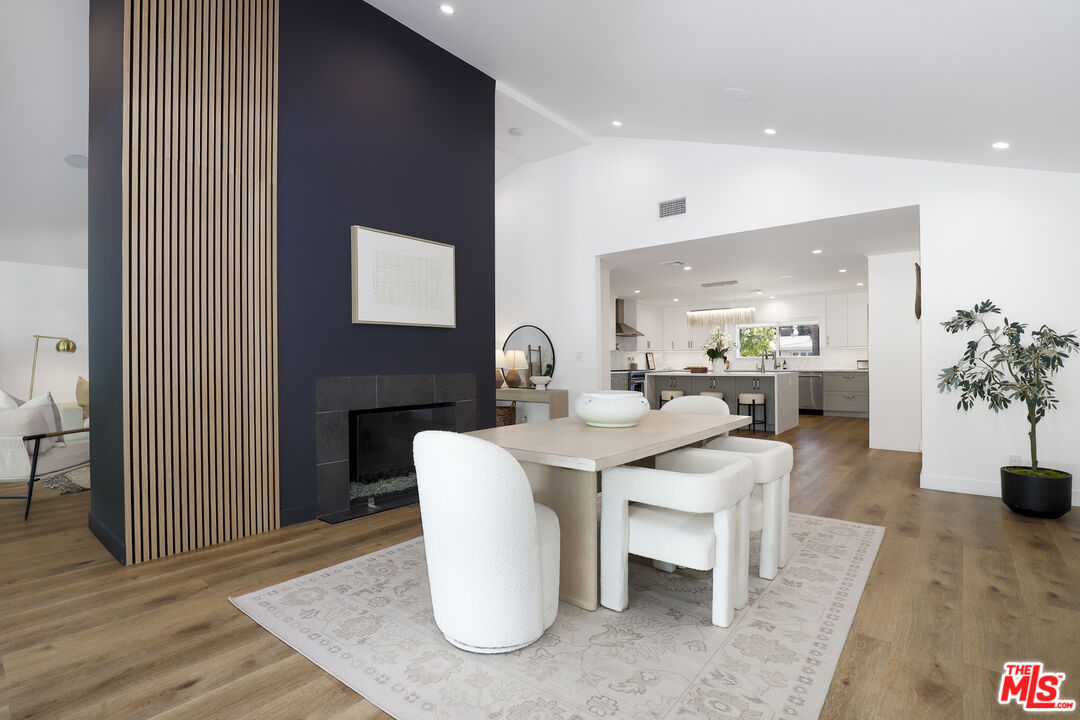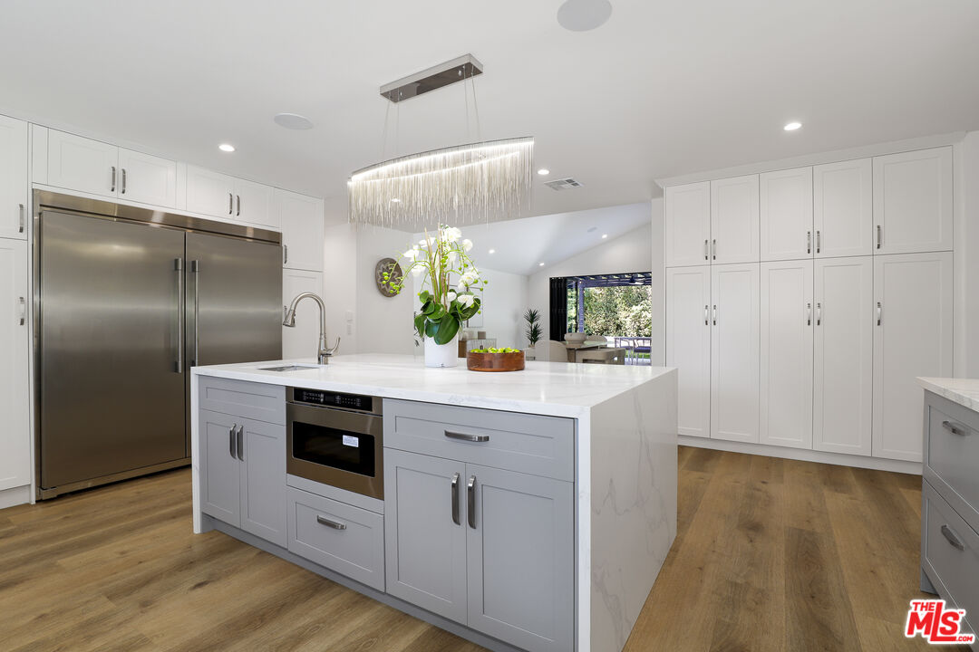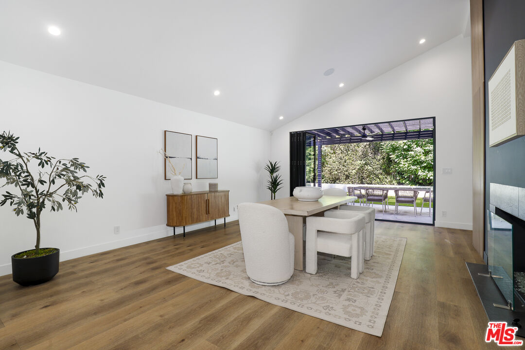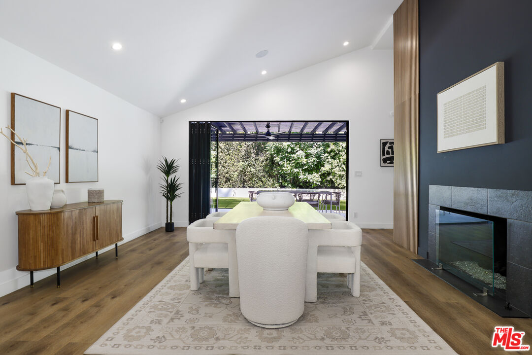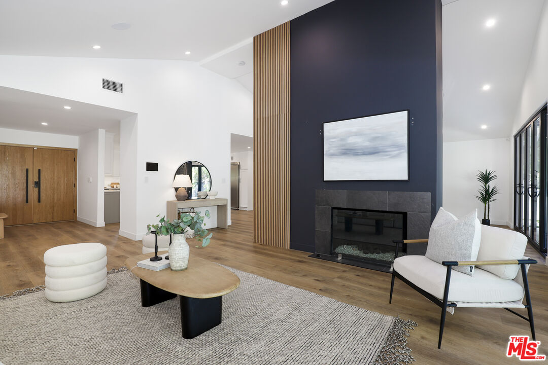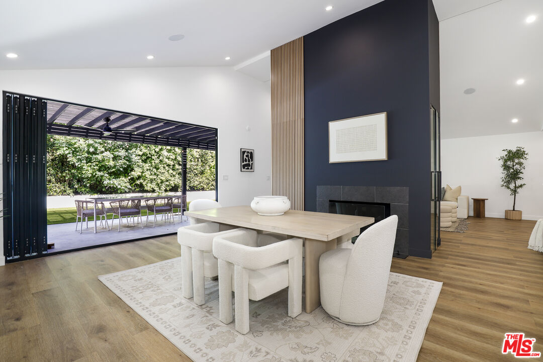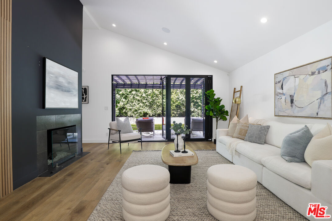 A masterclass in modern California luxury, this exquisitely reimagined single-story estate originally designed by renowned mid-century architect Charles DuBois is privately set on a tranquil cul-de-sac in the heart of Woodland Hills. From the moment you arrive, dramatic custom double doors reveal a residence defined by scale, light, and seamless indoor-outdoor living. Soaring ceilings and expansive sightlines frame an open-concept layout adorned with rich wood flooring and sophisticated Lutron lighting throughout. The grand living and dining spaces are anchored by a striking double-sided fireplace, while 12-foot folding glass doors dissolve the boundary between interior elegance and outdoor indulgence creating an effortless flow to a true resort-caliber backyard. At the heart of the home, a showpiece gourmet kitchen is designed for both elevated entertaining and everyday luxury, featuring premium Thor Kitchen appliances, a full side-by-side refrigerator and freezer, wine refrigeration, quartz surfaces, a statement pot filler, and a generous pantry. The primary suite is a private sanctuary complete with its own fireplace, direct access to the grounds, and a spa-inspired bath boasting dual vanities, an oversized multi-head shower, and a sleek LED-lit mirror. A secondary primary suite offers its own bespoke en-suite bath, ideal for guests or multigenerational living. Cutting-edge smart home integration enhances every aspect of daily living, including whole-home lighting, climate control, and a dual-zone indoor/outdoor Sonos sound system. A comprehensive Ring security system provides peace of mind. Outdoors, the estate transforms into a private oasis featuring a sparkling pool, expansive lawn, built-in fire feature, and a fully equipped outdoor kitchen with BBQ, cooktop, sink, and refrigeration perfectly curated for al fresco dining and entertaining under the California sky. No detail has been overlooked, with extensive upgrades including new windows, doors, plumbing, electrical systems, and a tankless water heater. Located just moments from the vibrant energy of Warner Center, premier shopping, and dining, this is a rare offering that embodies both timeless design and contemporary luxury.