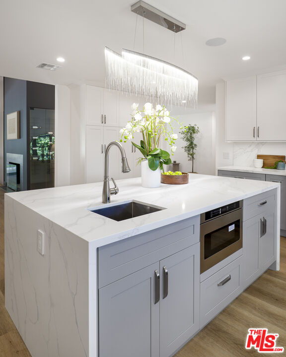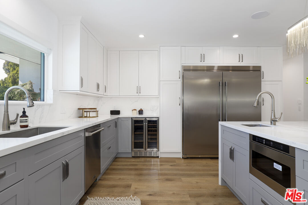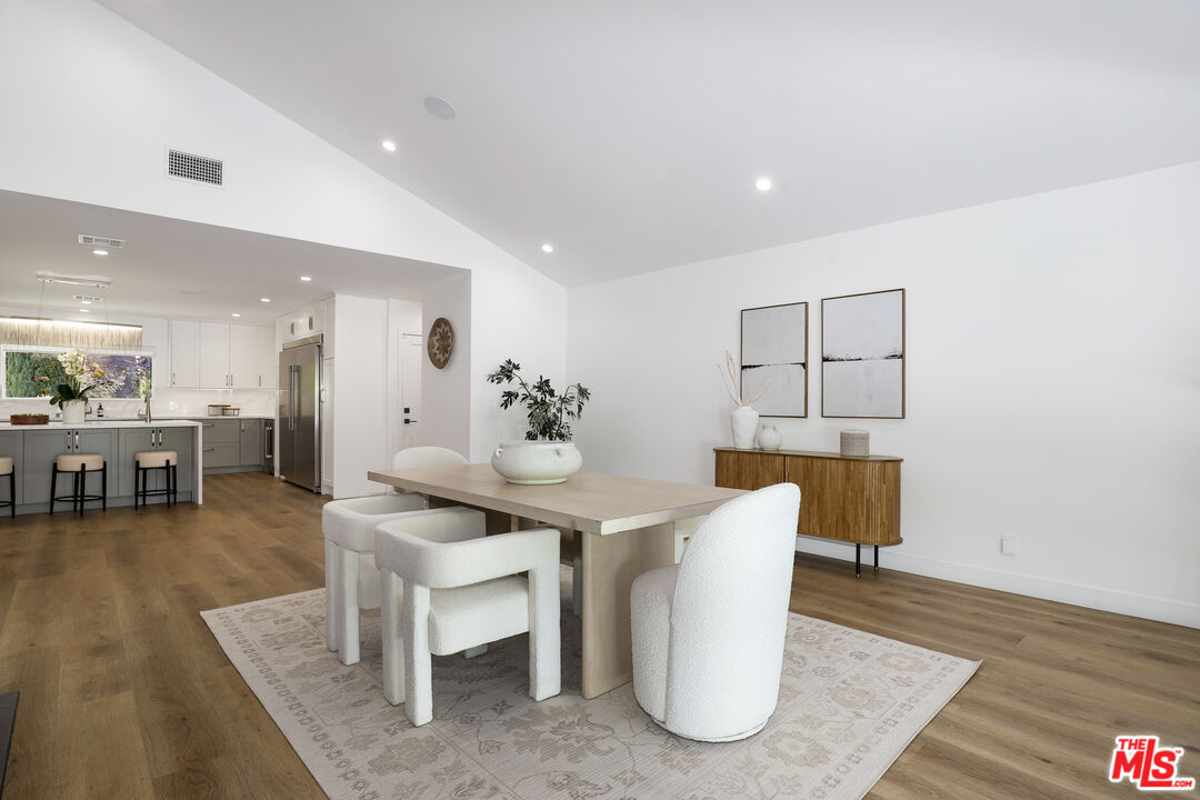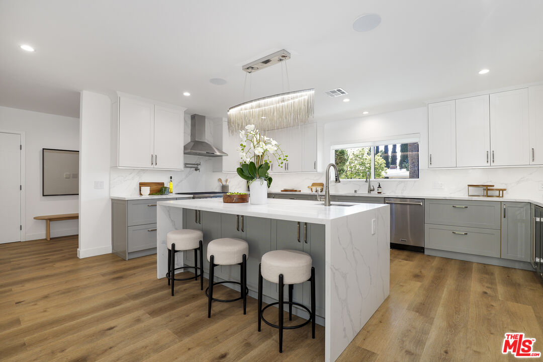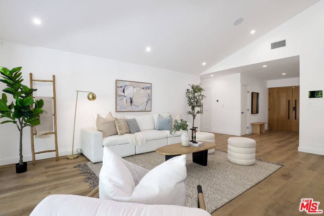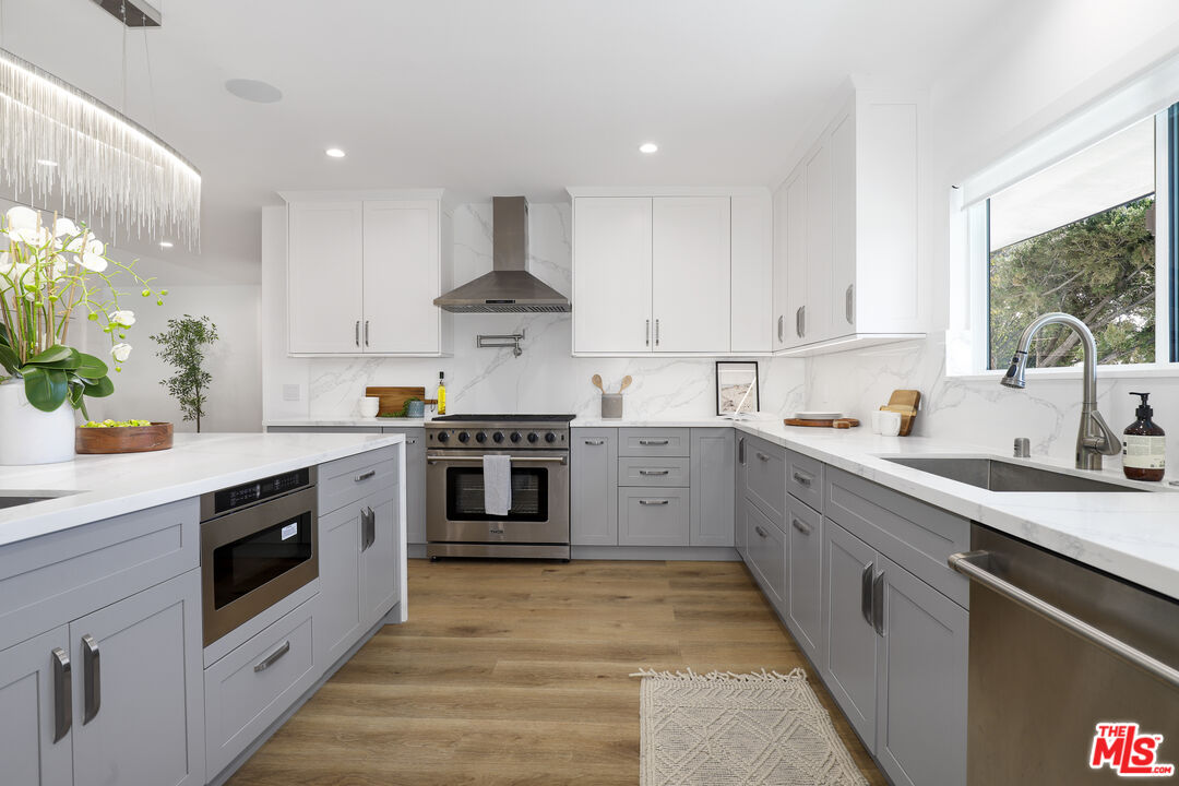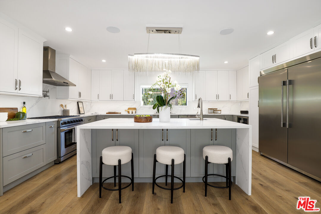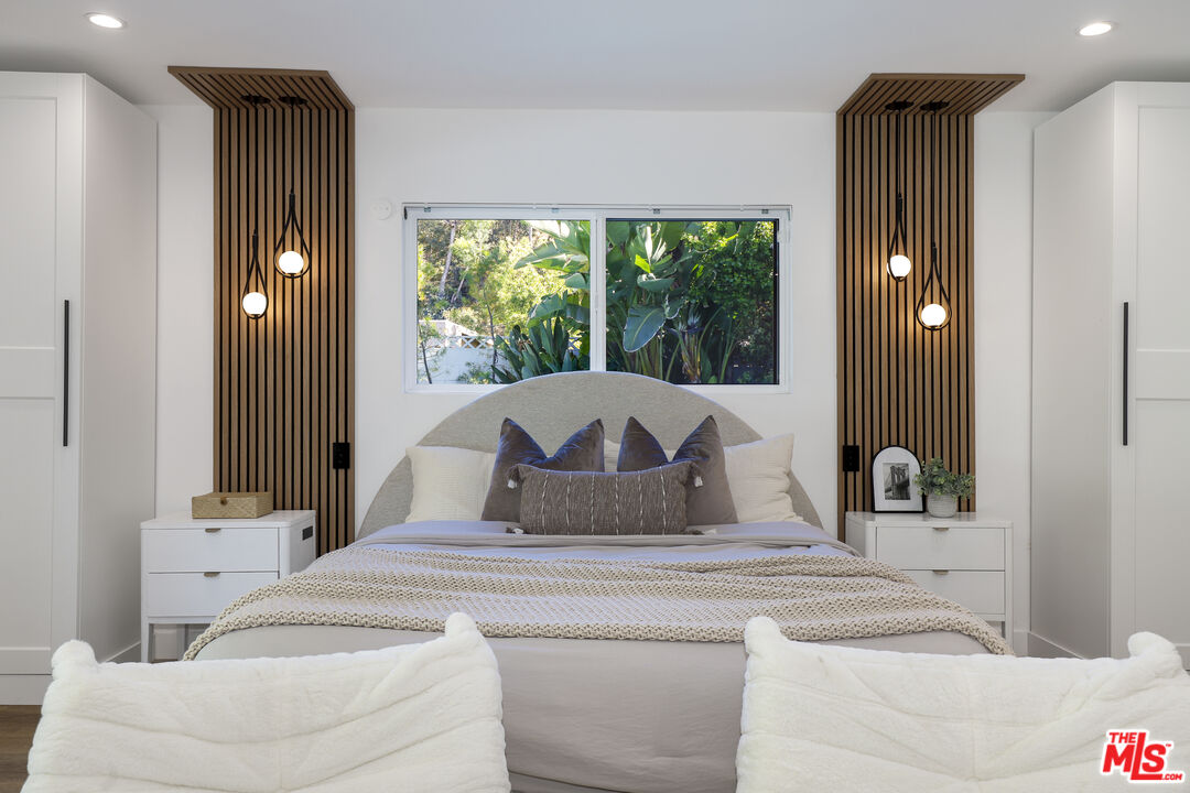 A masterclass in modern California luxury, this exquisitely reimagined single-story estate originally designed by renowned mid-century architect Charles DuBois is privately set on a tranquil cul-de-sac in the heart of Woodland Hills. From the moment you arrive, dramatic custom double doors reveal a residence defined by scale, light, and seamless indoor-outdoor living. Soaring ceilings and expansive sightlines frame an open-concept layout adorned with rich wood flooring and sophisticated Lutron lighting throughout. The grand living and dining spaces are anchored by a striking double-sided fireplace, while 12-foot folding glass doors dissolve the boundary between interior elegance and outdoor indulgence creating an effortless flow to a true resort-caliber backyard. At the heart of the home, a showpiece gourmet kitchen is designed for both elevated entertaining and everyday luxury, featuring premium Thor Kitchen appliances, a full side-by-side refrigerator and freezer, wine refrigeration, quartz surfaces, a statement pot filler, and a generous pantry. The primary suite is a private sanctuary complete with its own fireplace, direct access to the grounds, and a spa-inspired bath boasting dual vanities, an oversized multi-head shower, and a sleek LED-lit mirror. A secondary primary suite offers its own bespoke en-suite bath, ideal for guests or multigenerational living. Cutting-edge smart home integration enhances every aspect of daily living, including whole-home lighting, climate control, and a dual-zone indoor/outdoor Sonos sound system. A comprehensive Ring security system provides peace of mind. Outdoors, the estate transforms into a private oasis featuring a sparkling pool, expansive lawn, built-in fire feature, and a fully equipped outdoor kitchen with BBQ, cooktop, sink, and refrigeration perfectly curated for al fresco dining and entertaining under the California sky. No detail has been overlooked, with extensive upgrades including new windows, doors, plumbing, electrical systems, and a tankless water heater. Located just moments from the vibrant energy of Warner Center, premier shopping, and dining, this is a rare offering that embodies both timeless design and contemporary luxury.