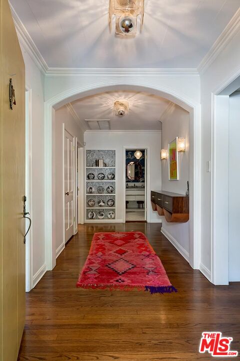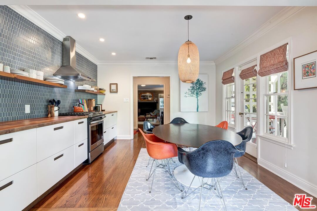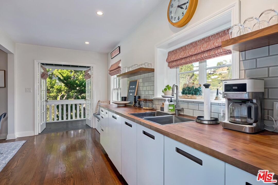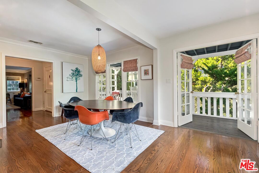 Nestled within one of Beachwood Canyon's most coveted enclaves, this exquisite bungalow seamlessly blends timeless character with sophisticated designer finishes. A gracious entry welcomes you into a spacious living room with custom built-in bookcases and a classic fireplace, setting an inviting yet refined tone. The thoughtfully designed open floor plan connects the expansive kitchen and dining area, featuring abundant custom storage, a statement Classic refrigerator, stainless steel appliances, and elegant double French doors that open to a charming front deck, perfect for alfresco dining or intimate evening gatherings. The generous primary suite offers a serene sanctuary with a walk-in closet and double-door access to the lush outdoor space. The spa-like hall bath is beautifully appointed with a clawfoot soaking tub, walk-in shower, and marble-topped vanity. A well-proportioned second bedroom is ideal as a guest suite, sophisticated home office, or den, while the designer powder room provides a polished touch for entertaining. Rich hardwood floors flow throughout the residence, complemented by custom window treatments on every window and door. A substantial laundry room adds exceptional functionality and storage, while the attic accessible from the hall closet offers valuable additional space. Outdoors, discover a private backyard retreat featuring expansive, leveled decks designed for effortless entertaining or tranquil evenings under the stars. The garage provides versatile use as 2 car parking, a studio, or executive office and includes its own half bath. Additional highlights include a brand-new roof (December 2025), new HVAC 2024, a rare street-to-street lot, and no rear neighbors delivering remarkable privacy and serenity in one of Los Angeles' most enchanting neighborhoods.