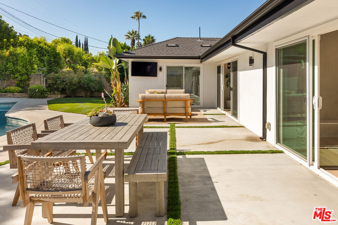 Stunning Mid-Century Charles DuBois Architectural with Pool in Prime Woodland Hills. Located on a desirable corner lot in one of the most sought-after areas of Woodland Hills, this impeccably remodeled Mid-Century Charles DuBois home offers over 3,000 sq ft of thoughtfully designed living space with 4 bedrooms and 3.5 bathrooms. Step through a custom oversized front door into a sun-drenched, open-concept interior featuring soaring ceilings with exposed beams, wide-plank white oak floors, and a dramatic Venetian plaster double-sided fireplace separating the formal living and dining areas. The chef's kitchen is a showpiece designed for both entertaining and everyday living. Highlights include a striking waterfall island, sleek wood and glossy white cabinetry, gold vein Calacatta countertops, and top-tier appliances including a panel-covered Fisher & Paykel fridge, Miele dishwasher, Frigidaire double oven, and Thor gas range. No detail was overlooked in this one-of-a-kind renovation: designer light fixtures, floating vanities, custom accent walls, solid extra-tall wood doors, and premium tile and finish selections throughout. The luxurious primary suite features cathedral ceilings with a central beam, a spa-like bath with a freestanding tub, floating double vanity, oversized walk-in shower, and a massive custom walk-in closet. Additional highlights include a spacious laundry room and pantry with smart controls, and a separate en-suite bedroom located on the opposite wing of the home ideal for guests or multigenerational living. Step outside to a private resort-like entertainer's backyard with newly designed hardscape, lush modern landscaping, and a large sparkling pool. Major upgrades include newer roof, dual HVAC systems, updated electrical panel, tankless water heater, recessed lighting, CAT wiring, plumbing, all new pool equipment and solar panels for the house which offers a huge savings. A detached garage with a private side entrance offers excellent ADU potential. Ideally located near top-rated charter schools, Bristol Farms, Calabasas Commons, Topanga Village, and the beloved local Farmer's Market, with quick access to the 101 freeway. The best value in Woodland Hills based on quality remodel, lot size, privacy and location.