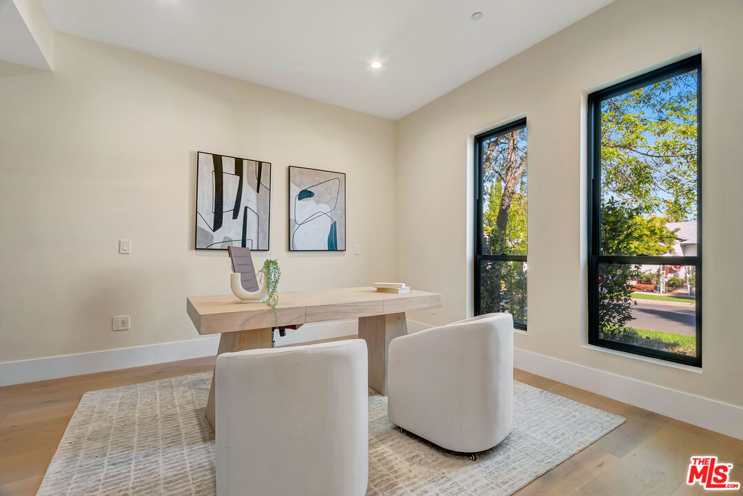 Welcome to this newly rebuilt contemporary estate, perfectly situated north of the boulevard in one of Encino's most sought-after neighborhoods. Set on a highly desirable street, this home offers an exceptional blend of timeless design, refined finishes, and modern luxury living. The main residence features 4 spacious en-suite bedrooms and 4.5 impeccably designed bathrooms across approximately 2,039 sq ft of living space, all on a 5,499 sq ft lot. Reconstructed nearly from the ground up with only a small portion of the original foundation retained home reflects expert craftsmanship and meticulous attention to detail throughout. A dramatic foyer introduces a sprawling open-concept floor plan thoughtfully designed to maximize natural light and interior volume. Soaring ceilings, expansive picture windows, and seamless indoor-outdoor transitions define the living areas. The formal living and dining rooms are enhanced by sophisticated architectural elements, creating an ideal setting for both intimate gatherings and large-scale entertaining. The primary suite serves as a private sanctuary, complete with a luxurious walk-in shower, custom vanity, and a beautifully appointed built-in closet. Glass sliders open directly to the professionally landscaped backyard, where a sparkling pool and spa are surrounded by lush greenery perfect for alfresco dining, morning coffee, or serene evening relaxation. The brand-new detached ADU adds an additional 1,066 sq ft of versatile living space. It includes 2 bedrooms, 2.5 bathrooms, a full kitchen, in-unit laundry, a private entrance, a separate backyard, and its own electrical meter, ideal for rental income, multigenerational living, or guest accommodations. Both the main residence and ADU are equipped with fully paid-off solar panels, offering energy efficiency and long-term savings.