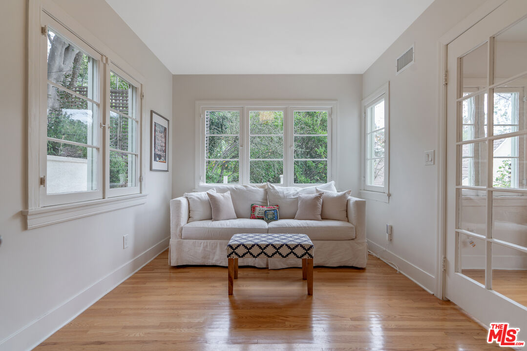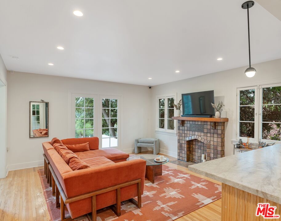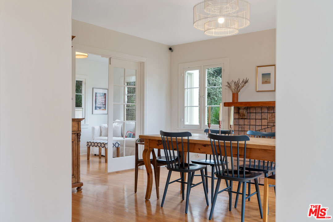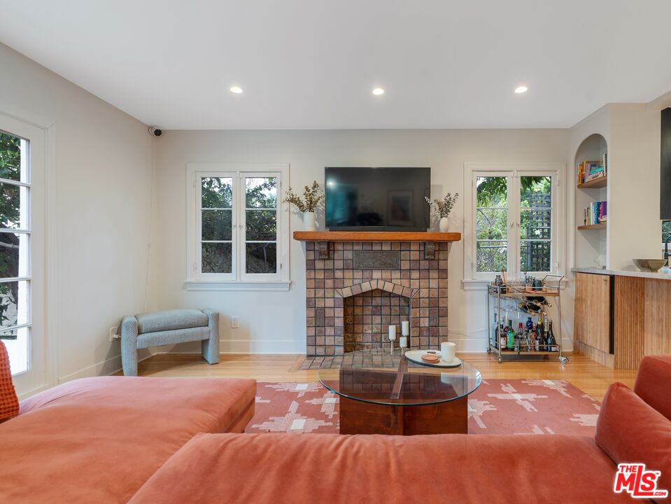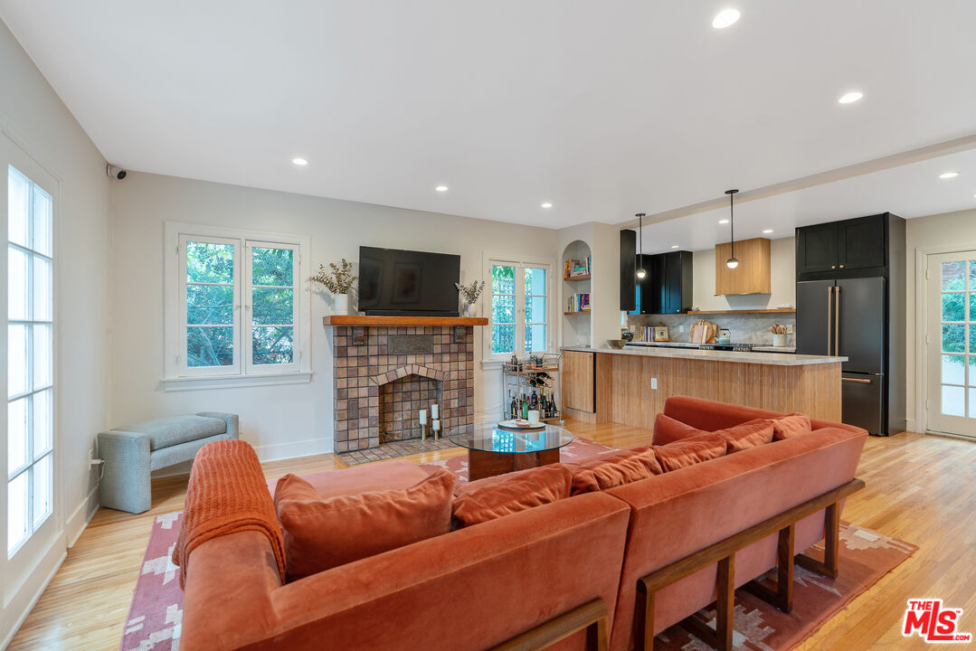 Set in the hillside of Beachwood Canyon, this thoughtfully restored Spanish Colonial Revival residence captures the appeal of its 1924 origins while embracing modern functionality. The home's original bones immediately stand out, from beautiful old windows and Batchelder-style tiled fireplaces to graceful archways and built-in details that reflect the craftsmanship of another era. Positioned high enough to enjoy sweeping views yet still connected to the neighborhood and city below, the home offers a rare sense of calm. Sunrise views from the bedrooms unfold across the canyon, creating a peaceful morning ritual. The thoughtful layout creates a seamless flow to the interior while emphasizing light, space, and views throughout. The interior features a bright, open layout with refinished white oak flooring, restored original windows and doors, and fresh interior and exterior paint. Recessed lighting enhances the main living areas and primary suite, while curated fixtures and architectural details add warmth. The kitchen blends performance and design with Taj Mahal leathered quartzite countertops, new soft-close cabinetry, and gorgeous Energy Star appliances, including a GE Cafe range, refrigerator, dishwasher drawers, and an LG washer and dryer. A vintage Murano chandelier adds a distinctive entry moment. Major systems have been updated, including a new roof with a 20 year warranty, a two-zone energy-efficient HVAC system with smart thermostats, an energy-efficient electric water heater, updated plumbing and electrical, a new electrical panel, foundation bolting and structural reinforcement, and a newly lined sewer main with a 25 year guarantee. Outdoor living extends the home's design with French drains, drought-tolerant landscaping with drip irrigation, exterior utility hookups for a future patio kitchen, a custom front entry gate, and a custom mahogany garage door. The terraced garden and patio create a private backyard oasis. Located in a scenic hillside setting with convenient access to Gelson's, The Oaks Market and Cafe, dining, cultural destinations, and outdoor amenities, this residence offers classic Los Angeles architecture enhanced by thoughtful upgrades, views, and a seamless indoor-outdoor connection.