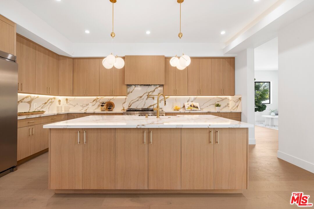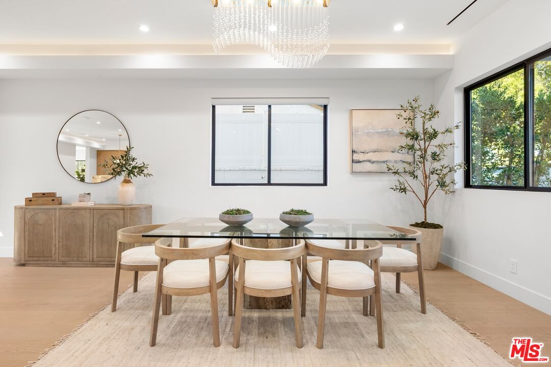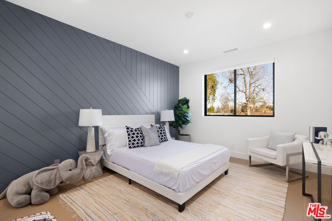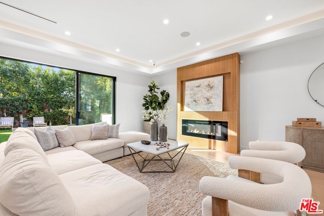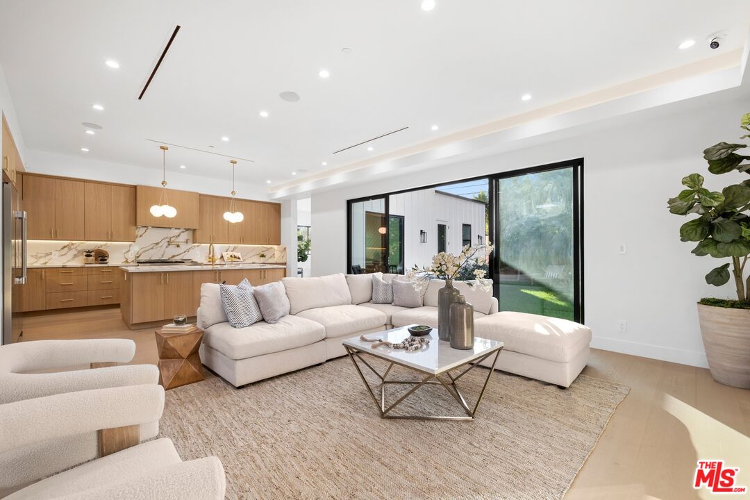 Nestled on a quiet, tree-lined street, experience modern luxury in this newly built Encino gem, where high-end finishes and impeccable design shine. The bright, open floor plan is flooded with natural light from soaring ceilings and expansive windows, creating an airy, inviting atmosphere. The sleek chef's kitchen, featuring an oversized island, custom cabinetry, and top-of-the-line appliances, flows effortlessly into the entertainer's backyard, complete with a built-in BBQ, bar seating, and lush grassy areas. Upstairs, the primary suite offers vaulted ceilings, a cozy fireplace, a walk-in closet, and a spa-like bathroom with a soaking tub, walk-in shower, dual vanity, and a private balcony. Two additional en-suite bedrooms complete the upper level. A spacious attached two-bedroom ADU adds versatility, perfect for guests or a home office. Modern upgrades include a smart home system, surround sound, and security cameras. This home is located minutes from Encino's top dining, shopping, and schools, offering you the ultimate in convenience and quality living.