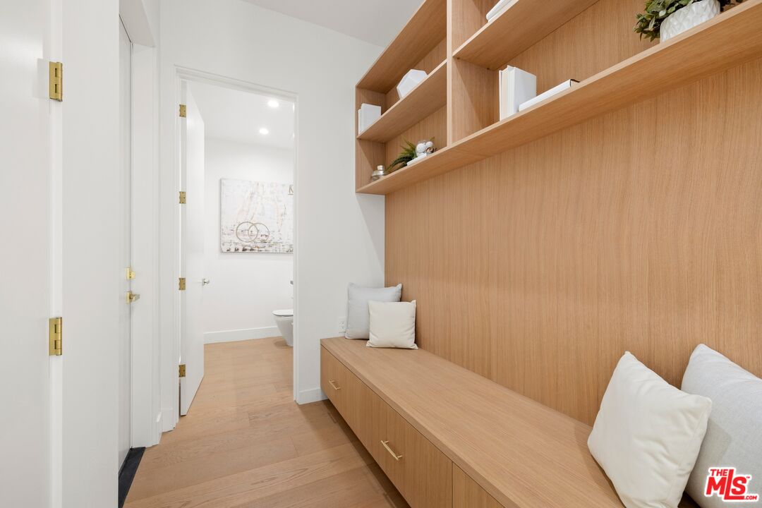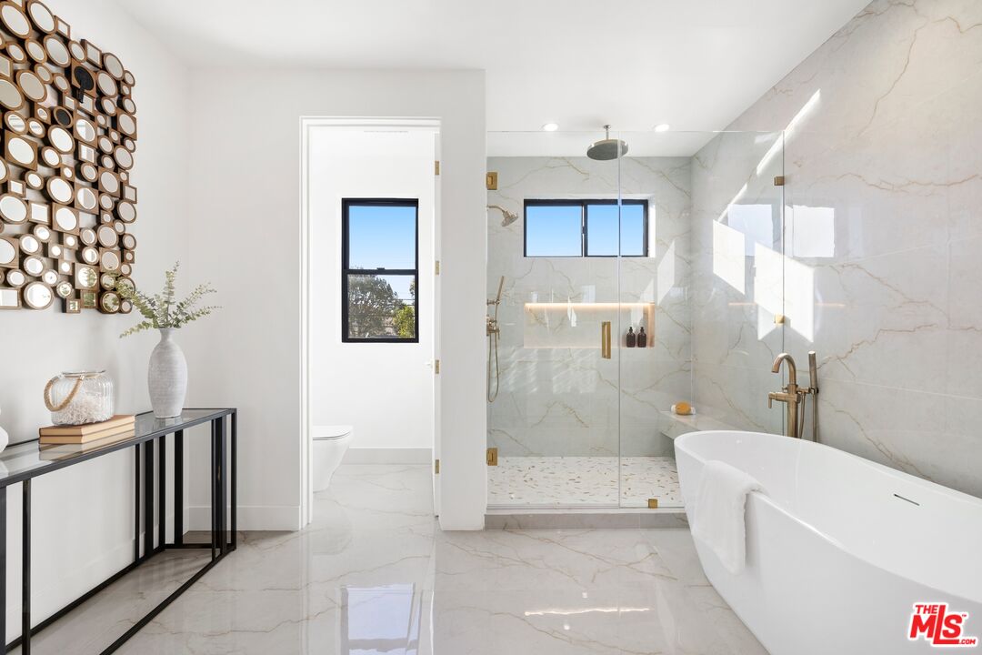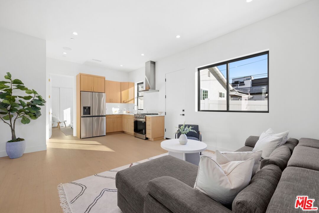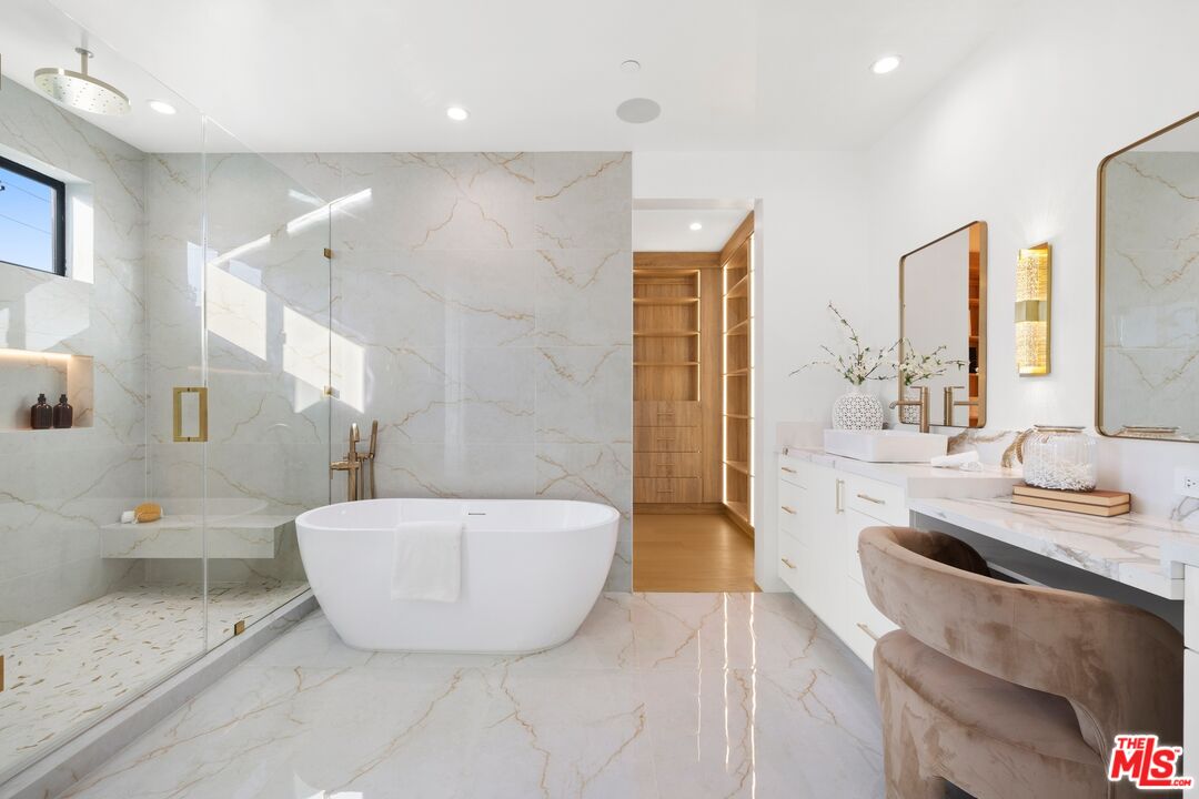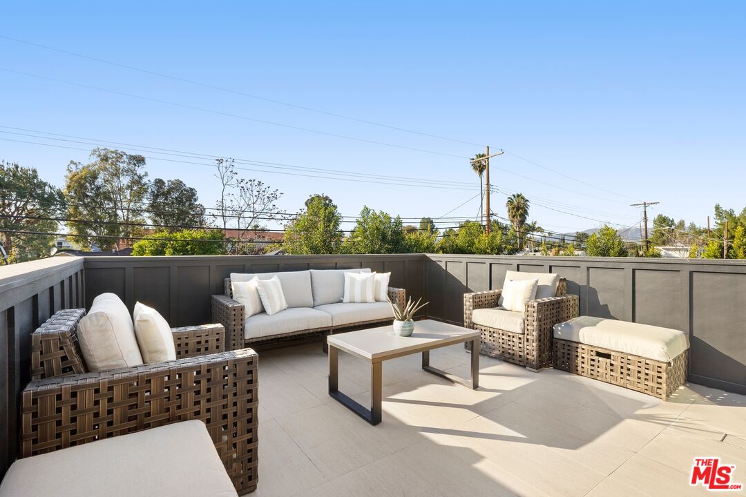 Nestled on a quiet, tree-lined street, experience modern luxury in this newly built Encino gem, where high-end finishes and impeccable design shine. The bright, open floor plan is flooded with natural light from soaring ceilings and expansive windows, creating an airy, inviting atmosphere. The sleek chef's kitchen, featuring an oversized island, custom cabinetry, and top-of-the-line appliances, flows effortlessly into the entertainer's backyard, complete with a built-in BBQ, bar seating, and lush grassy areas. Upstairs, the primary suite offers vaulted ceilings, a cozy fireplace, a walk-in closet, and a spa-like bathroom with a soaking tub, walk-in shower, dual vanity, and a private balcony. Two additional en-suite bedrooms complete the upper level. A spacious attached two-bedroom ADU adds versatility, perfect for guests or a home office. Modern upgrades include a smart home system, surround sound, and security cameras. This home is located minutes from Encino's top dining, shopping, and schools, offering you the ultimate in convenience and quality living.