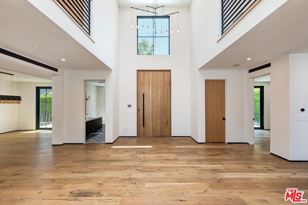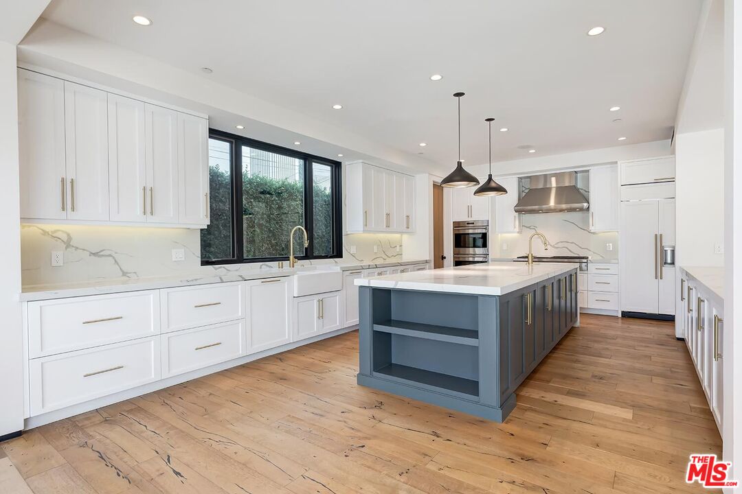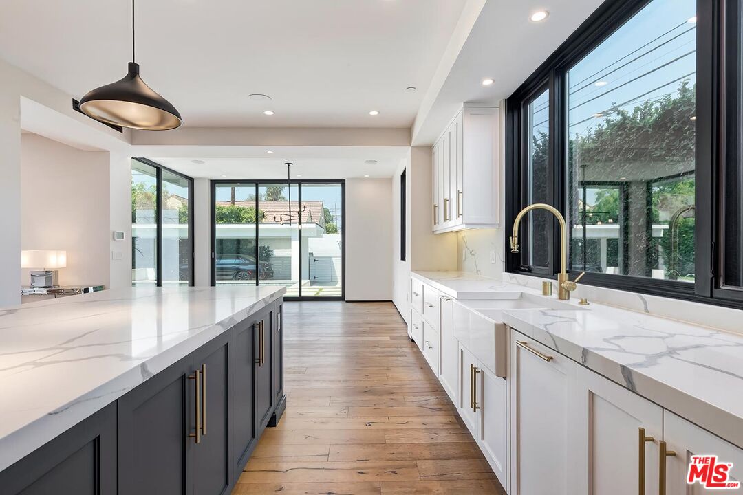 Built in 2017, this modern smart home in Beverly Grove blends sophisticated design with an open floor plan that defines contemporary California living. A dramatic 20-foot skylit entry floods the space with natural light, introducing sleek finishes, soaring ceilings, and wide-plank hardwood floors that flow throughout. The great room concept connects all the main living areas - private front office with patio, spacious family room with fireplace, inviting living room, open gourmet kitchen, and sunlit breakfast area - creating an effortless sense of space. The chef's kitchen is a true showpiece, featuring a large center island with bar seating, Sub-Zero side-by-side refrigerator/freezer, professional Wolf six-burner range with griddle, dual ovens, microwave drawer, and Bosch dishwasher. A wall of floor-to-ceiling glass pocket doors opens to a private backyard oasis with sparkling pool, grassy play area, and built-in grill - perfect for large-scale entertaining, intimate gatherings, or quiet evenings at home. Upstairs, the grand primary suite offers a fireplace, balcony overlooking the yard, custom walk-in closet, and spa-inspired bath with floating vanity, multi-head shower, and freestanding tub. Three additional en-suite bedrooms and an upstairs laundry room provide comfort and convenience.