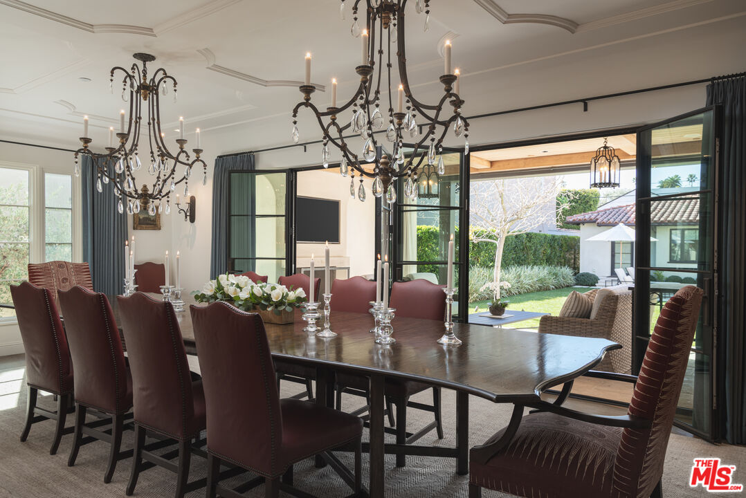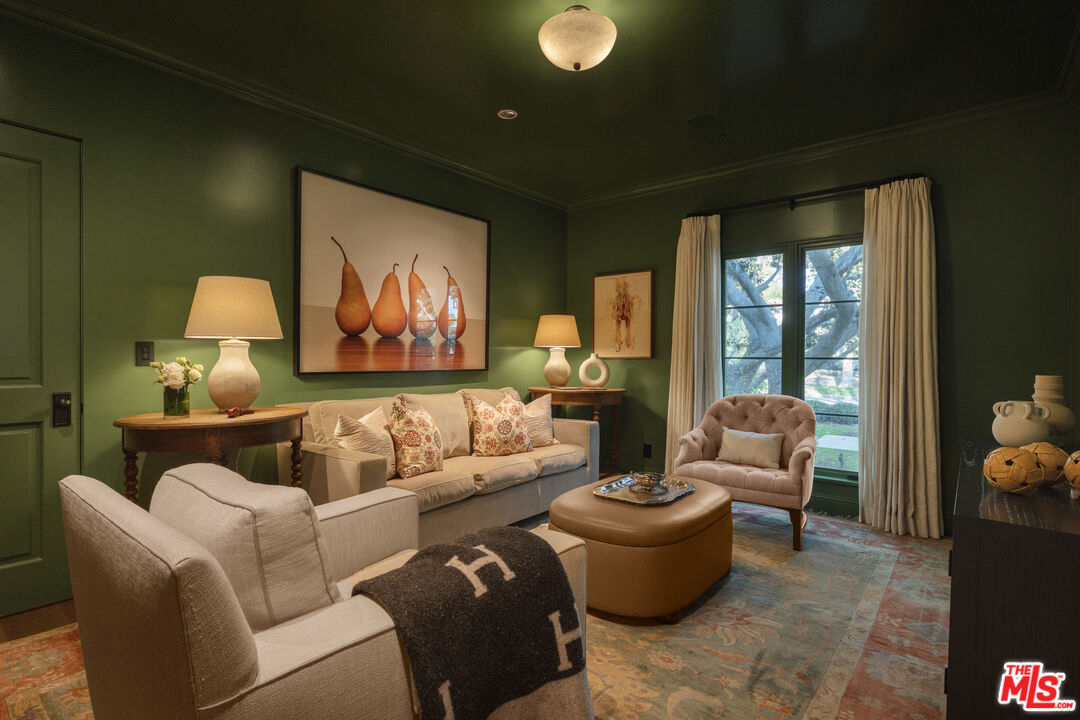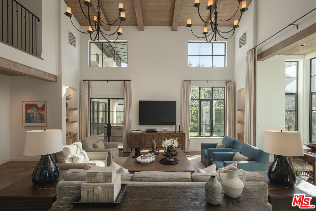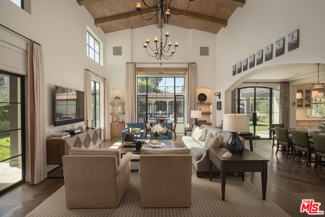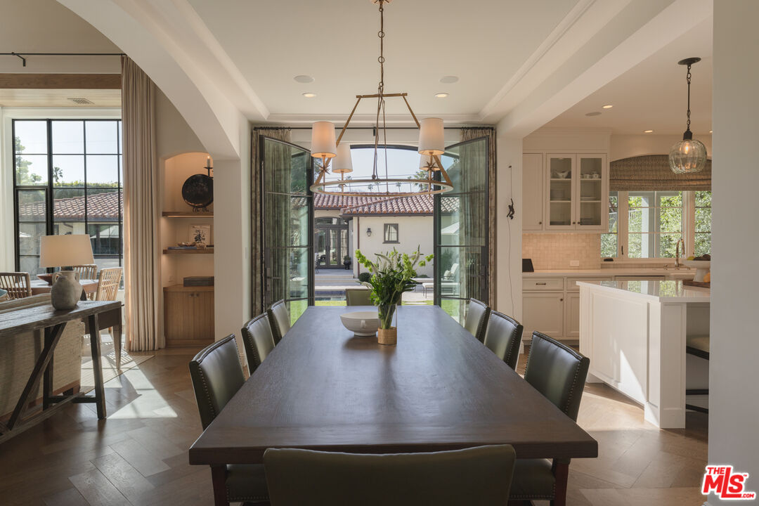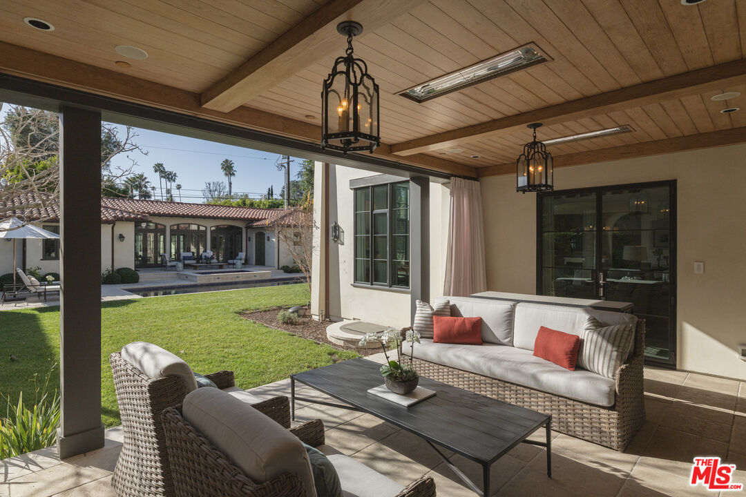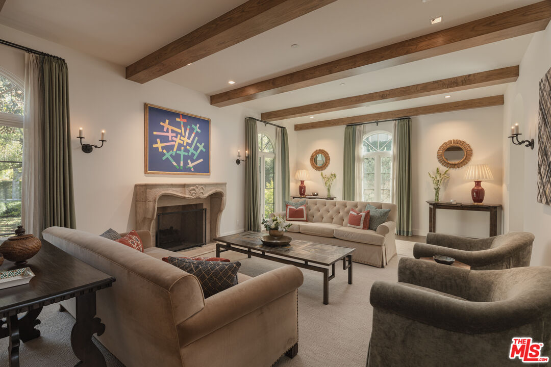 The coveted address is only the beginning of the story. Completed in early 2020, this 1926 Spanish estate underwent a comprehensive, design-forward renovation, including the addition of nearly 3,500 square feet, transforming a lovely residence into a contemporary masterpiece. The soul and character of the original home remain intact, while the aesthetics, infrastructure, and systems have been thoughtfully renewed to deliver every modern luxury and convenience. Design details include herringbone patterned European Oak flooring, wood beamed and finished ceilings, contemporary hand forged wrought iron stairwell bannisters, and perfectly balanced marble and moroccan tile accents, The entry level welcomes you with a warm foyer featuring harlequin-patterned honed marble flooring, leading to gracious formal living and dining rooms. The home's heart is the expansive family room, highlighted by double height beamed ceilings with dual iron chandeliers, opening to the center-island kitchen, supported by a dining area, walk-in pantry, mudroom, and butler's pantry. A main-level library sits adjacent to an en-suite bedroom, perfectly suited for a guest or in-law suite. There is also a powder room for the service of guests. Ascend the staircase to a gracious landing with a Juliet balcony overlooking the family room below. The primary suite is a private retreat, offering a separate office, generous dressing room, and a beautifully appointed bath with a large balcony. Two additional en-suite bedrooms, ample storage, and a generous laundry room complete the upper level. The newly added lower level is designed for relaxation and entertaining, featuring a lounge with a Moroccan tileadorned bar, luxe home theater, meditation room offering great flex space, and powder room. The nearly 1,000 s.f. guest house includes an open living area currently outfitted for as a gym, an en-suite bedroom, kitchenette, and a small laundry area. Outdoor living is equally exceptional, with covered heated patios, fireplace, built-in barbecue area, pool and spa, and an outdoor shower. With countless design details and infrastructure upgrades throughout, this is a rare, turnkey opportunity on what most regard as the best street in The Beverly Hills flats.