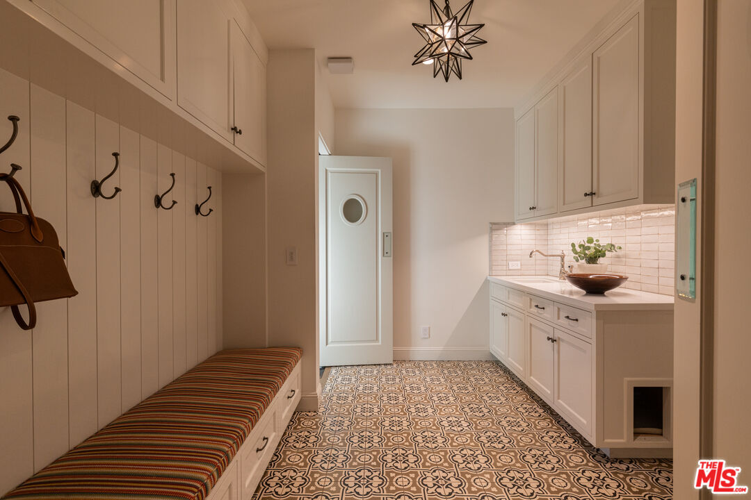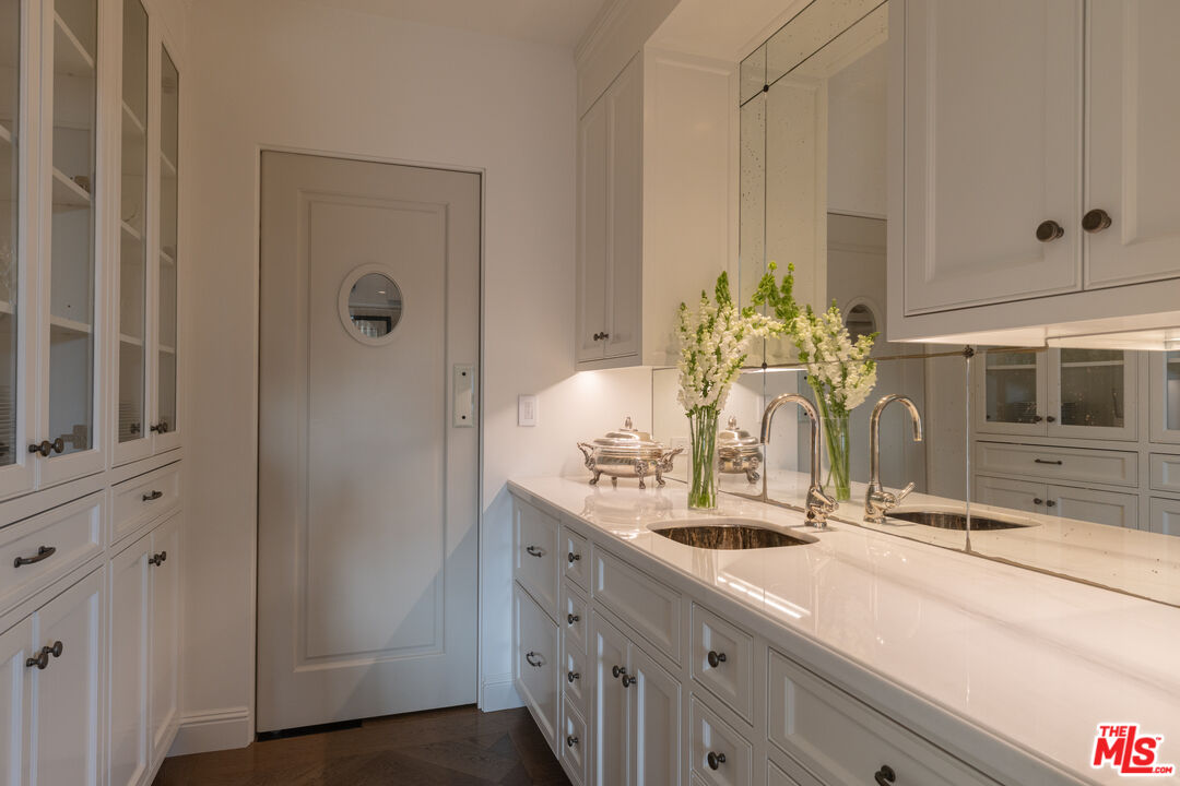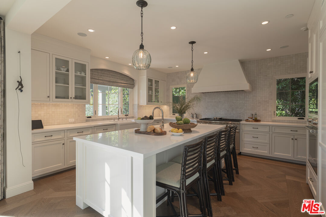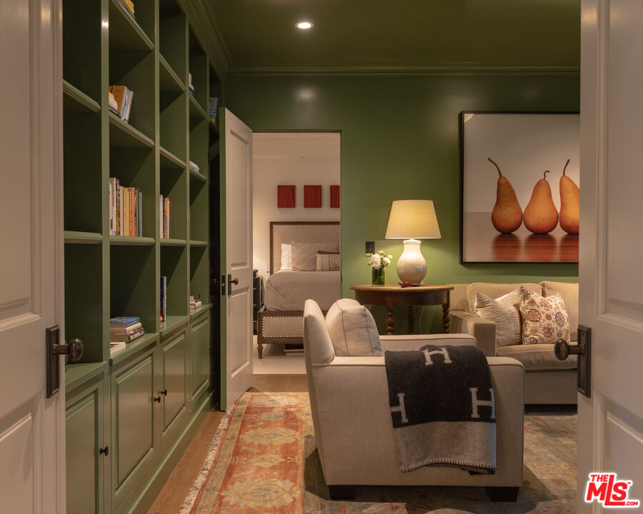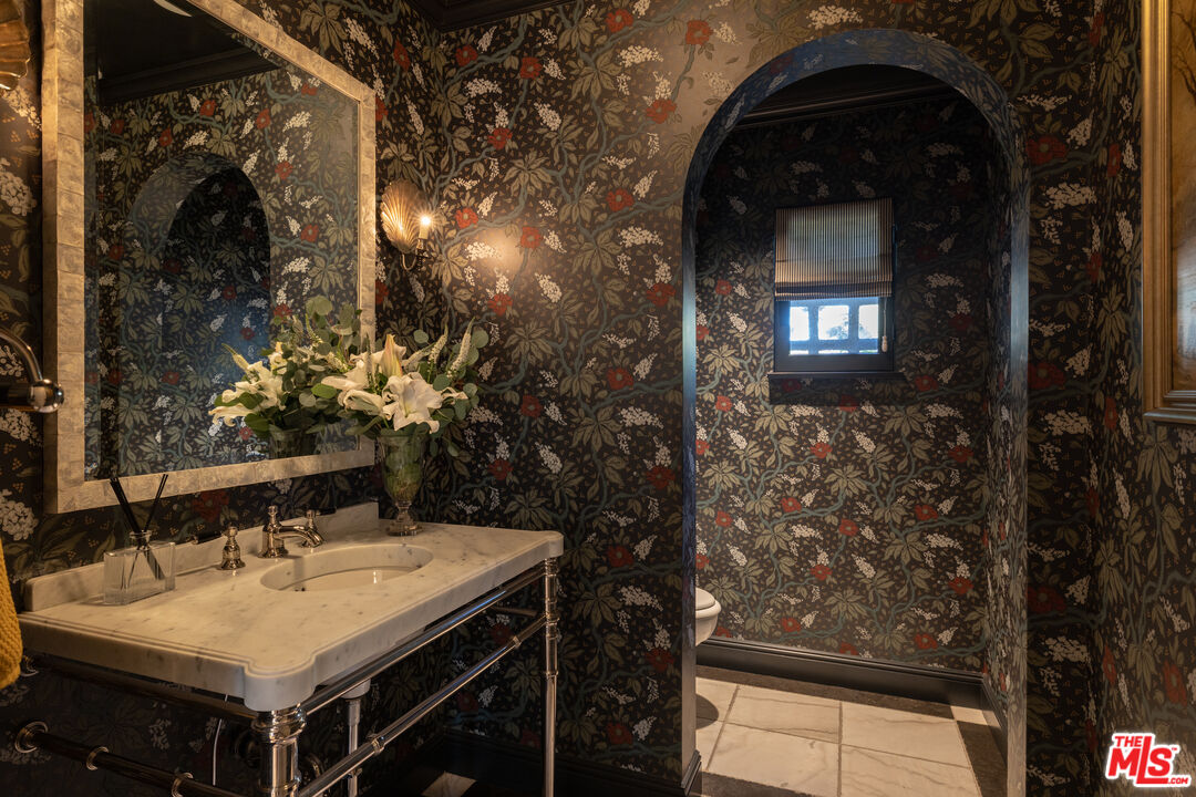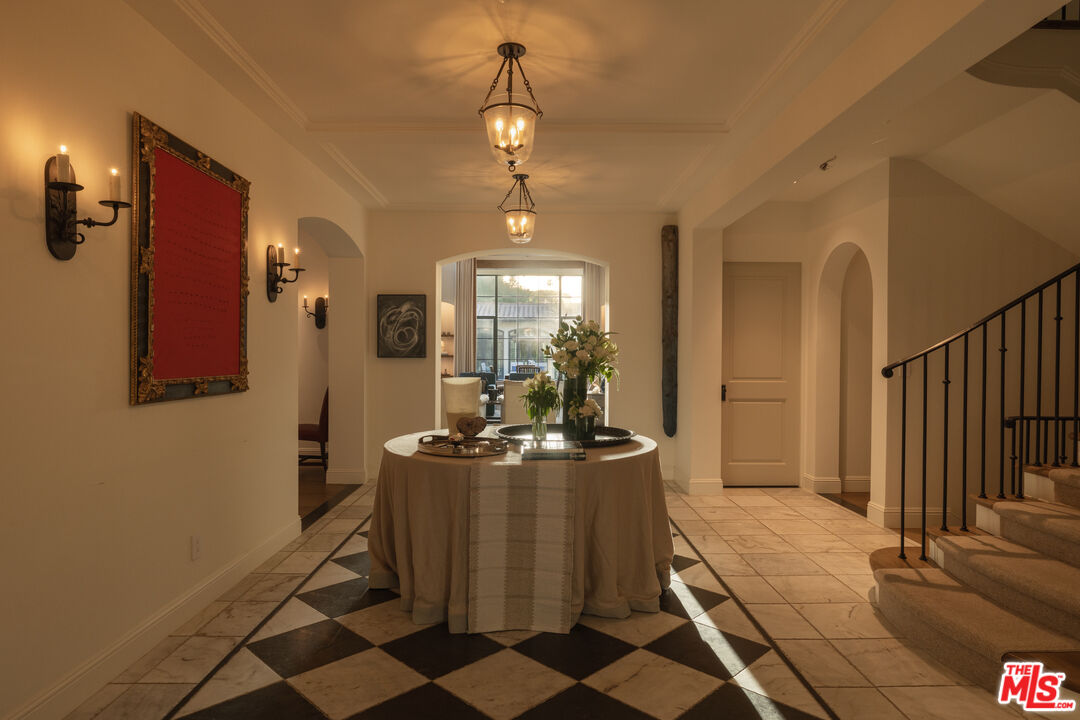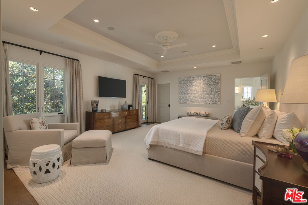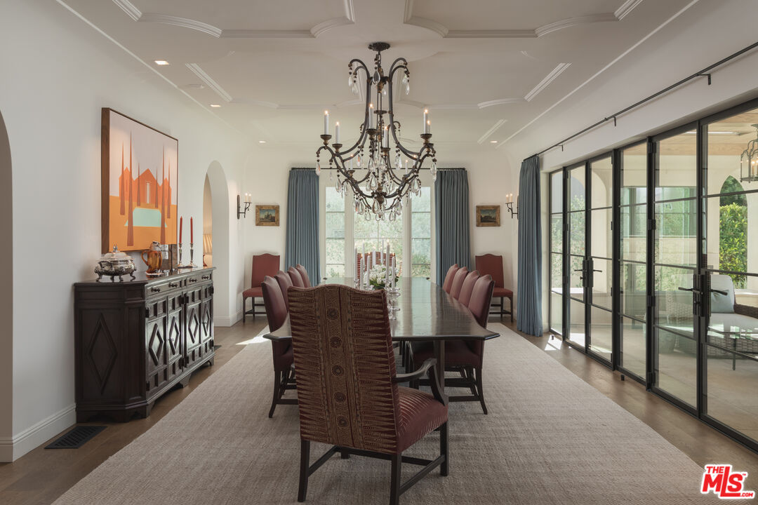 The coveted address is only the beginning of the story. Completed in early 2020, this 1926 Spanish estate underwent a comprehensive, design-forward renovation, including the addition of nearly 3,500 square feet, transforming a lovely residence into a contemporary masterpiece. The soul and character of the original home remain intact, while the aesthetics, infrastructure, and systems have been thoughtfully renewed to deliver every modern luxury and convenience. Design details include herringbone patterned European Oak flooring, wood beamed and finished ceilings, contemporary hand forged wrought iron stairwell bannisters, and perfectly balanced marble and moroccan tile accents, The entry level welcomes you with a warm foyer featuring harlequin-patterned honed marble flooring, leading to gracious formal living and dining rooms. The home's heart is the expansive family room, highlighted by double height beamed ceilings with dual iron chandeliers, opening to the center-island kitchen, supported by a dining area, walk-in pantry, mudroom, and butler's pantry. A main-level library sits adjacent to an en-suite bedroom, perfectly suited for a guest or in-law suite. There is also a powder room for the service of guests. Ascend the staircase to a gracious landing with a Juliet balcony overlooking the family room below. The primary suite is a private retreat, offering a separate office, generous dressing room, and a beautifully appointed bath with a large balcony. Two additional en-suite bedrooms, ample storage, and a generous laundry room complete the upper level. The newly added lower level is designed for relaxation and entertaining, featuring a lounge with a Moroccan tileadorned bar, luxe home theater, meditation room offering great flex space, and powder room. The nearly 1,000 s.f. guest house includes an open living area currently outfitted for as a gym, an en-suite bedroom, kitchenette, and a small laundry area. Outdoor living is equally exceptional, with covered heated patios, fireplace, built-in barbecue area, pool and spa, and an outdoor shower. With countless design details and infrastructure upgrades throughout, this is a rare, turnkey opportunity on what most regard as the best street in The Beverly Hills flats.