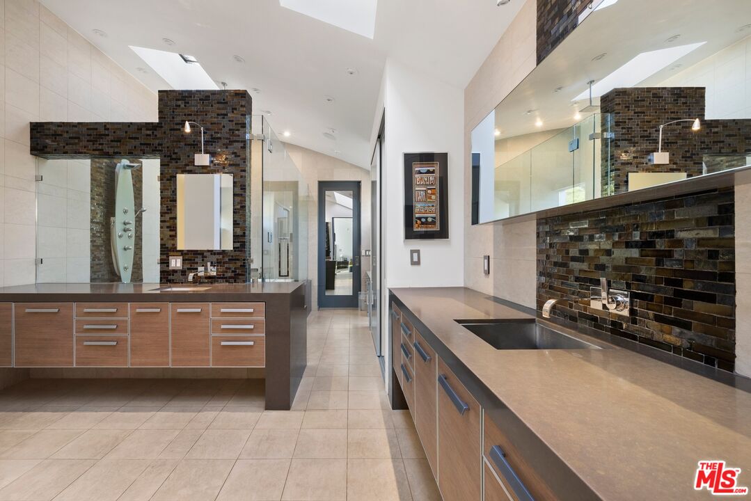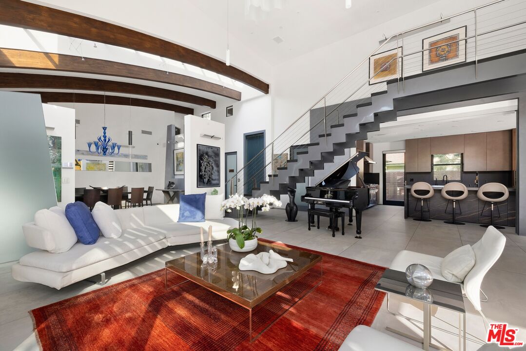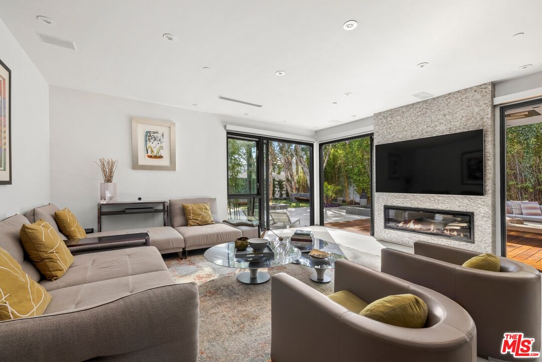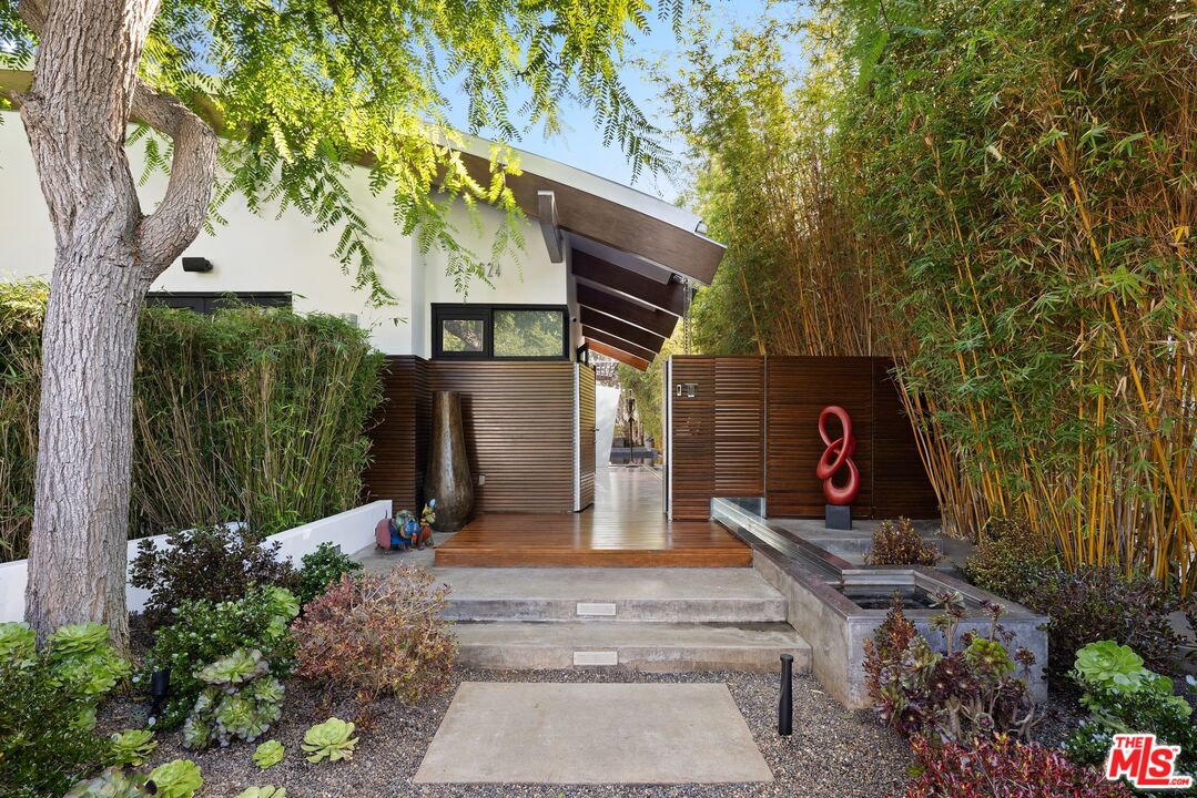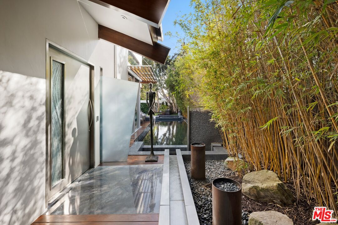 Concealed from the street by lush landscaping and mature trees, this exquisite contemporary entertainer's compound offers a variety of modern amenities and a private, zen lifestyle in a coveted North of Montana neighborhood. Guests arrive past a variety of plantings, art pieces, and calming water feature, unaware of the many surprises that await. Inside, floor-to-ceiling picture windows and sliding glass invite natural light into the formal living room with its lofty double-height ceilings, exposed wood beams, dramatic staircase, and wet bar. A pocket door retreats to provide seamless flow into the outdoor living room with built-in heating, decorative fireplace, and fire pit adjacent to the sparkling black-bottom pool and spa. Designed with quintessential California living top of mind, the nearby formal dining room also opens to the home's peaceful bamboo-lined grounds. The custom Italian chef-grade kitchen is complete with state-of-the-art appliances including Wolf range with pot filler and Miele warming drawer as well as a retractable flat screen and waterfall island. The adjacent family room also opens to the outside and features a massive 115-inch TV. The primary suite includes a large Vegas hotel-inspired bathroom with two large vanities, steam shower, and jetted tub plus an en-suite office. Secondary bedrooms and bathrooms are light-filled and have modern finishes. In the backyard, discover a spectacular two-story converted garage that can house vehicles or be used as a rec room, billiards, and more. On its second level is a gym, yoga, or artist's studio plus rainwater shower and an oversized glass-encased steam room. There is also a built-in barbecue and outdoor dining, a large amount of patio space, and a sitting area with a second fire pit for evening conversation. Welcome to this prime location near the Brentwood Country Club and Country Mart, just moments to the area's top-rated restaurants, schools, parks, golf courses, shopping, and world-class beaches.