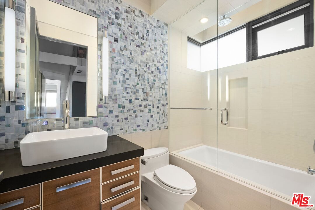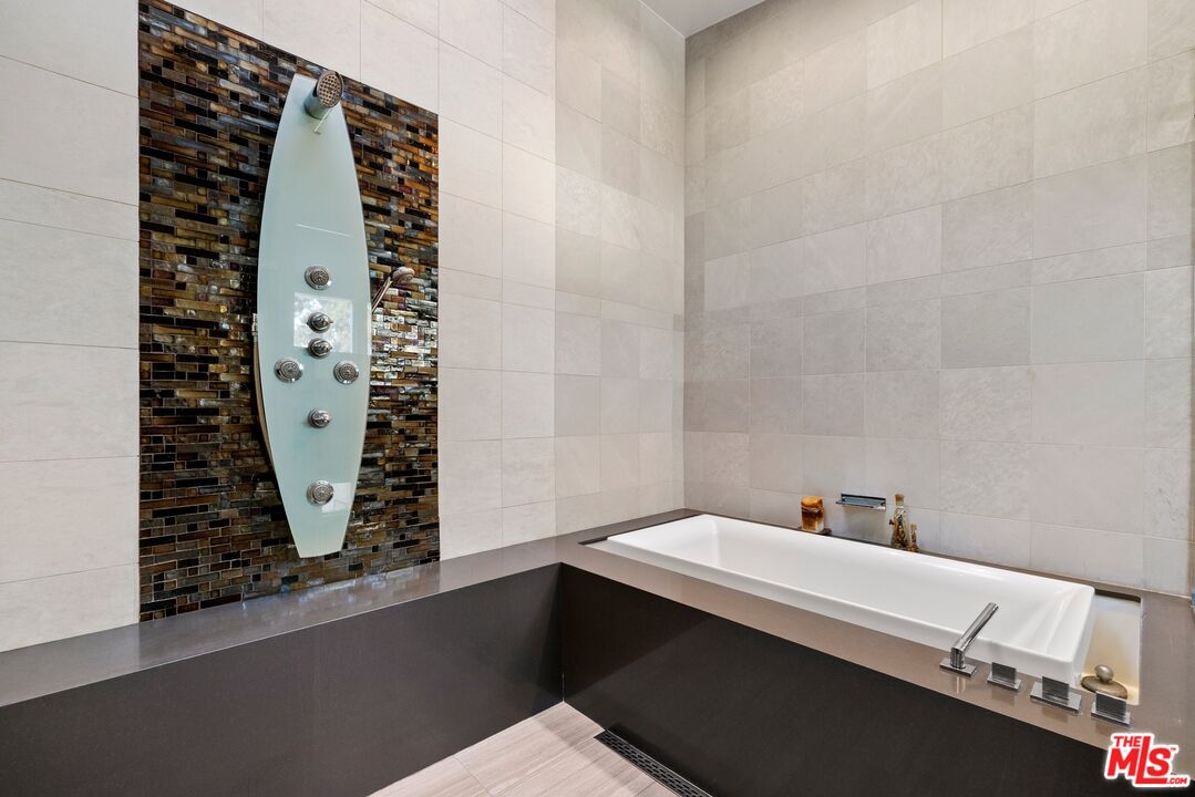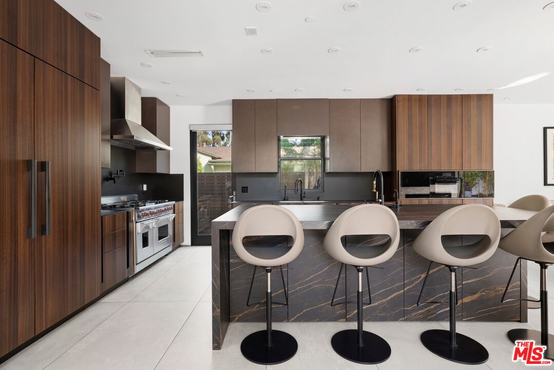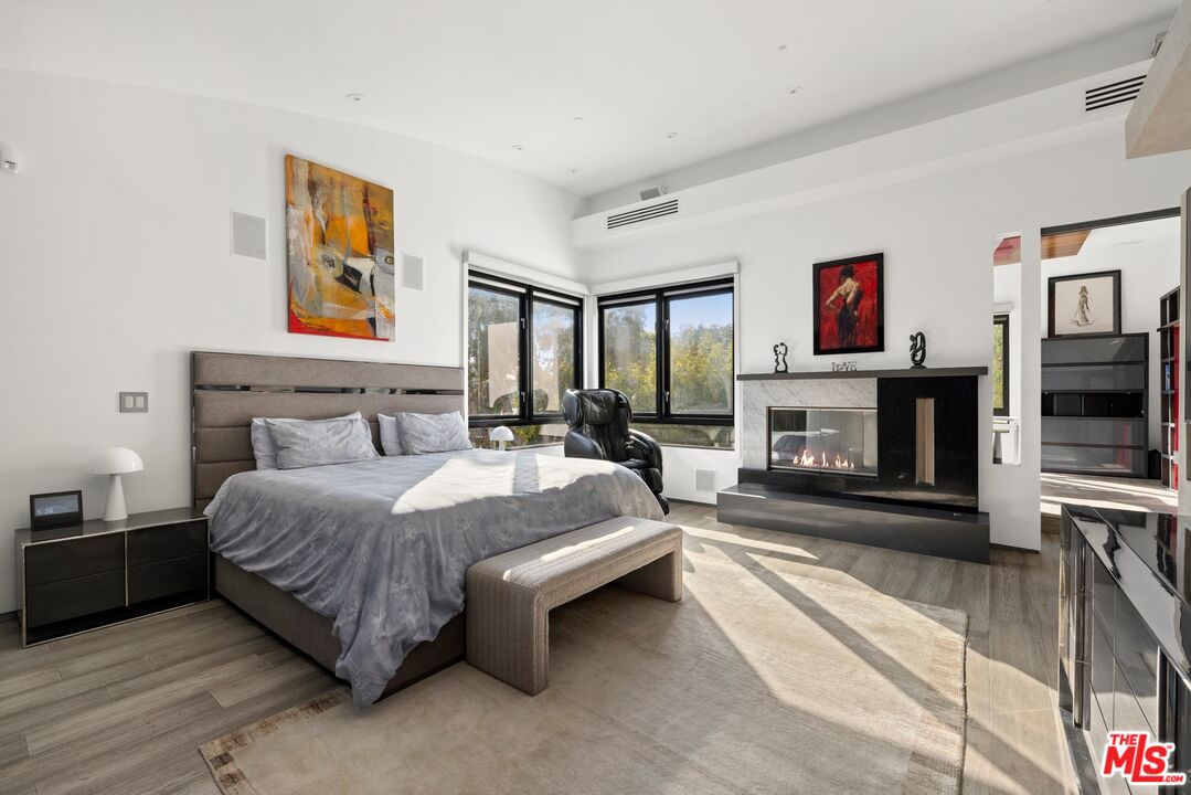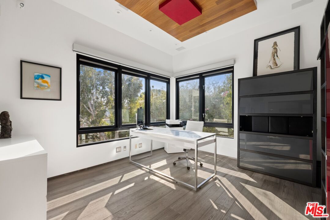 Concealed from the street by lush landscaping and mature trees, this exquisite contemporary entertainer's compound offers a variety of modern amenities and a private, zen lifestyle in a coveted North of Montana neighborhood. Guests arrive past a variety of plantings, art pieces, and calming water feature, unaware of the many surprises that await. Inside, floor-to-ceiling picture windows and sliding glass invite natural light into the formal living room with its lofty double-height ceilings, exposed wood beams, dramatic staircase, and wet bar. A pocket door retreats to provide seamless flow into the outdoor living room with built-in heating, decorative fireplace, and fire pit adjacent to the sparkling black-bottom pool and spa. Designed with quintessential California living top of mind, the nearby formal dining room also opens to the home's peaceful bamboo-lined grounds. The custom Italian chef-grade kitchen is complete with state-of-the-art appliances including Wolf range with pot filler and Miele warming drawer as well as a retractable flat screen and waterfall island. The adjacent family room also opens to the outside and features a massive 115-inch TV. The primary suite includes a large Vegas hotel-inspired bathroom with two large vanities, steam shower, and jetted tub plus an en-suite office. Secondary bedrooms and bathrooms are light-filled and have modern finishes. In the backyard, discover a spectacular two-story converted garage that can house vehicles or be used as a rec room, billiards, and more. On its second level is a gym, yoga, or artist's studio plus rainwater shower and an oversized glass-encased steam room. There is also a built-in barbecue and outdoor dining, a large amount of patio space, and a sitting area with a second fire pit for evening conversation. Welcome to this prime location near the Brentwood Country Club and Country Mart, just moments to the area's top-rated restaurants, schools, parks, golf courses, shopping, and world-class beaches.