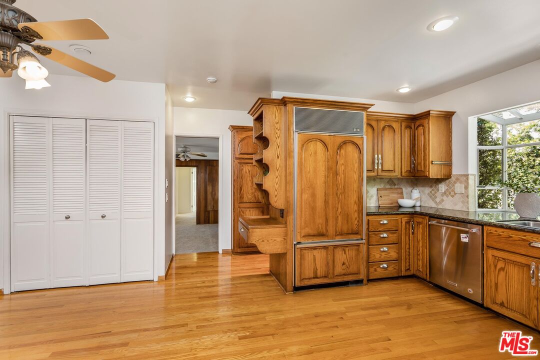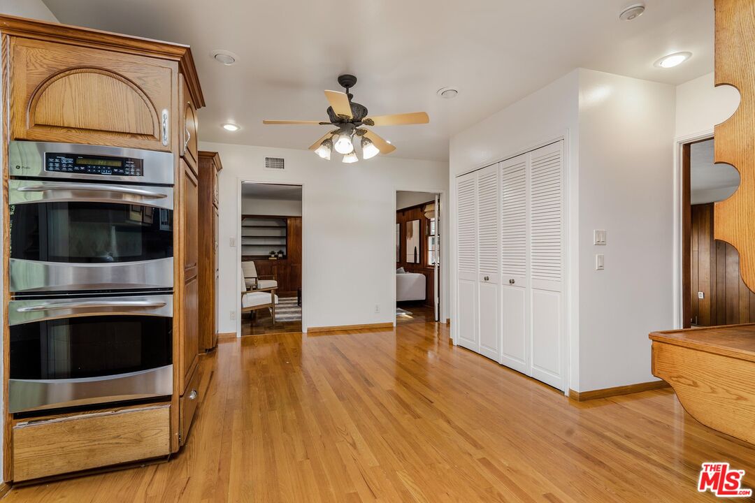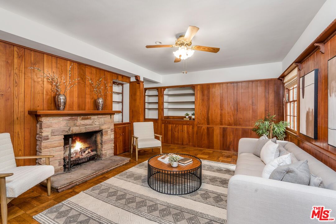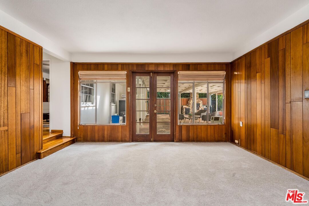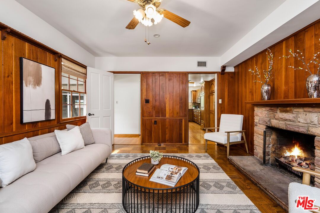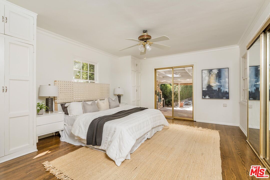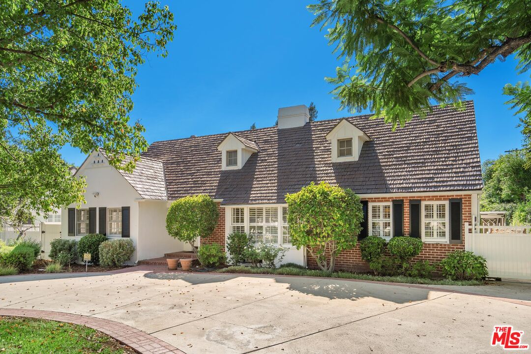 Set on one of Los Angeles' most filmed and picturesque streets, this timeless traditional residence in the sought-after Cameron Woods neighborhood pairs classic charm with expansive living spaces and an entertainer's dream backyard. This single-story estate offers 4BD/2.5BA across a thoughtfully designed floor plan, filled with natural light and warm hardwood floors. The expansive living room welcomes you with a marble fireplace and seamlessly connects to a dining nook with custom built-ins and charming windows. The well-appointed kitchen features a Miele electric cooktop, Sub-Zero refrigerator, and generous counter and cabinet space, complemented by a conveniently located powder room and direct access to the backyard. A versatile bonus living space with rich wood paneling and a second fireplace creates the perfect retreat for a cozy office or family room. Bedrooms are smartly arranged on opposite wings of the home, with the primary suite offering multiple walk-in closets and private access to the patio. A classic entertainment room with a vintage bar, brand new carpeting, and easy outdoor flow further enhances the home's appeal. The backyard is a true private oasis, complete with a covered lanai overlooking a sparkling pool, a built-in stone BBQ, and a detached studio ideal for an office, creative space, or additional storage. The expansive grounds also provide excellent potential for an ADU. Additional highlights include a gated two-car carport and a fully paid, value-enhancing, and money-saving solar energy system. Beyond its charm and functionality, the property also presents unique income potential through film production opportunities. Perfectly situated with convenient access to the 101 and 405 freeways and just moments away from Sherman Oaks Galleria, Costco, and premier dining in Sherman Oaks, this rare offering blends suburban tranquility with city connectivity.