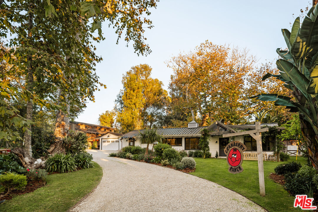 Nestled on a serene 1.86-acre estate in one of Malibu's most idyllic settings, Cranberry Farm offers unparalleled privacy and luxury. A long private driveway leads to a secluded compound featuring a charming three-bedroom main residence with a gourmet kitchen boasting rainbow onyx counters and top-tier appliances, sun-drenched living areas with a fireplace, heated hardwood floors throughout, and a lavish primary suite opening to lush grounds with a spa-like bath including a soaking tub, marble shower, and custom concrete double vanity. Complementing the main house is a versatile repurposed barn ideal for everyday living or entertaining, complete with soaring ceilings, a billiards area, open kitchen with oversized island, bar, lounging and media spaces, plus a peaceful loft bedroom with treetop views and ensuite bath. Additional highlights include a detached all-glass gym overlooking the grounds with outdoor sauna, cold plunge, and hot tub; a recording studio; permanent/mobile Airstream guest quarters; horse stables with riding area; bocce ball court; chicken coop; 4 car garage and expansive landscaped grounds with plentiful grassy lawns. The entire property is seamlessly integrated with a full Control 4 system, Lutron lighting, and Sonos audio for effortless modern living.