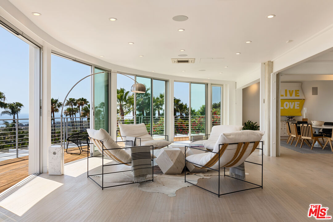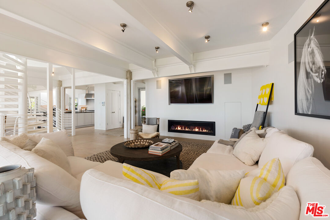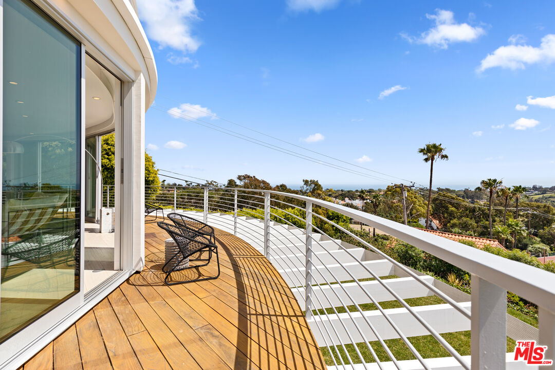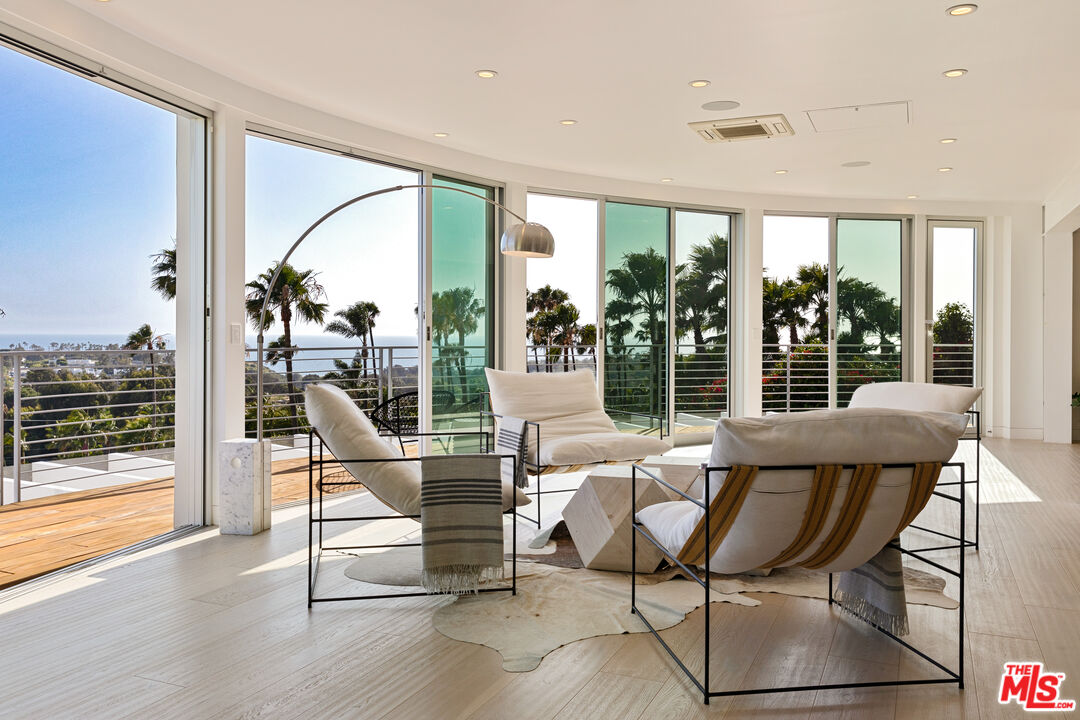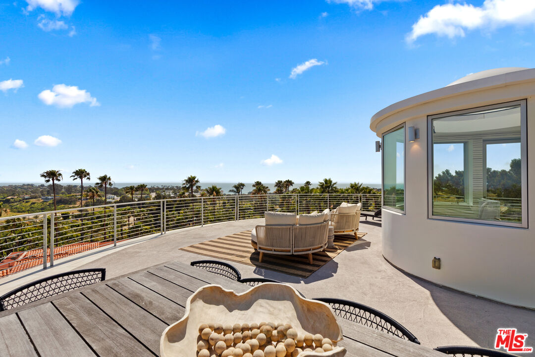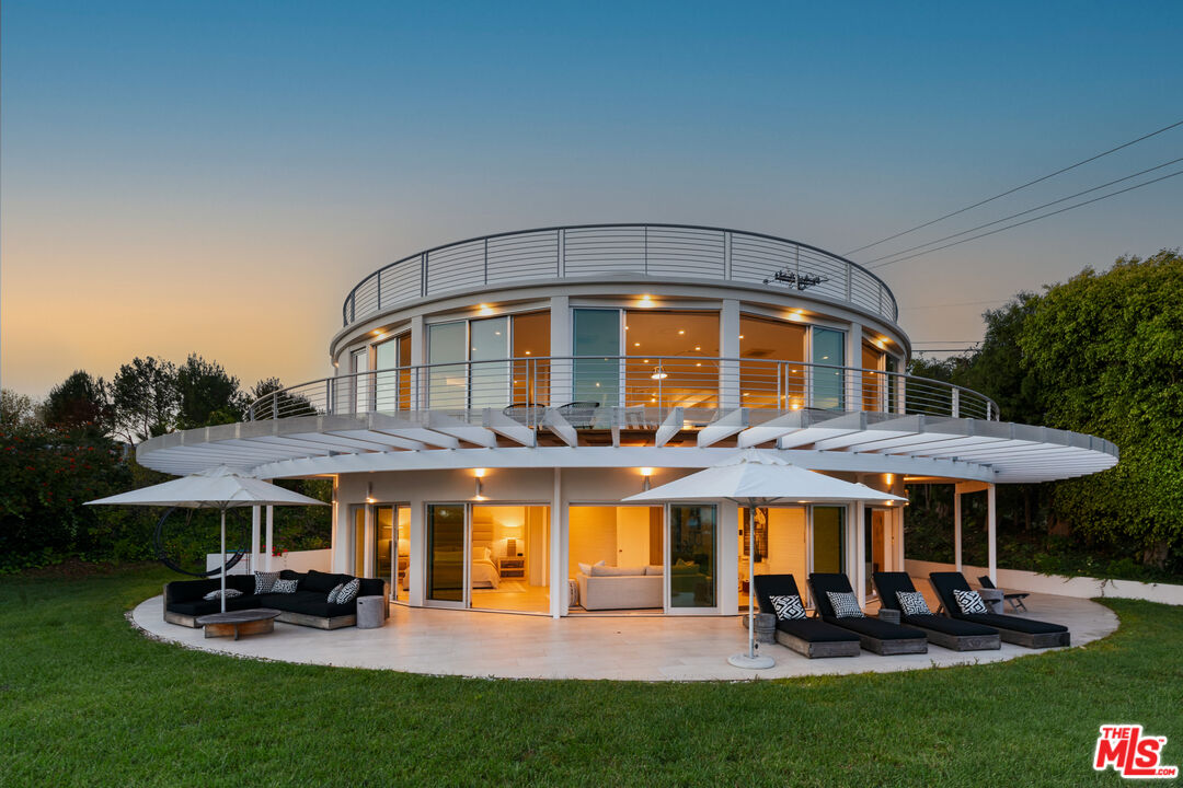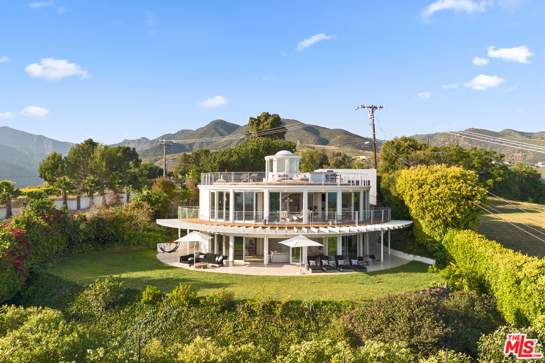 Presenting the Malibu Water Tower House - an iconic architectural residence where history, design, and panoramic ocean and mountain views converge. Originally constructed as a Malibu water tower and later transformed in the early 1980s by renowned local architect Doug Rucker, the home retains its distinctive cylindrical form while adapting seamlessly to modern living. The result is a rare example of sculptural architecture that feels both timeless and uniquely Malibu. Set at the end of a quiet cul-de-sac within the exclusive gated Cavalleri enclave, the property offers privacy and a true sense of retreat, with convenient trail access and a central location just minutes from Malibu's top beaches, markets, schools, restaurants, and local amenities. Completely renovated, the interiors feature a clean, modern aesthetic with warm natural materials. White Oak floors, curated designer finishes, and a central spiral staircase define the space, while walls of glass open to two wraparound decks, creating effortless indoor-outdoor flow. The main level unfolds as an open-concept great room, where the living and dining areas connect to a refined yet functional kitchen equipped with Miele appliances, Labradorite stone countertops, a gas range with dual ovens, and a large island with bar seating. Upstairs, the rooftop deck captures 360-degree unobstructed views from the Santa Monica Pier to Palos Verdes and Catalina Island, extending to the whitewater at Point Dume. Downstairs, the primary suite offers a private ocean-view retreat with a lounge area, motorized drop-down television, walk-in closet, and a spa-like bath with a free-standing porcelain soaking tub and dual rain steam shower. Two additional en-suite bedrooms and a separate one-bedroom, one-bath guest suite provide flexibility for guests, a workspace, or creative use. A generous grassy lawn wraps the home, with plans available for a pool. Additional features include a full-home Sonos system, remote-controlled blackout shades, two-car garage, driveway parking, and a laundry room. This is a coveted opportunity to own one of Malibu's most recognizable architectural properties - move-in ready and available fully furnished.