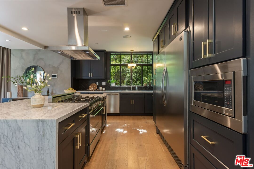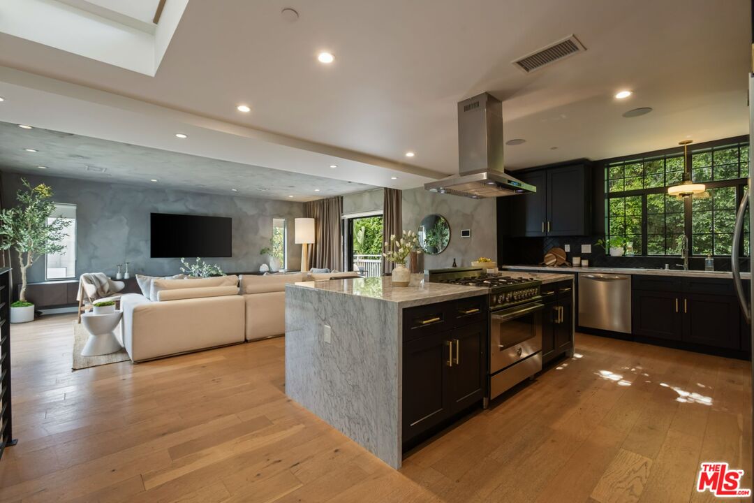 Nestled in the vibrant heart of West Hollywood, this recently remodeled Cape Cod-inspired residence offers a harmonious blend of timeless charm and contemporary luxury. Boasting four generously sized bedrooms and four meticulously designed bathrooms, the home provides ample space for both relaxation and entertainment. The gourmet kitchen stands as a testament to craftsmanship, featuring pristine white Carrara marble countertops, custom cabinetry, and top-of-the-line appliances, ensuring both functionality and elegance. An open-concept floor plan enhances the sense of space, with European hardwood floors flowing seamlessly throughout the main living areas. Exceptional privacy and security are hallmarks of this property, situated in a tranquil enclave yet within short distance to West Hollywood's vibrant dining, entertainment, and cultural attractions. A private rooftop deck presents breathtaking panoramic city light views, including the iconic Hollywood Sign, creating an ideal setting for dining or evening relaxation. The secluded backyard features an outdoor grill area, perfect for al fresco dining and entertaining guests. Two balconies one off the living room and another off the primary bedroom provide additional outdoor living spaces to enjoy the Southern California climate. A spacious, oversized two-car garage offers ample storage and convenience. The property is fully enclosed with a gated driveway and a charming walkway leading to the front door, ensuring both security and curb appeal. This residence epitomizes luxurious modern living, offering a serene retreat amidst the urban landscape. Whether you're seeking a peaceful sanctuary or an entertainer's haven, this home caters to every desire.