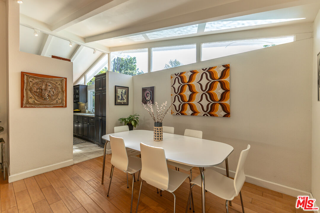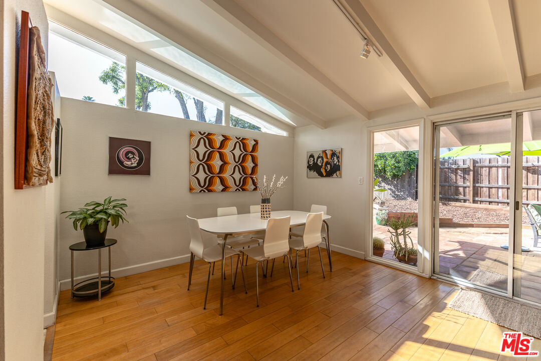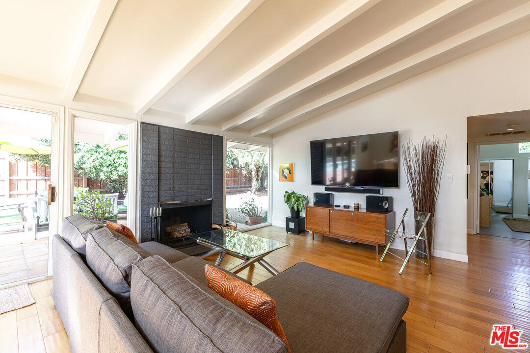 Located on a quiet cul-de-sac in the highly coveted Corbin Palms neighborhood, this exceptional Mid-Century Modern pool home was designed by renowned architects Dan Palmer & William Krisel, AIA, This architectural gem showcases classic MCM elements including dramatic clean lines, low-profile roofline, vaulted ceilings, clerestory windows, and an expansive wall of glass that flood the interiors with natural light while maintaining privacy and a seamless indoor-outdoor connection. The bright, open-concept living and dining areas feature vaulted beamed ceilings, maple flooring, wood-burning fireplace and oversized picture windows, creating a warm and inviting atmosphere throughout. Overhead clerestory windows provide abundant ambient light and enhance the home's airy feel. The kitchen is thoughtfully designed with granite countertops, stainless steel appliances, abundant cabinetry, and a convenient pull-out pantry. Just off the kitchen, an open den with custom built-in bookcases sits near the guest bath, creating a functional and inviting flex space. The primary suite offers an en-suite bath, a wall of closets, newer flooring, and clerestory windows for soft natural light. A spacious second bedroom overlooks the lush backyard and includes generous closet space and newer flooring. The fully fenced backyard is a true retreat, perfect for entertaining and embracing Southern California indoor-outdoor living. Enjoy a stunning pool, lounge area, and mature trees with drought tolerant landscaping that provide exceptional privacy. Additional features include a separate laundry room with access to both the garage and backyard, plus a small office located just off the garage ideal for working from home. Further highlights include central air and heat, copper plumbing, updated light fixtures, recessed lighting and timeless Mid-Century character throughout. Assessor showing 4BR + 2BA. Home is currently 2BR + 2BA. Ideally situated near the Haynes Street Greenway, with easy access to restaurants, shopping, bike paths, Westfield Topanga Village, Warner Center, and public transportation.