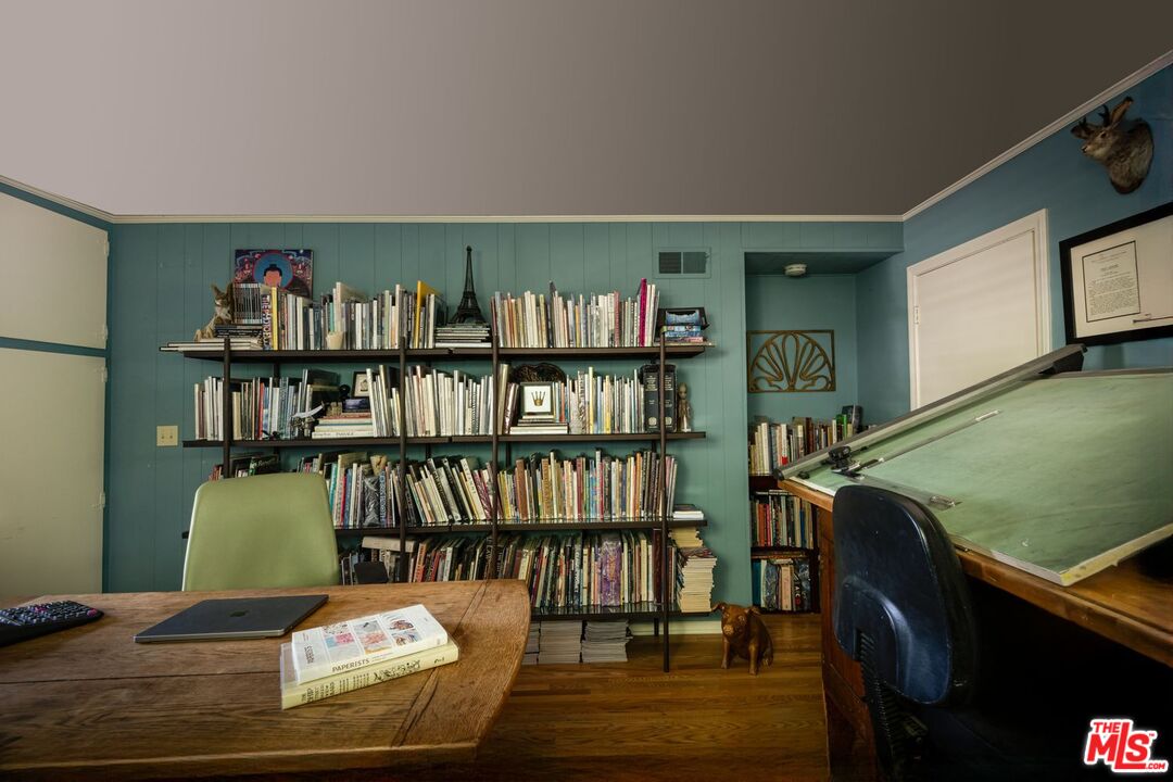 This exceptional 1942 Midvale Estates property, set on nearly half an acre, is a rare offering. Renowned as "Anywhere in the USA" due to its frequent film appearances, this picturesque street exudes timeless charm, while still being close to everything Los Angeles has to offer. A brick pathway winds through manicured gardens and past mature trees, leading to a formal entry. The sun-filled, spacious living room features a fireplace, built-in bookcases, and rich woodflooring. The elegant dining room, adorned with crown moldings, seamlessly connects to a large, spectacularly remodeled kitchen with ample counter space, built-in appliances, a walk-in pantry, and a newly built separate laundry/utility room with convenient garage access. The 2,728 sq ft main house boasts a large primary along with three additional bedrooms, all overlooking lush, private gardens. The inviting family room, complete with a fireplace, hidden bar, and woodfloors, opens onto custom decking designed around a majestic tree, featuring built-in seating, a new outdoor kitchen/BBQ, and offers an ideal space for entertaining. Expansive grassy areas provide ample room for recreation and relaxation after a dip in the sparkling pool. The property includes an approx additional 625 sqft (NOT included in overall amount listed above) detached studio with its own entrance, separate garden/patio spaces, a bedroom, living area, bath, kitchenette, and its own washer and dryer. This property is designed for ultimate comfort and efficiency, featuring many upgrades and new systems, including water heaters, HVAC with Nest, ductwork, insulation, main water line, parking structure, irrigation, solar power with remote monitoring, and pool equipment. Security is paramount, with new fencing, gates, Ring cameras, and security systems installed in both houses. This one-of-a-kind residence blends modern convenience with classic elegance, offering unparalleled comfort and sustainability in the heart of Midvale Estates.