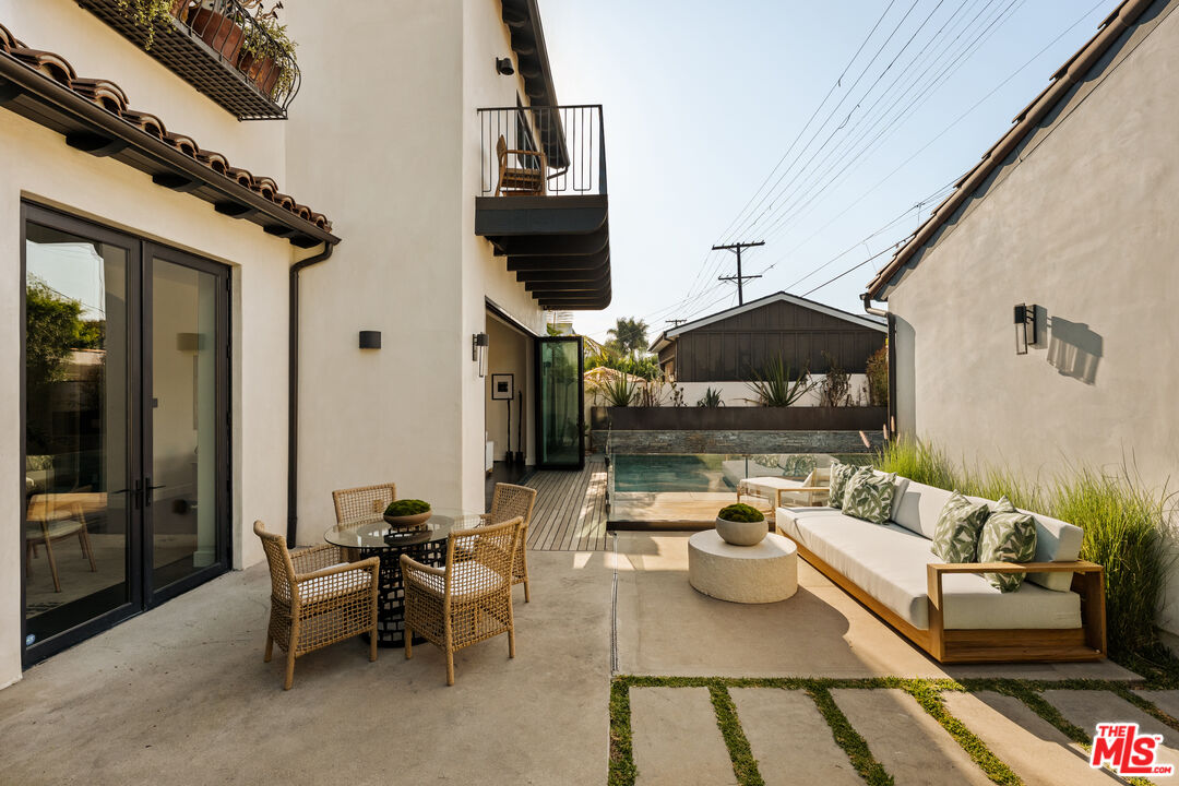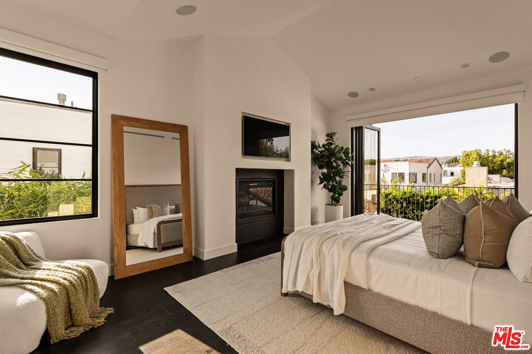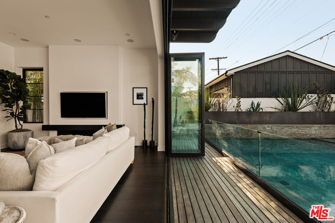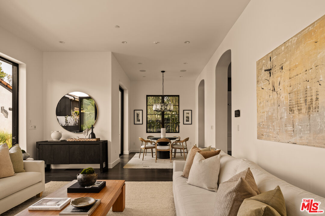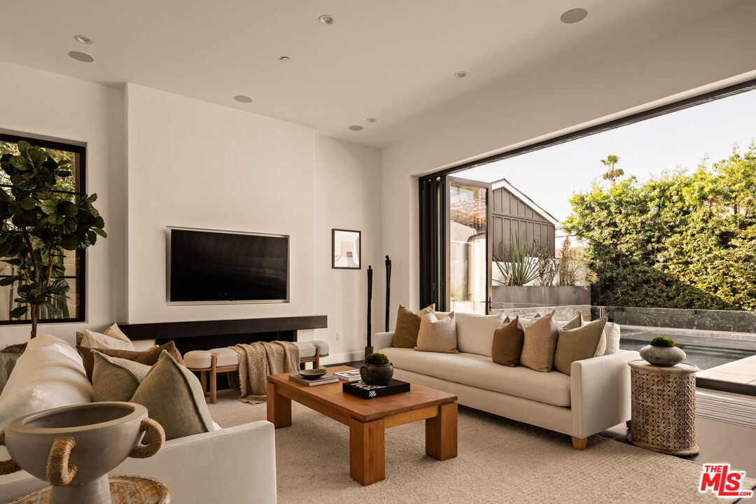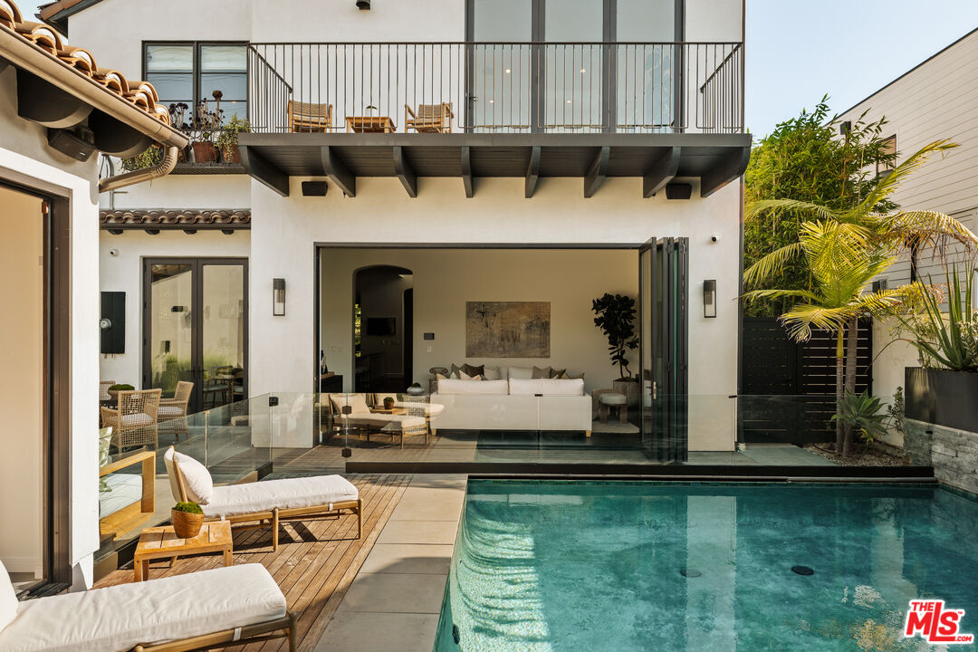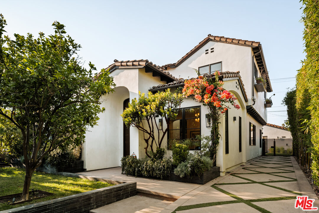 Tucked away on a coveted street in prime Beverly Grove, this Spanish inspired contemporary offers timeless character blended with modern comforts. Behind a gated entry, the 5 bedroom, 4.5 bathroom residence includes a newly built ADU ideal for guests, work from home, or additional income. A dramatic arched front door opens into a thoughtfully designed floor plan, where soaring ceilings, rich mahogany toned wood floors, and curated designer finishes echo the home's architectural roots. The formal living room features a statement fireplace, custom inlaid tile, and a storybook window that floods the space with natural light. The chef's kitchen is outfitted with Miele appliances, a marble waterfall island, and custom cabinetry, seamlessly connecting to an open-concept dining and family room. Additional luxuries include integrated speakers throughout, and a home security system. Floor to ceiling glass doors create a seamless indoor-outdoor flow to the private backyard oasis complete with a sparkling pool, spa, and lounge-ready patio. Professionally landscaped, the yard offers numerous upgrades such as custom pool lighting and recently installed safety fencing. Upstairs, the expansive primary suite offers a fireplace, private terrace with views of the Hollywood Hills, automated black-out blinds and a spa-inspired bath. Two additional upstairs bedrooms share a stylish Jack-and-Jill bath, while a guest suite downstairs offers privacy and flexibility. The ADU features a full kitchen and bathroom, ideal as a guest house, studio, or rental opportunity. Perfectly positioned in one of Los Angeles' most refined and walkable enclaves, this residence offers seamless access to nearby Melrose Avenue, The Grove, and the Beverly Center, along with a curated array of renowned restaurants, boutique shopping, and cultural landmarks. A rare offering that blends architectural character with an address defined by both elegance and ease.
