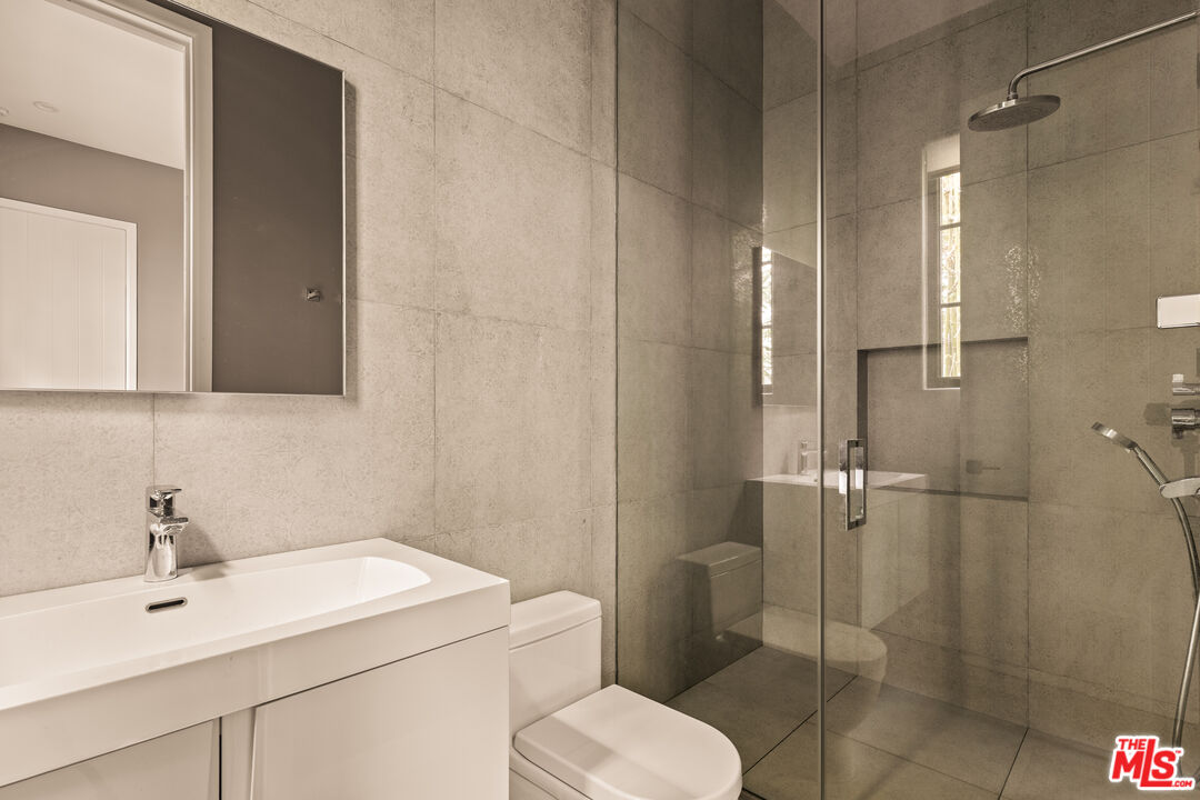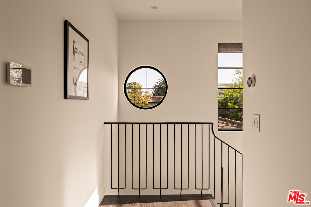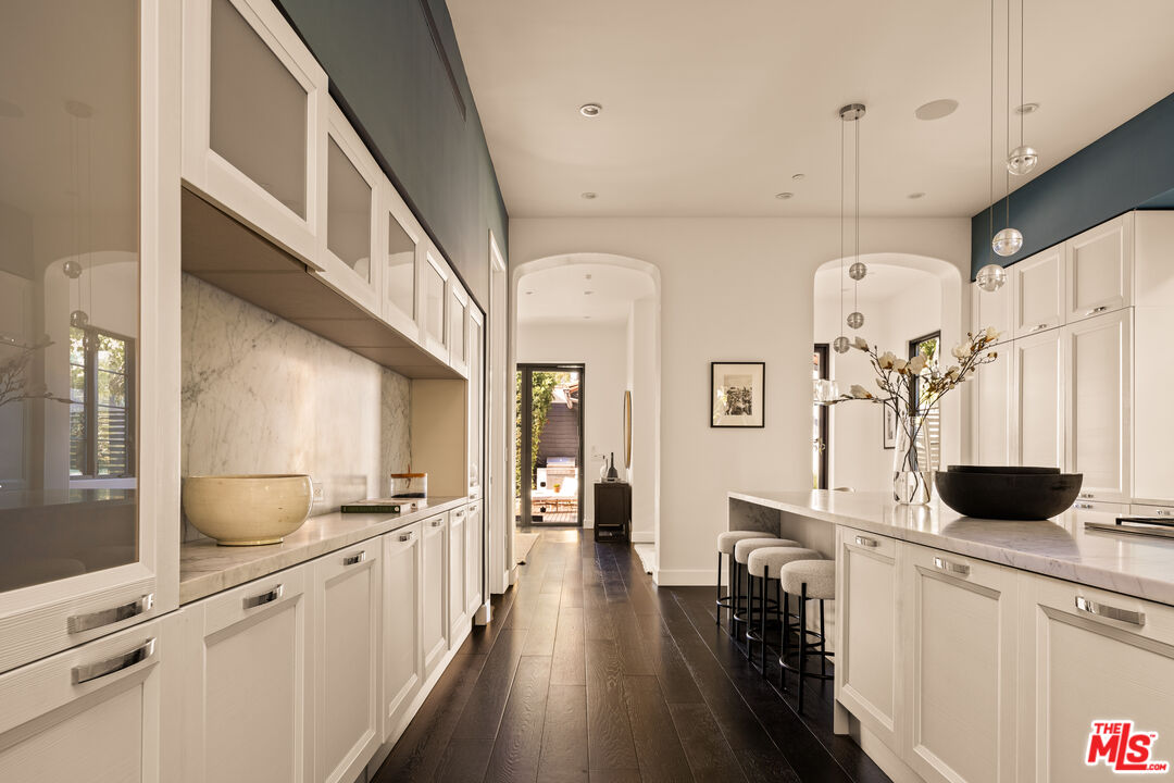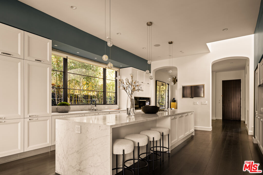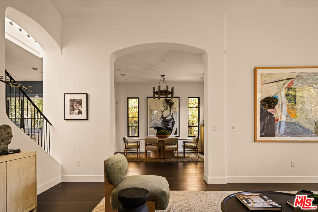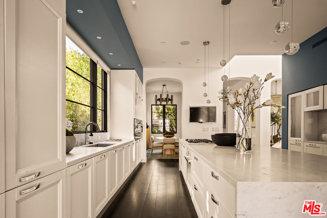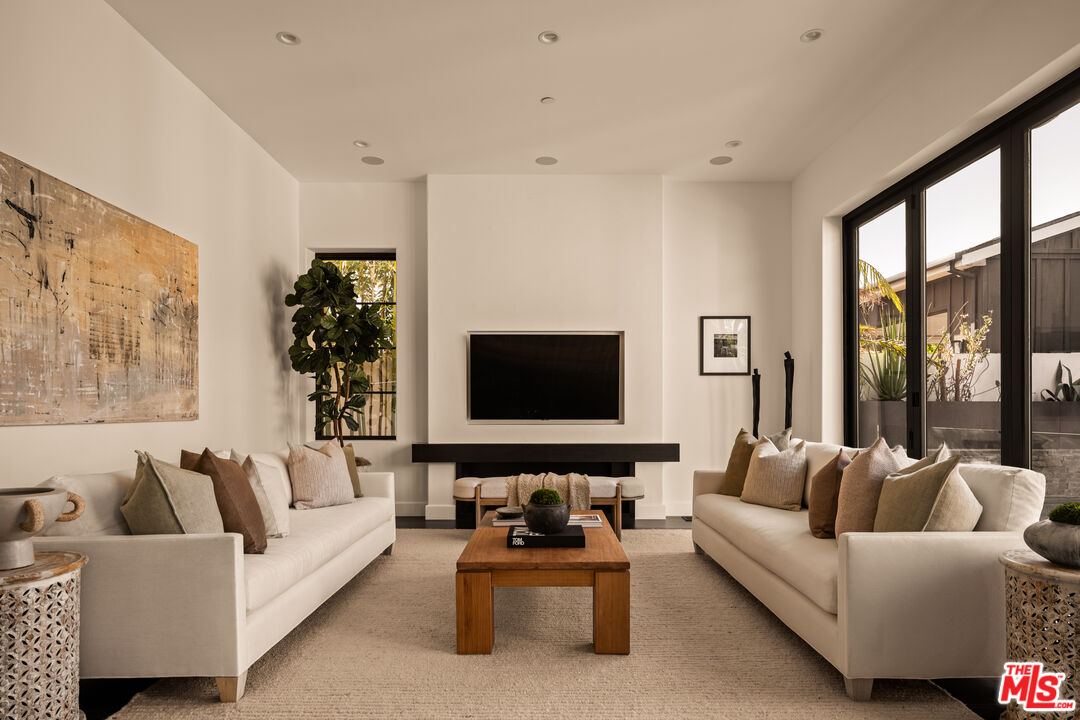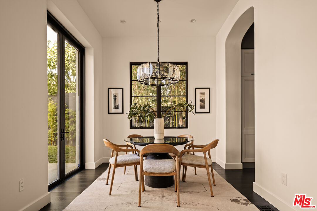 Tucked away on a coveted street in prime Beverly Grove, this Spanish inspired contemporary offers timeless character blended with modern comforts. Behind a gated entry, the 5 bedroom, 4.5 bathroom residence includes a newly built ADU ideal for guests, work from home, or additional income. A dramatic arched front door opens into a thoughtfully designed floor plan, where soaring ceilings, rich mahogany toned wood floors, and curated designer finishes echo the home's architectural roots. The formal living room features a statement fireplace, custom inlaid tile, and a storybook window that floods the space with natural light. The chef's kitchen is outfitted with Miele appliances, a marble waterfall island, and custom cabinetry, seamlessly connecting to an open-concept dining and family room. Additional luxuries include integrated speakers throughout, and a home security system. Floor to ceiling glass doors create a seamless indoor-outdoor flow to the private backyard oasis complete with a sparkling pool, spa, and lounge-ready patio. Professionally landscaped, the yard offers numerous upgrades such as custom pool lighting and recently installed safety fencing. Upstairs, the expansive primary suite offers a fireplace, private terrace with views of the Hollywood Hills, automated black-out blinds and a spa-inspired bath. Two additional upstairs bedrooms share a stylish Jack-and-Jill bath, while a guest suite downstairs offers privacy and flexibility. The ADU features a full kitchen and bathroom, ideal as a guest house, studio, or rental opportunity. Perfectly positioned in one of Los Angeles' most refined and walkable enclaves, this residence offers seamless access to nearby Melrose Avenue, The Grove, and the Beverly Center, along with a curated array of renowned restaurants, boutique shopping, and cultural landmarks. A rare offering that blends architectural character with an address defined by both elegance and ease.