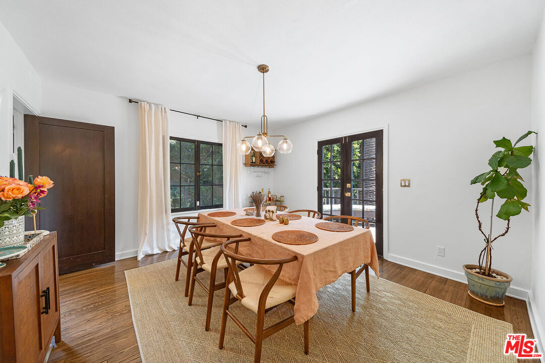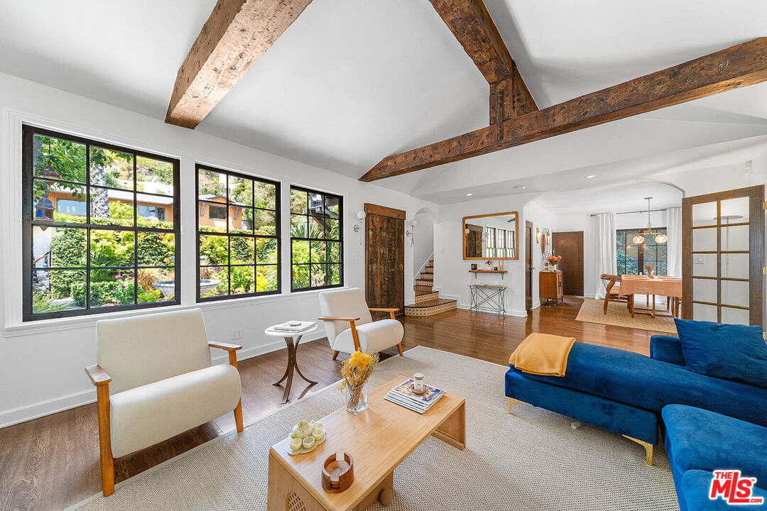 Private home in the heart of the city, nestled in the Hollywood Hills, offering the perfect blend of tranquil sanctuary and Old Hollywood Charm with convenient access. The beautifully landscaped gated courtyard encompasses a lush flower garden with a gorgeous patio and a classic stone fountain. Built in 1927, this artful home showcases incredible Spanish Revival design elements -- an original stained-glass window, Spanish tile throughout, and a classic fireplace. You'll pass through the intricately carved 18th-century wooden entryway, where you'll be engulfed by the spacious living room enhanced by a vaulted ceiling, dramatic beams, Moroccan lanterns, a striking fireplace, original hardwood floors, and a formal dining area. All that next to a tastefully renovated downstairs bathroom and an adjacent sun room with a library that opens up through two sets of French doors onto the private back patio. The kitchen has been updated and offers stainless steel appliances, including a six-burner designer Wolf range, combining modern convenience with classic elegance. Upstairs, you'll find two bedrooms, a cozy balcony, and one bath, providing a harmonious retreat. The rear yard is surrounded by mature hedges providing complete privacy. A native-plant garden, relaxing 8-person hot tub, larger-than-life Buddha fountain, and an additional deck create a meditative, shaded outdoor haven. Additionally, the home comes with two sizable, temperature-controlled, bonus spaces totaling 450 sq ft, reflected in the MLS sq ft, that can be used as bedrooms, studios, offices, or flex spaces. The location of this home offers central proximity to major studios, renowned restaurants, and vibrant nightlife. The picturesque Lake Hollywood Reservoir is a twenty-minute hike through the hills, with iconic entertainment venues such as the Hollywood Bowl and John Anson Ford Theatre within a short distance. This one-of-a-kind sanctuary in an idyllic Hollywood Hills neighborhood has some of the most elevated, inspired aesthetics you'll find in Los Angeles!